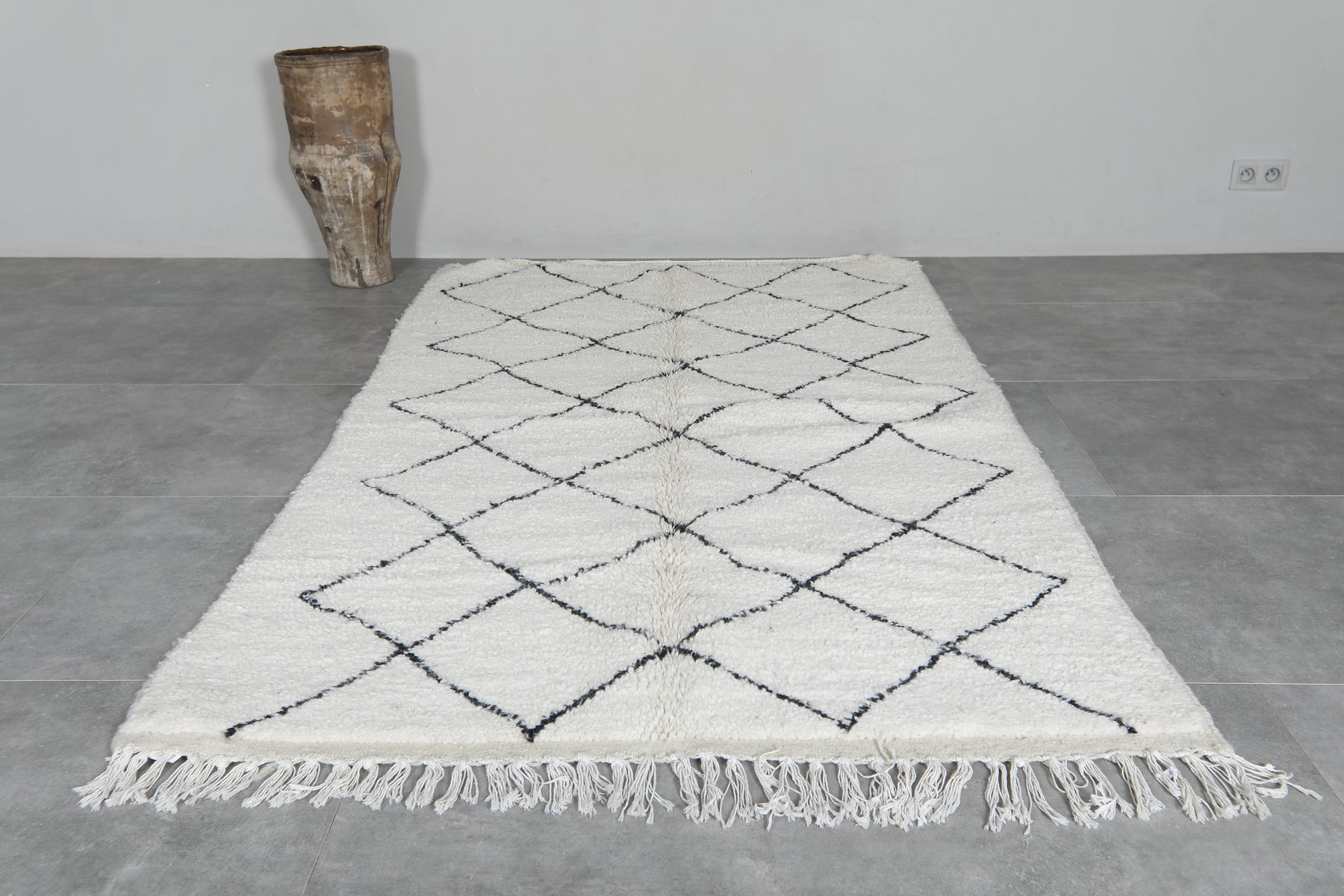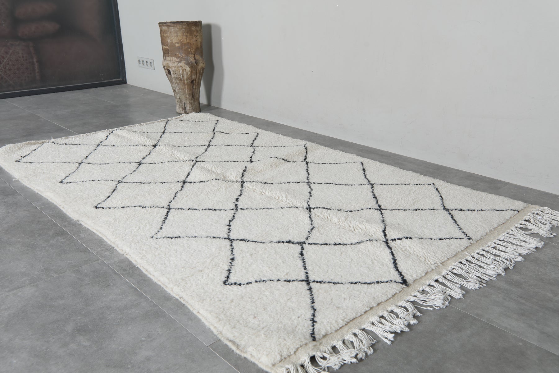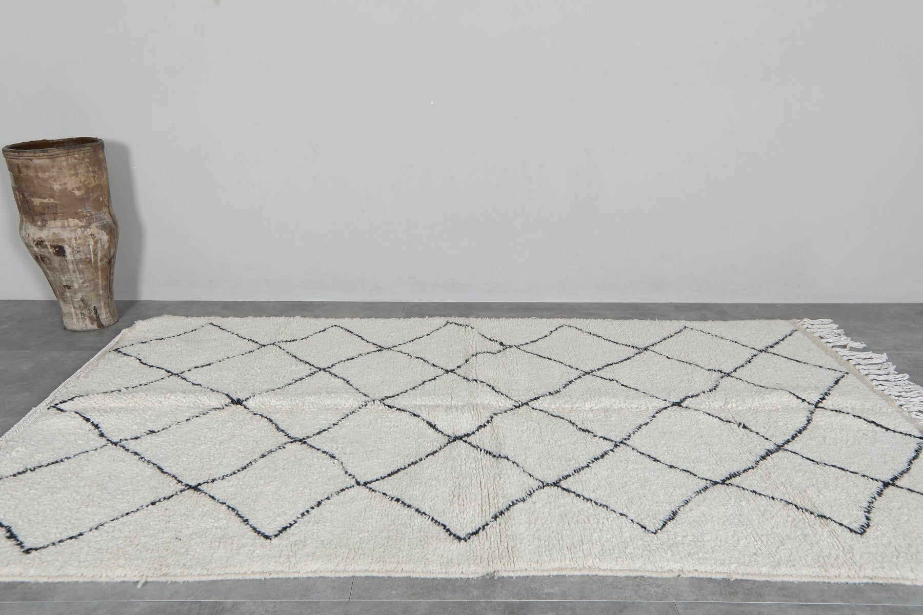 Transform your space with this Handwoven Moroccan Rug, measuring 4.6 FT x 7.8 FT. Crafted from 100% pure wool, this exquisite piece features a timeless diamond lattice pattern on a soft, neutral background. Its plush texture and durable construction add warmth, elegance, and cultural charm to any home.
