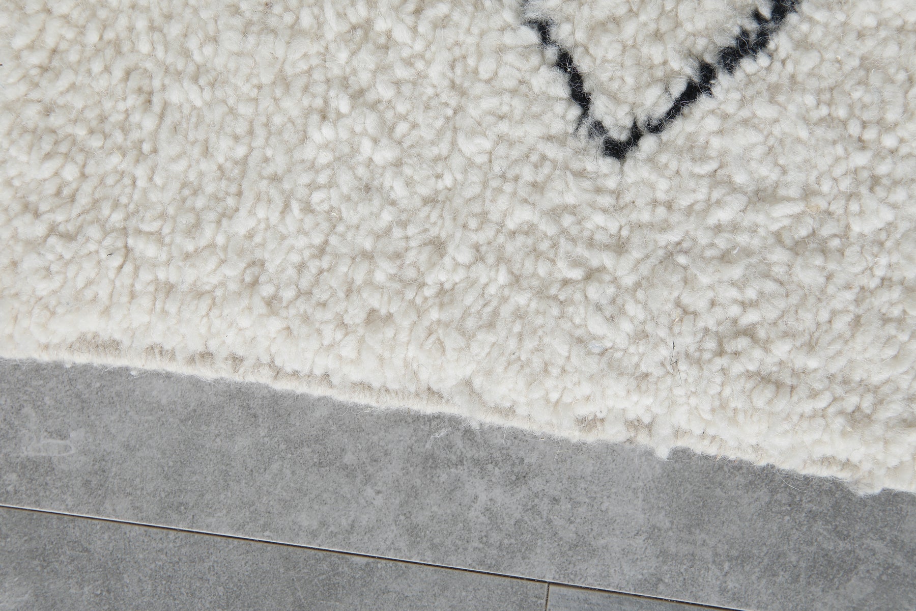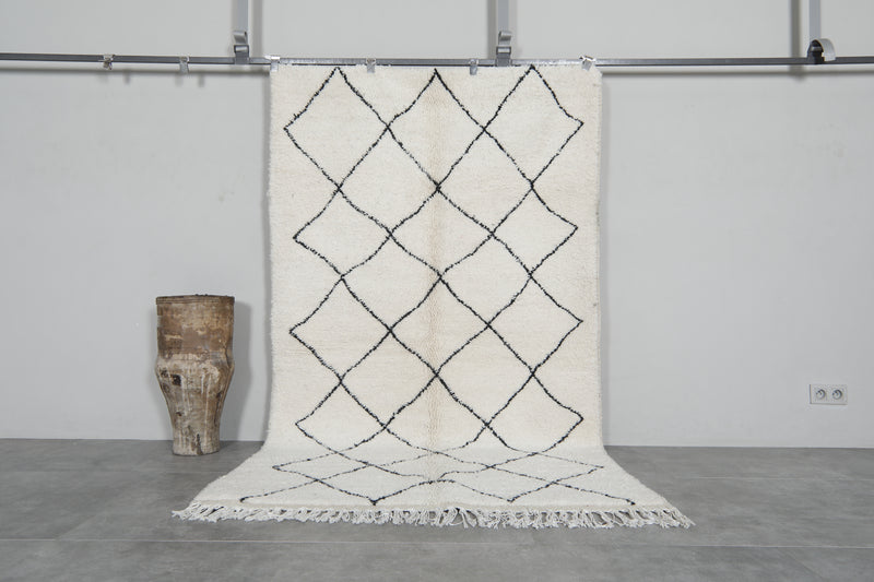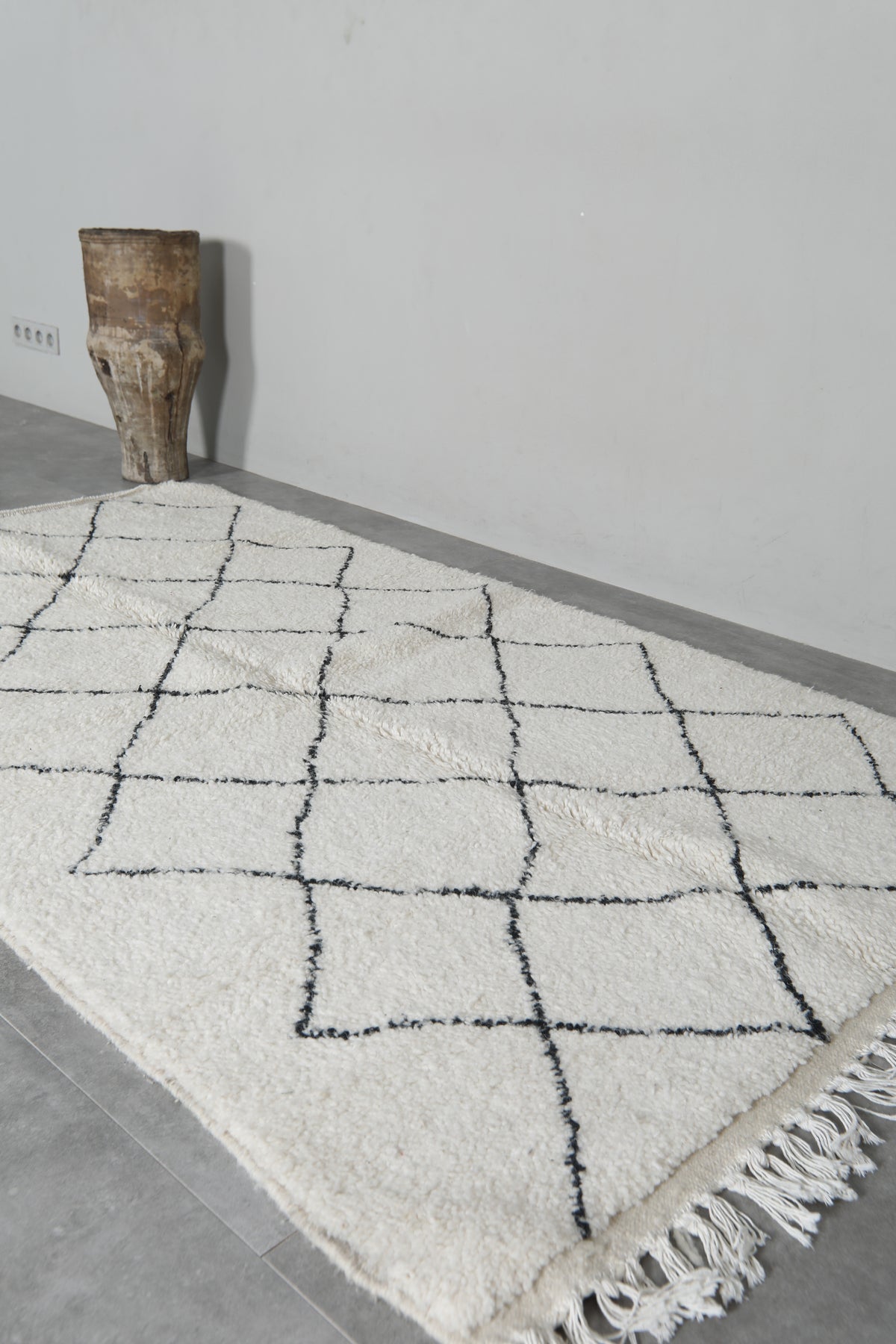 Transform your space with this Handwoven Moroccan Rug, measuring 4.6 FT x 7.8 FT. Crafted from 100% pure wool, this exquisite piece features a timeless diamond lattice pattern on a soft, neutral background. Its plush texture and durable construction add warmth, elegance, and cultural charm to any home.