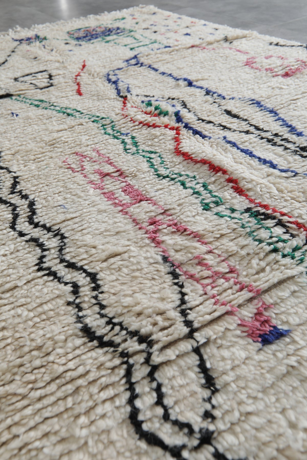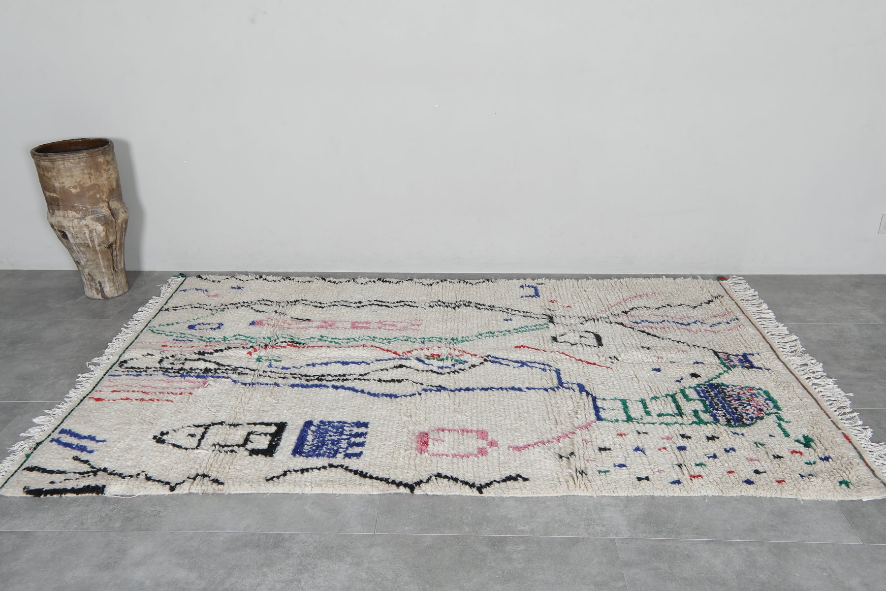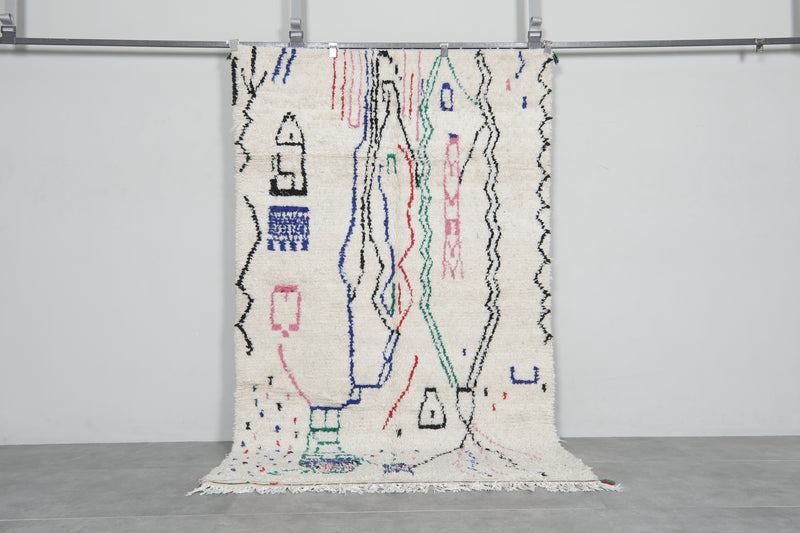 Enhance your space with this Handwoven Moroccan rug, measuring 4.7 FT x 7.9 FT. Crafted by skilled artisans, this unique piece features an abstract design with playful, colorful accents on a soft, neutral background. Its plush texture and durable construction make it a stunning and practical addition to any home.