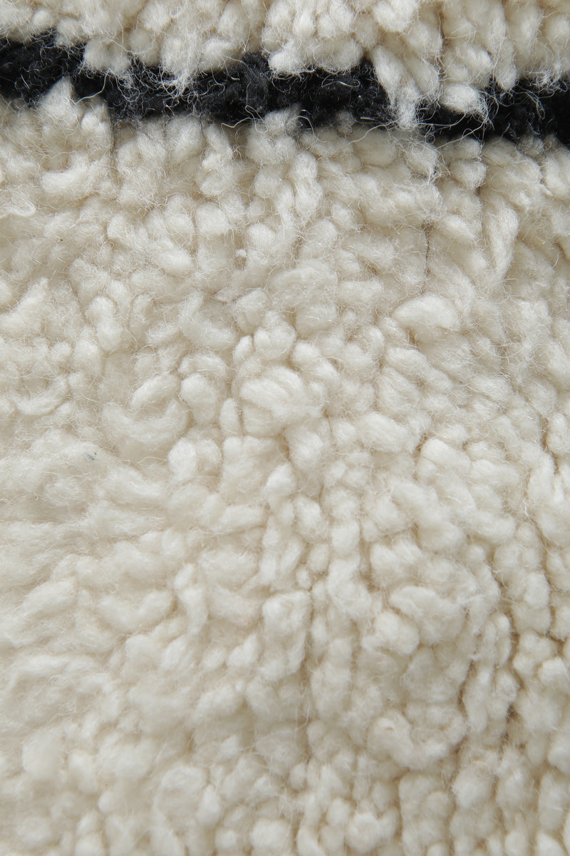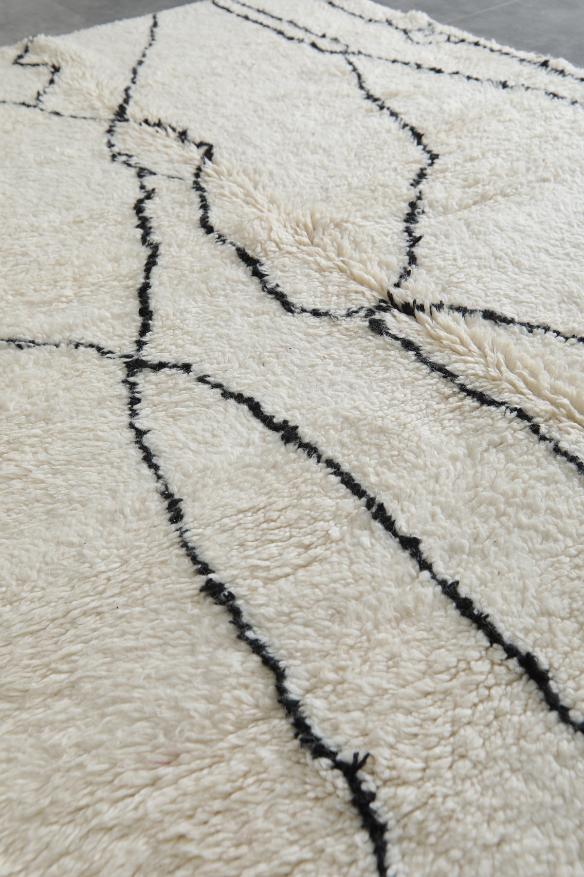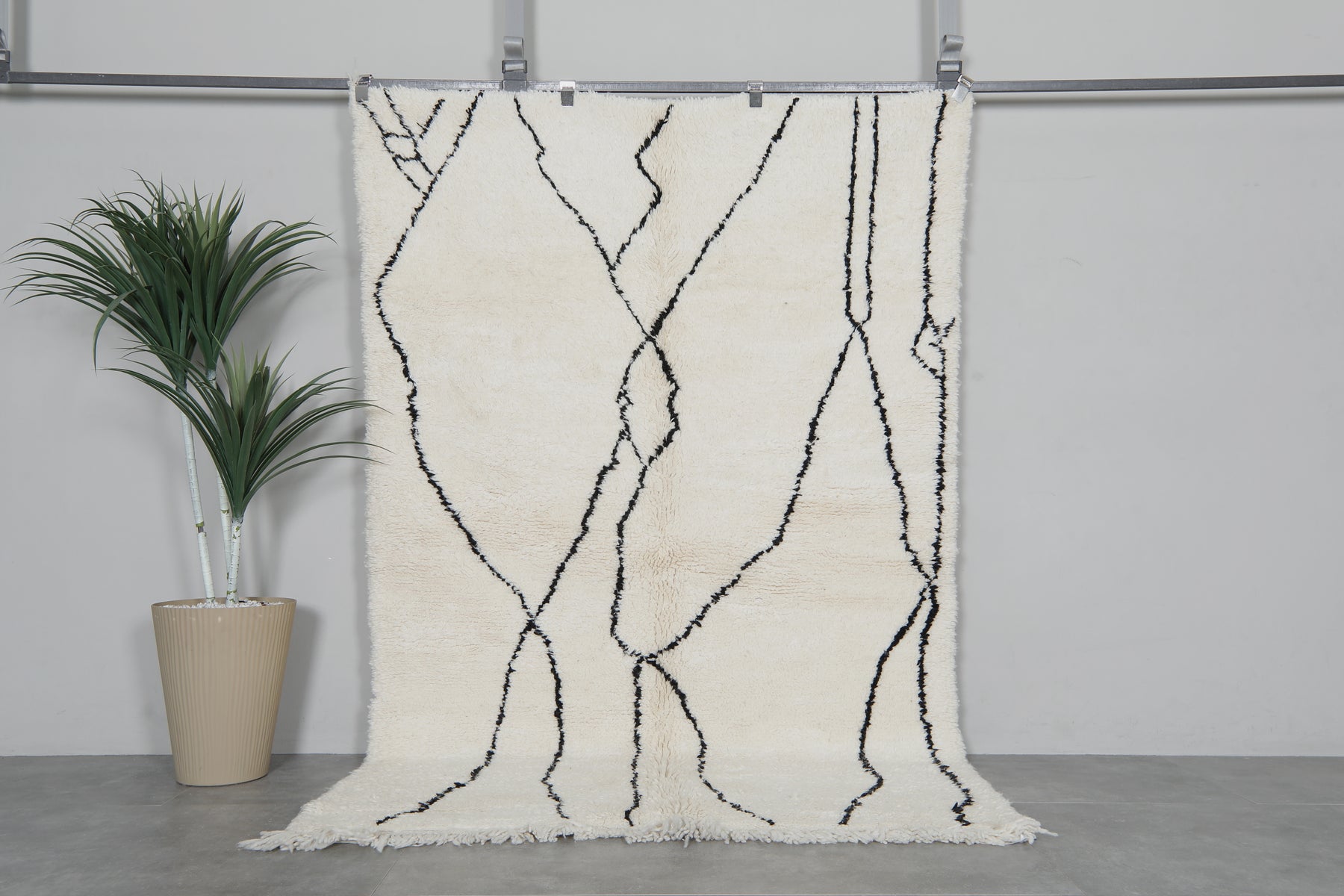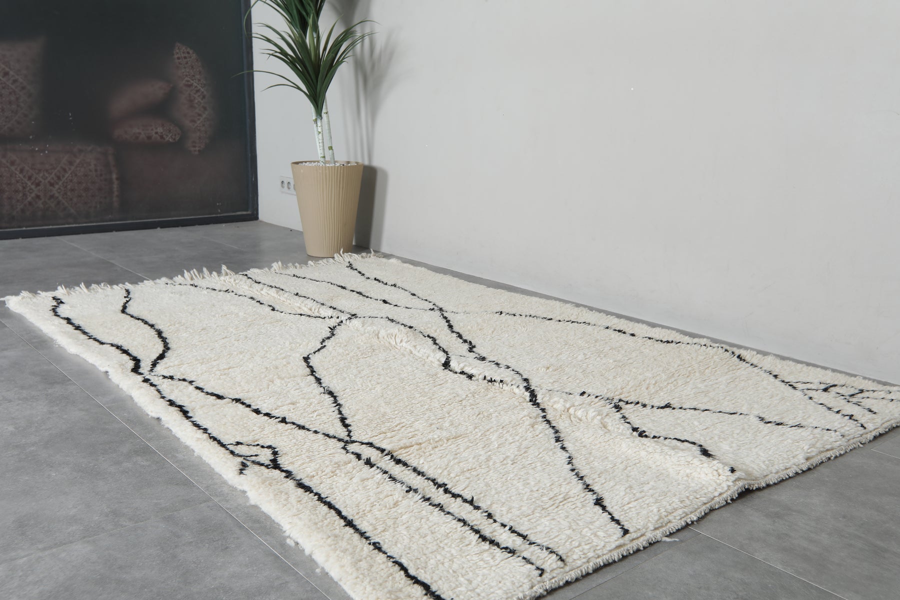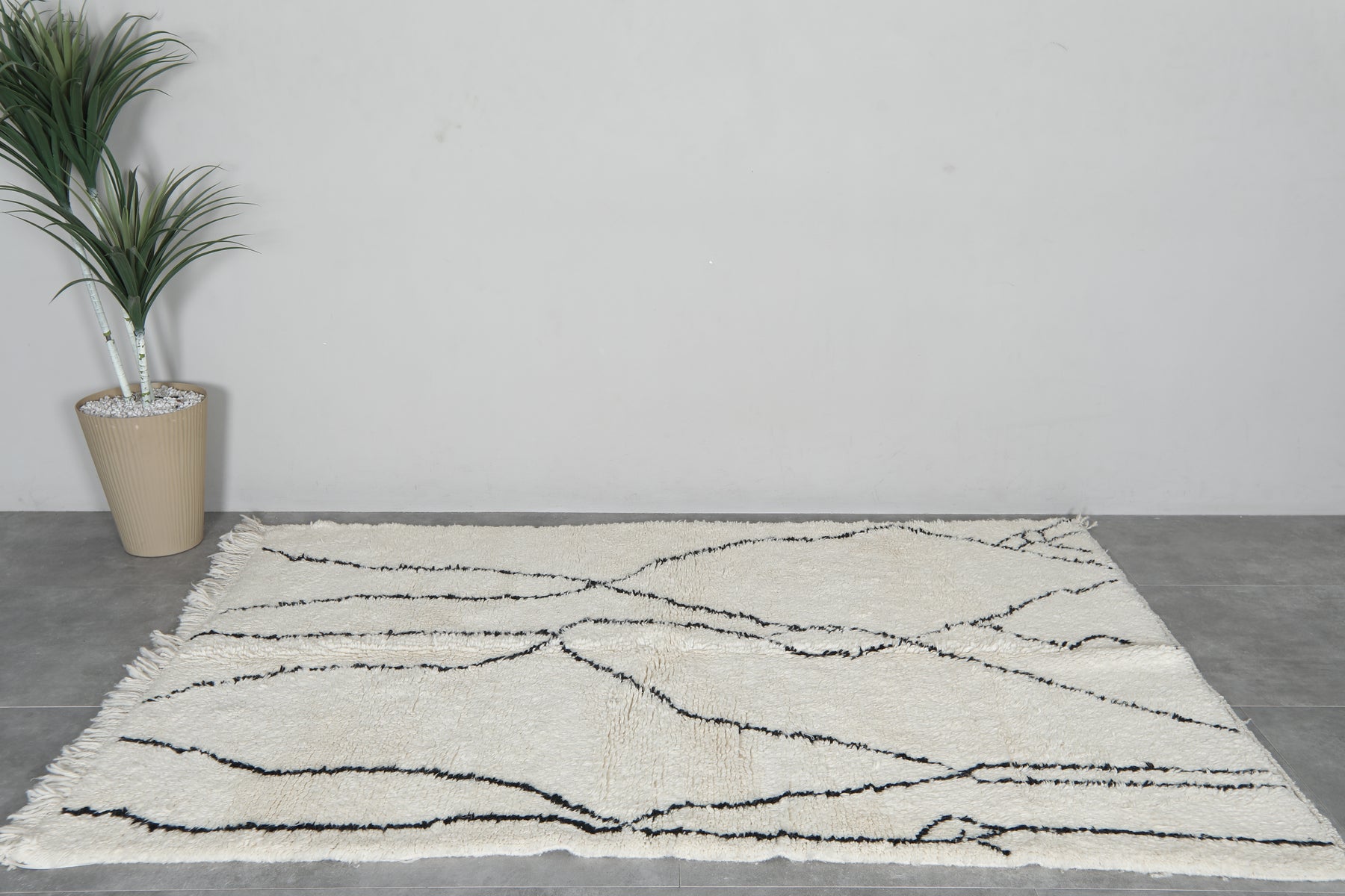 Enhance your home with the timeless beauty of this Handwoven Moroccan rug, measuring 4.9 FT x 7.6 FT. Made from 100% natural wool, this exquisite piece features a flowing abstract pattern in black on a soft, neutral background, adding a modern artistic touch to any space.