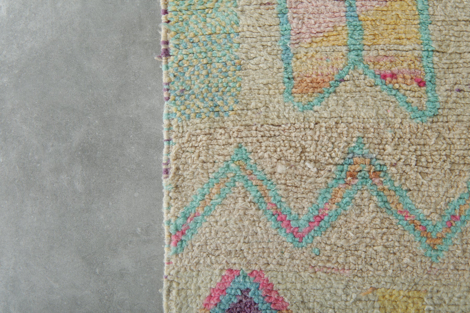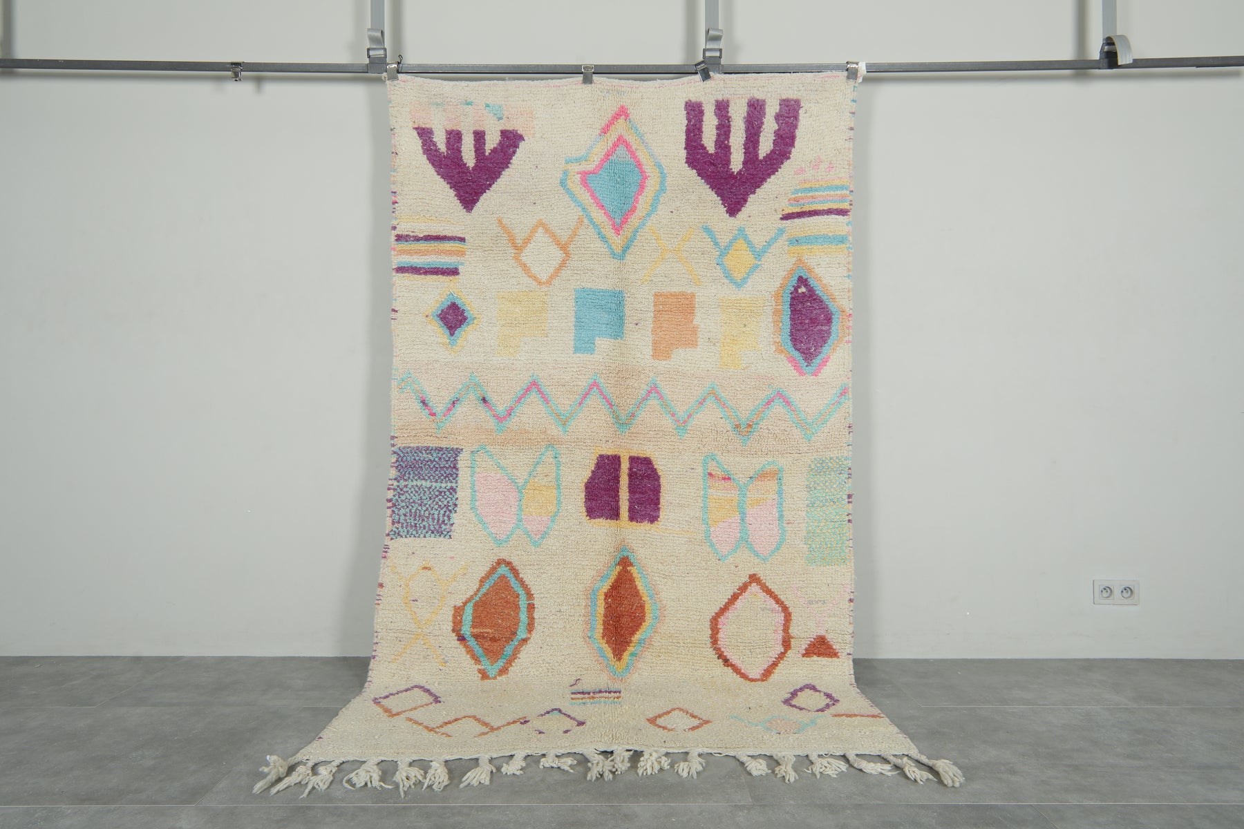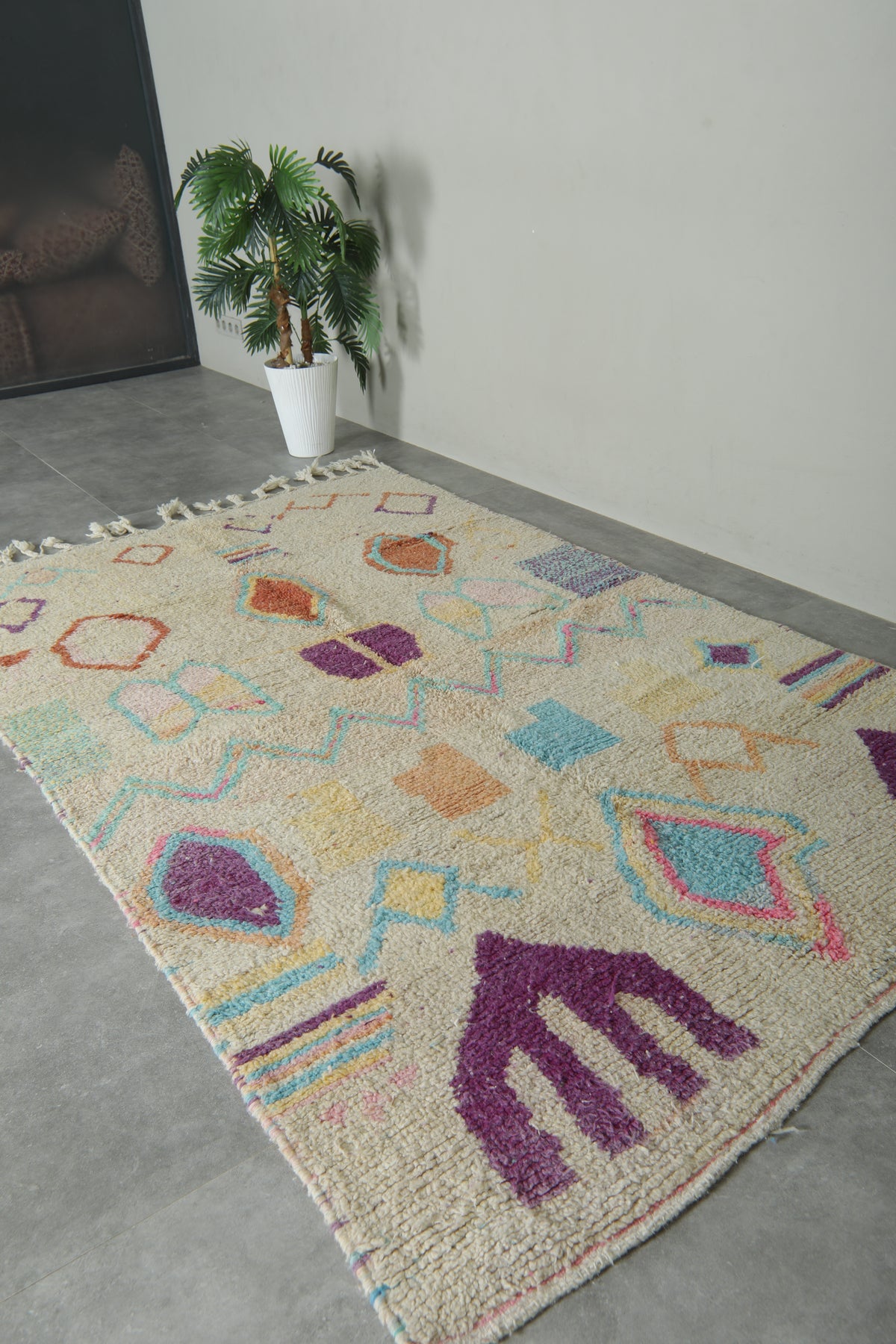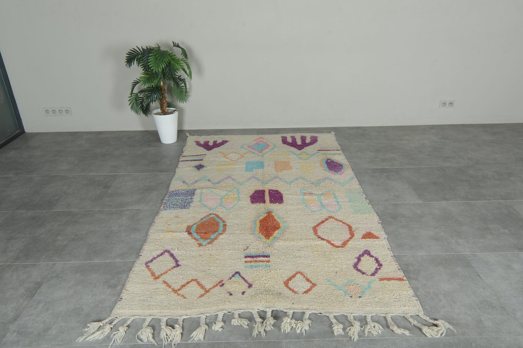 This 5 x 8 feet handwoven Moroccan rug features a vintage-inspired colorful design that reflects traditional craftsmanship. Its rich hues and intricate patterns bring a distinctive cultural charm and vibrant energy to any room. Expertly crafted for durability and style, this rug is an ideal choice for those who appreciate authentic Moroccan textiles with a timeless, artistic appeal.