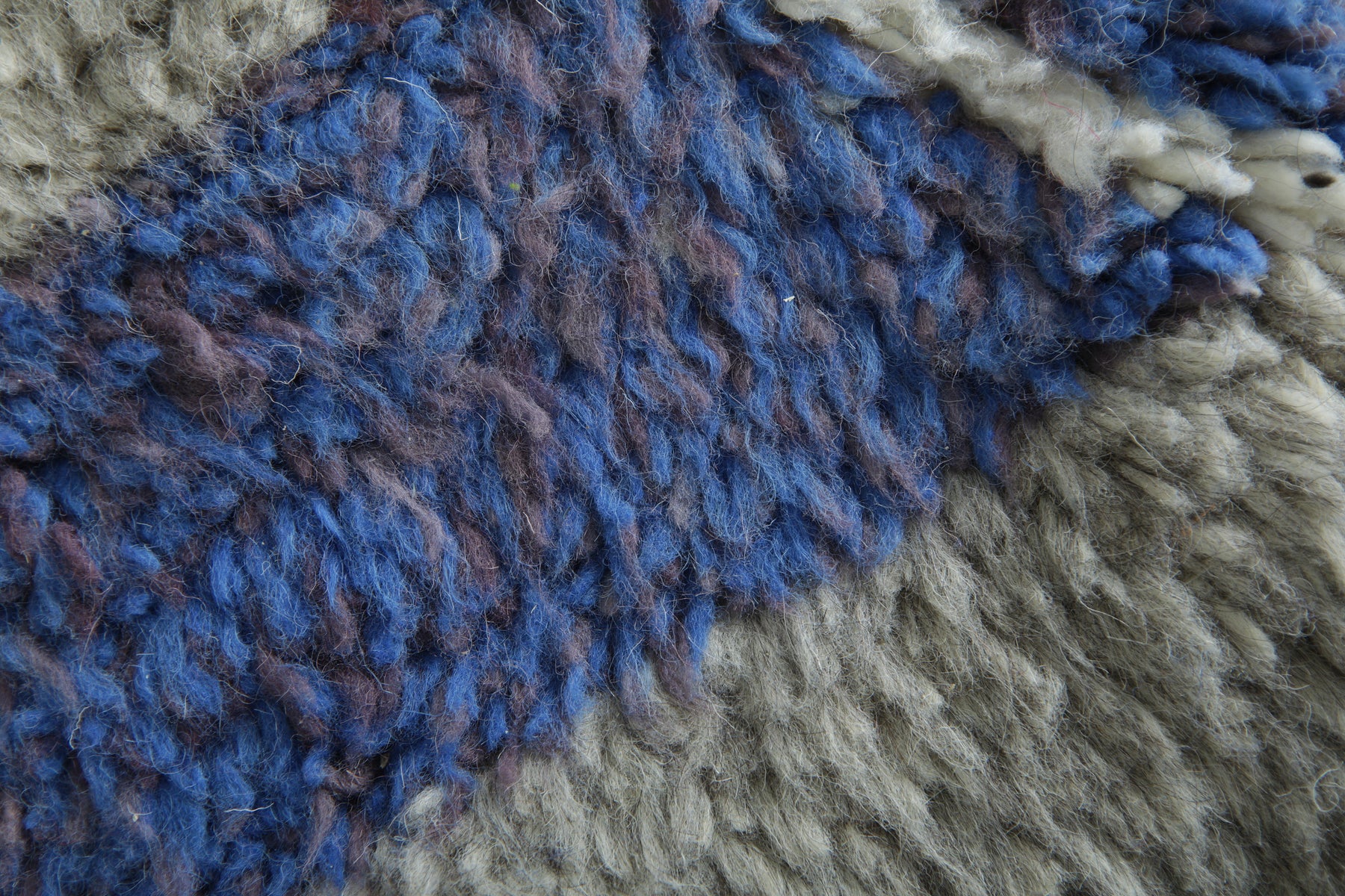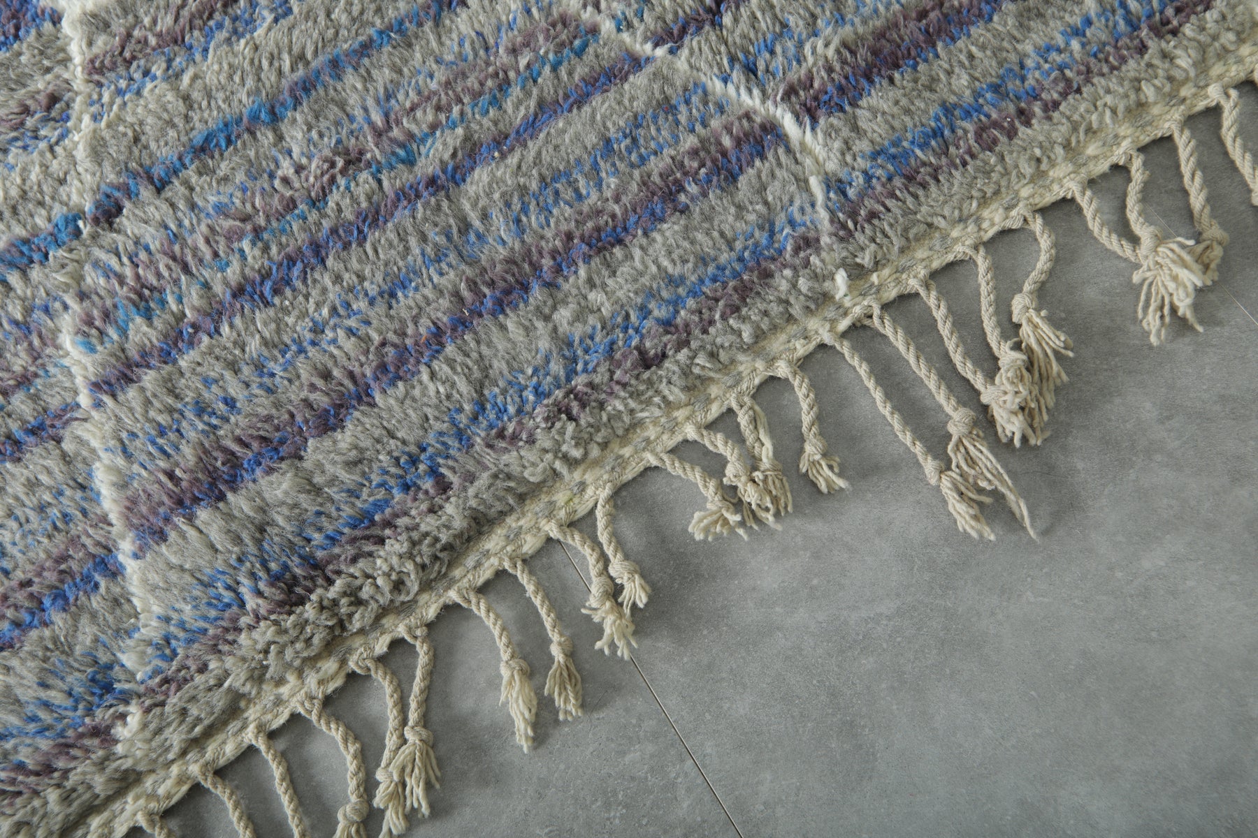 Make a contemporary statement with this unique, handwoven Moroccan rug. This extraordinary piece features a vibrant and modern design, combining horizontal bands of blue, gray, and purple with a striking, hand-knotted white geometric overlay. The high-pile shag texture is exceptionally soft and plush, providing a luxurious feel underfoot. Perfect for adding a bold and artistic touch to a modern, eclectic, or bohemian living room, this rug is a true fusion of traditional craftsmanship and contemporary style.