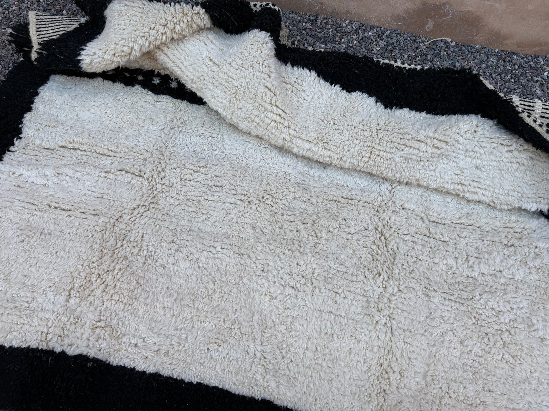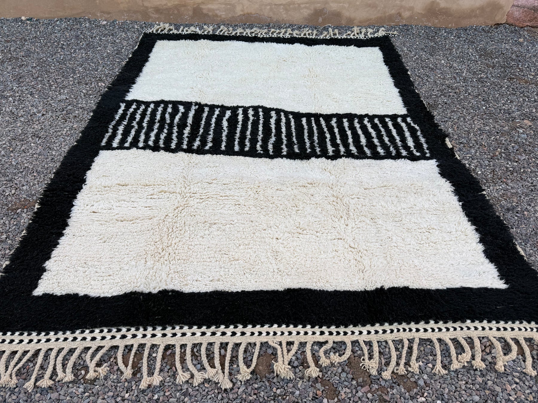 Bring bold contrast and timeless craftsmanship to your space with this handwoven Moroccan rug in rich black and soft ivory. Designed by Berber artisans in the Atlas Mountains, this rug features a clean, modern layout with a unique horizontal stripe detail that adds visual rhythm and texture.