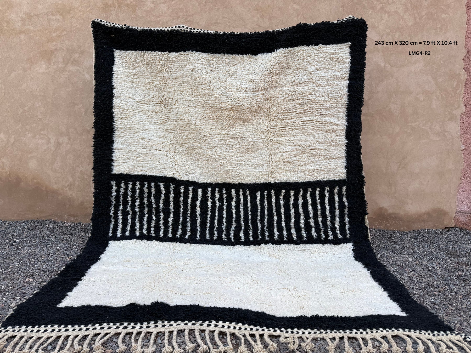Modern Moroccan rug - Black & ivory with stripe detail - 7.9 feet x 10.4 feet