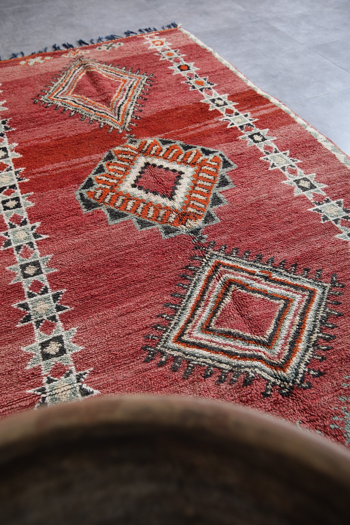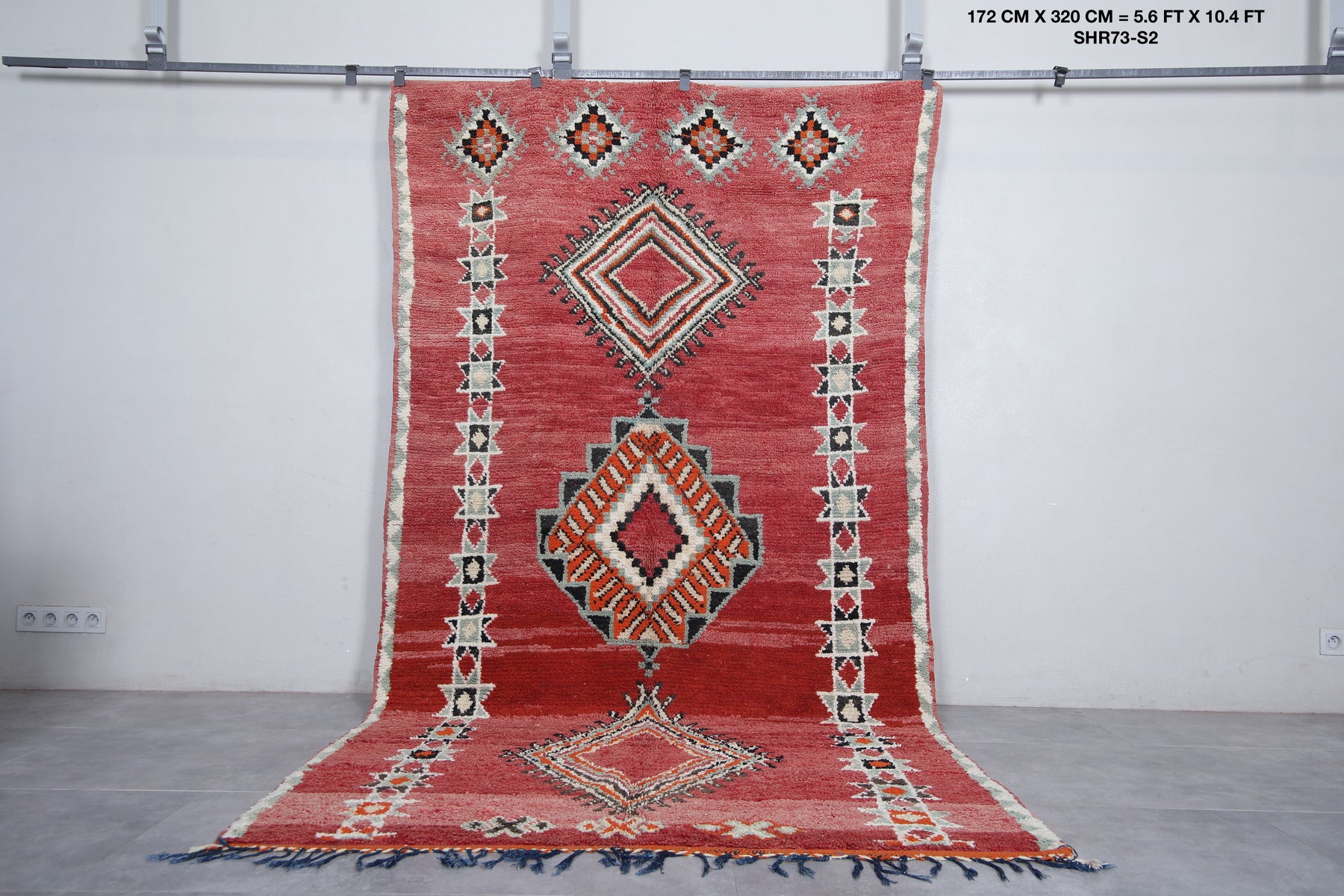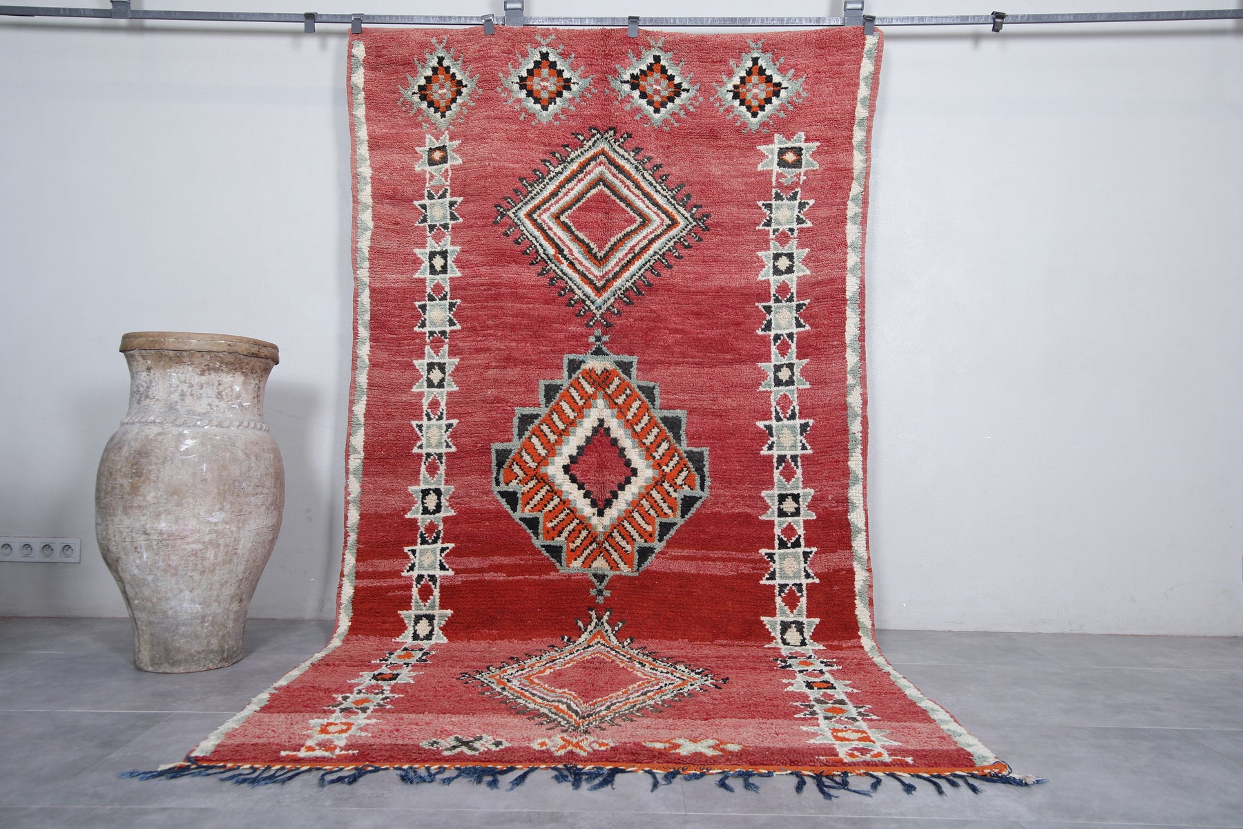 Enhance your space with this vibrant Moroccan Berber rug, featuring a stunning red background and intricate geometric designs. Measuring 5.6 FT x 10.4 FT, the rug showcases three striking diamond-shaped motifs running down its center, each surrounded by detailed borders and contrasting patterns in white, black, and orange hues. This symmetrical layout is complemented by delicate accents at the top, creating a harmonious and balanced design. Handwoven from high-quality wool, this rug adds warmth, texture, and cultural charm to any room, making it perfect for living spaces, bedrooms, or offices. Elevate your decor with this bold Moroccan statement piece.
