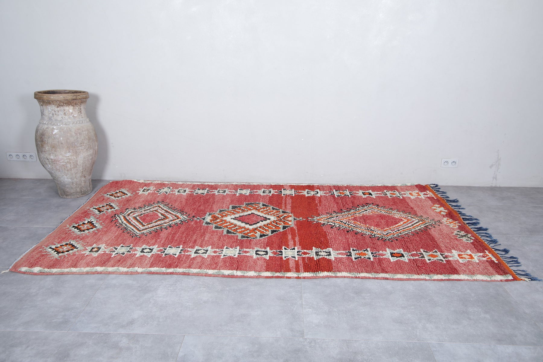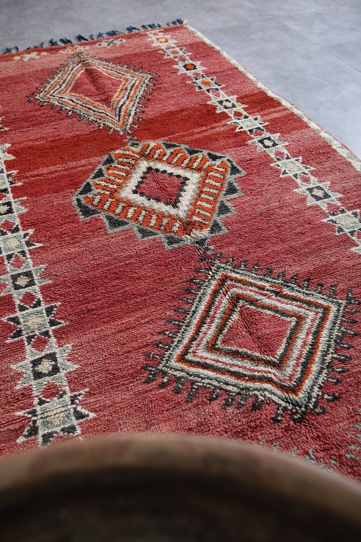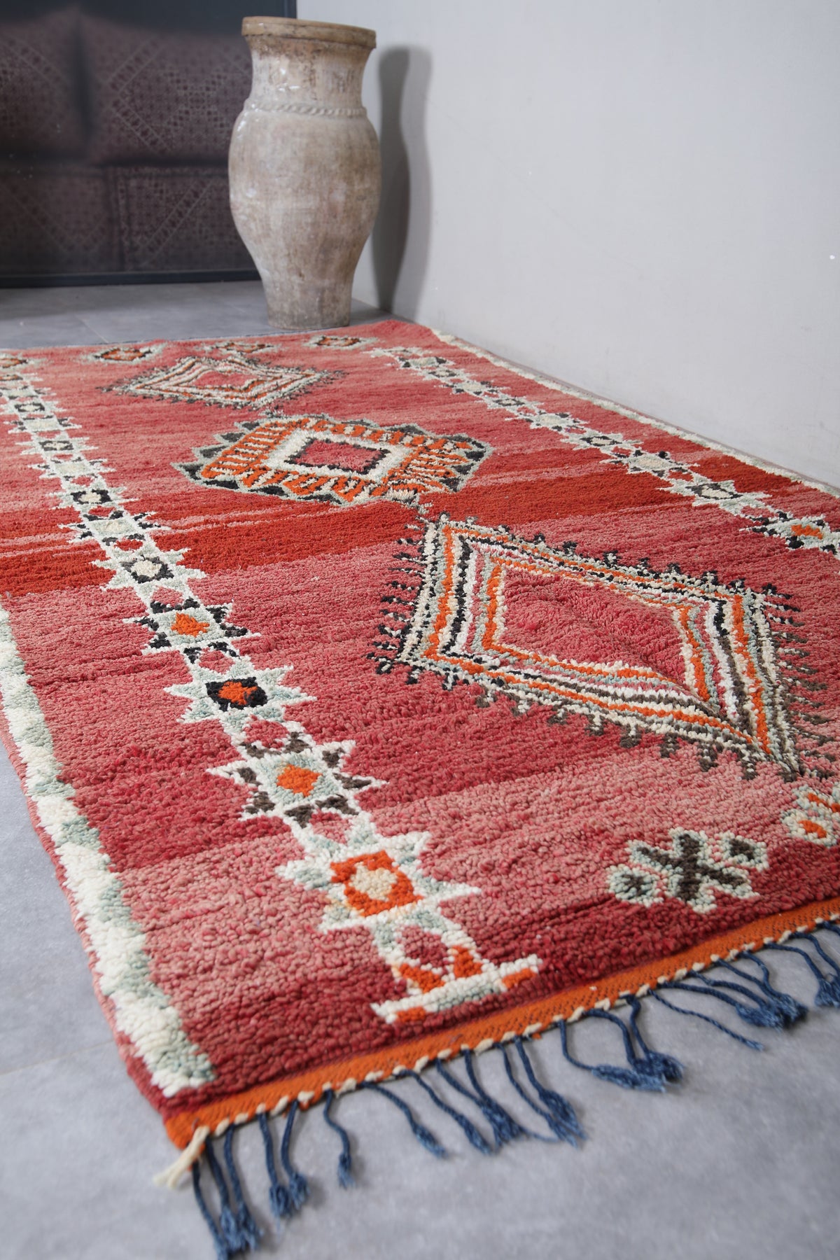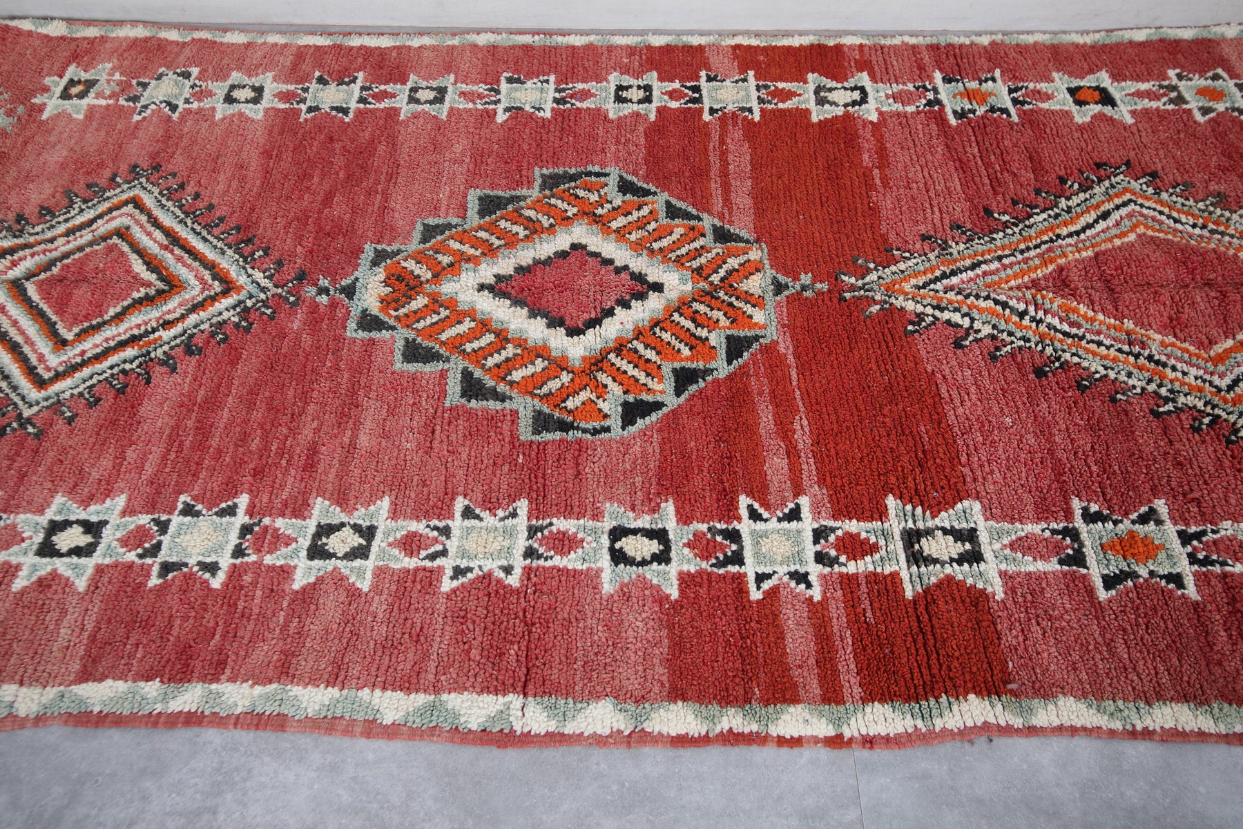 Enhance your space with this vibrant Moroccan Berber rug, featuring a stunning red background and intricate geometric designs. Measuring 5.6 FT x 10.4 FT, the rug showcases three striking diamond-shaped motifs running down its center, each surrounded by detailed borders and contrasting patterns in white, black, and orange hues. This symmetrical layout is complemented by delicate accents at the top, creating a harmonious and balanced design. Handwoven from high-quality wool, this rug adds warmth, texture, and cultural charm to any room, making it perfect for living spaces, bedrooms, or offices. Elevate your decor with this bold Moroccan statement piece.