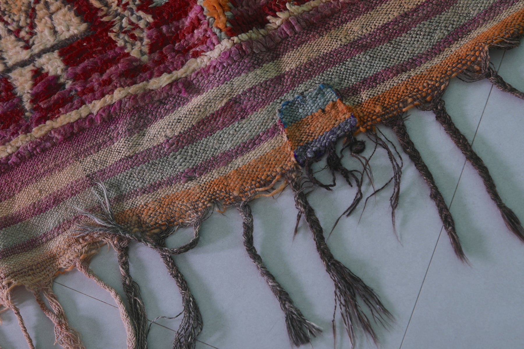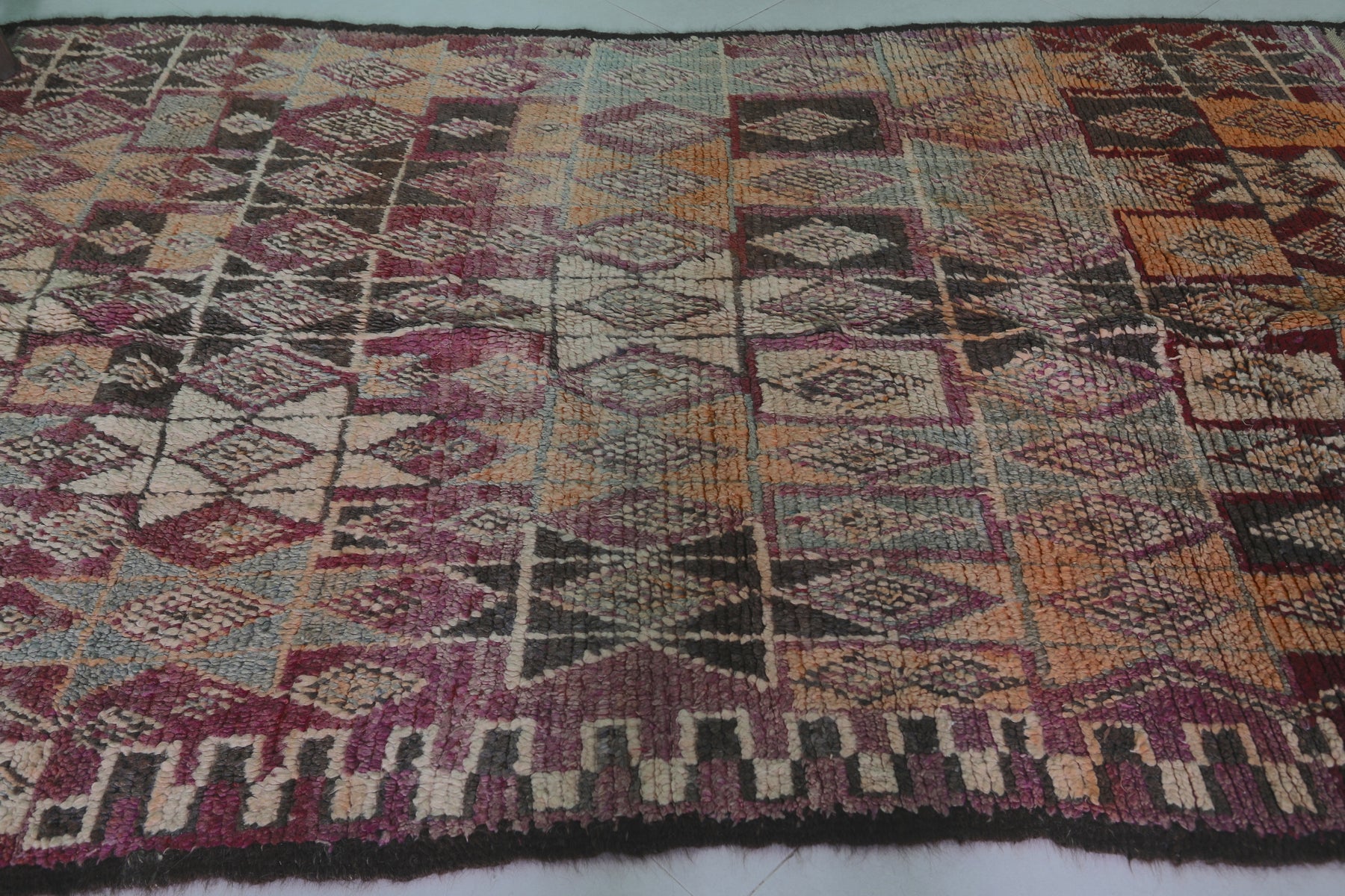 Transform your space with this handwoven Berber Moroccan rug, measuring 5.4 FT x 9.8 FT. Crafted by skilled artisans, this rug showcases intricate diamond motifs, each outlined in bold colors like plum, orange, black, and beige. The unique geometric layout blends traditional Berber designs with a rich, warm color palette, including deep purple and earthy tones, creating a visually captivating statement piece. Durable and versatile, this timeless Moroccan treasure is ideal for enhancing living rooms, bedrooms, or hallways with a touch of artistry and culture.