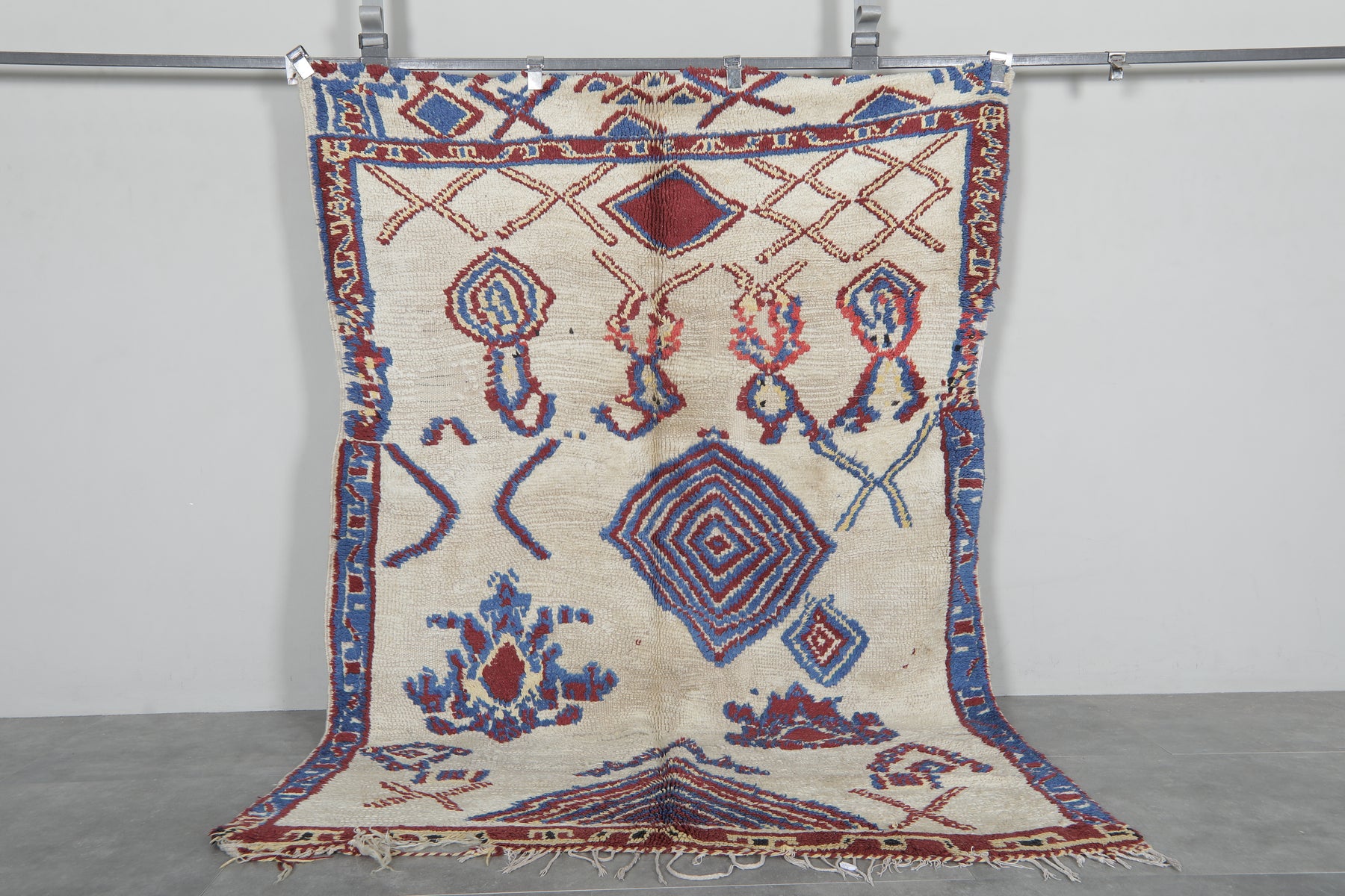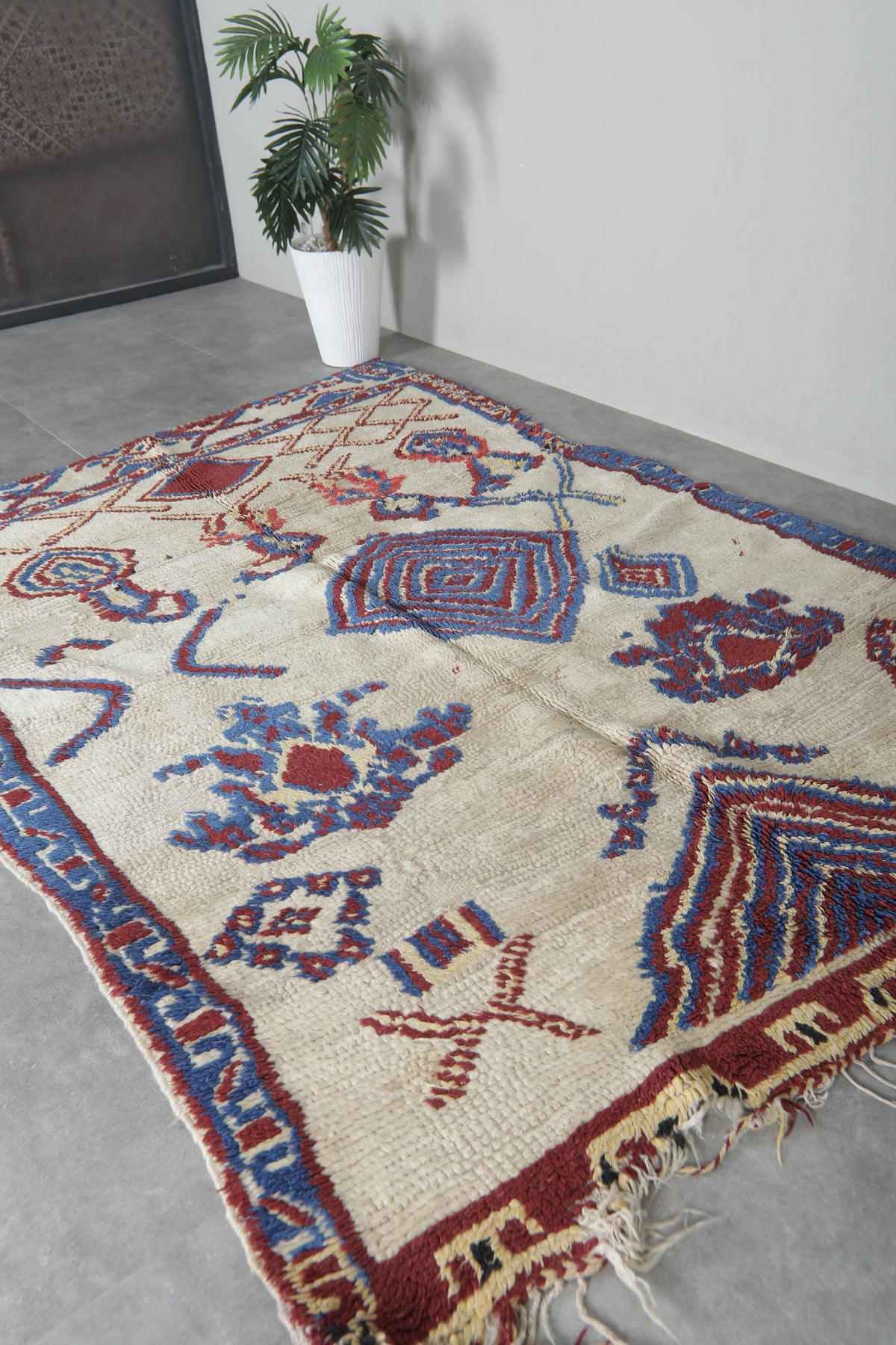 Enhance your space with this artisan handwoven Moroccan wool rug, measuring 5.1 FT x 7.3 FT. Featuring intricate geometric motifs in bold red and blue hues against a soft cream background, this rug is a true statement of Moroccan craftsmanship. Handwoven from 100% premium wool, it offers luxurious softness, durability, and timeless elegance. Perfect for living rooms, studies, or creative spaces, this rug brings warmth and artistry into your home.