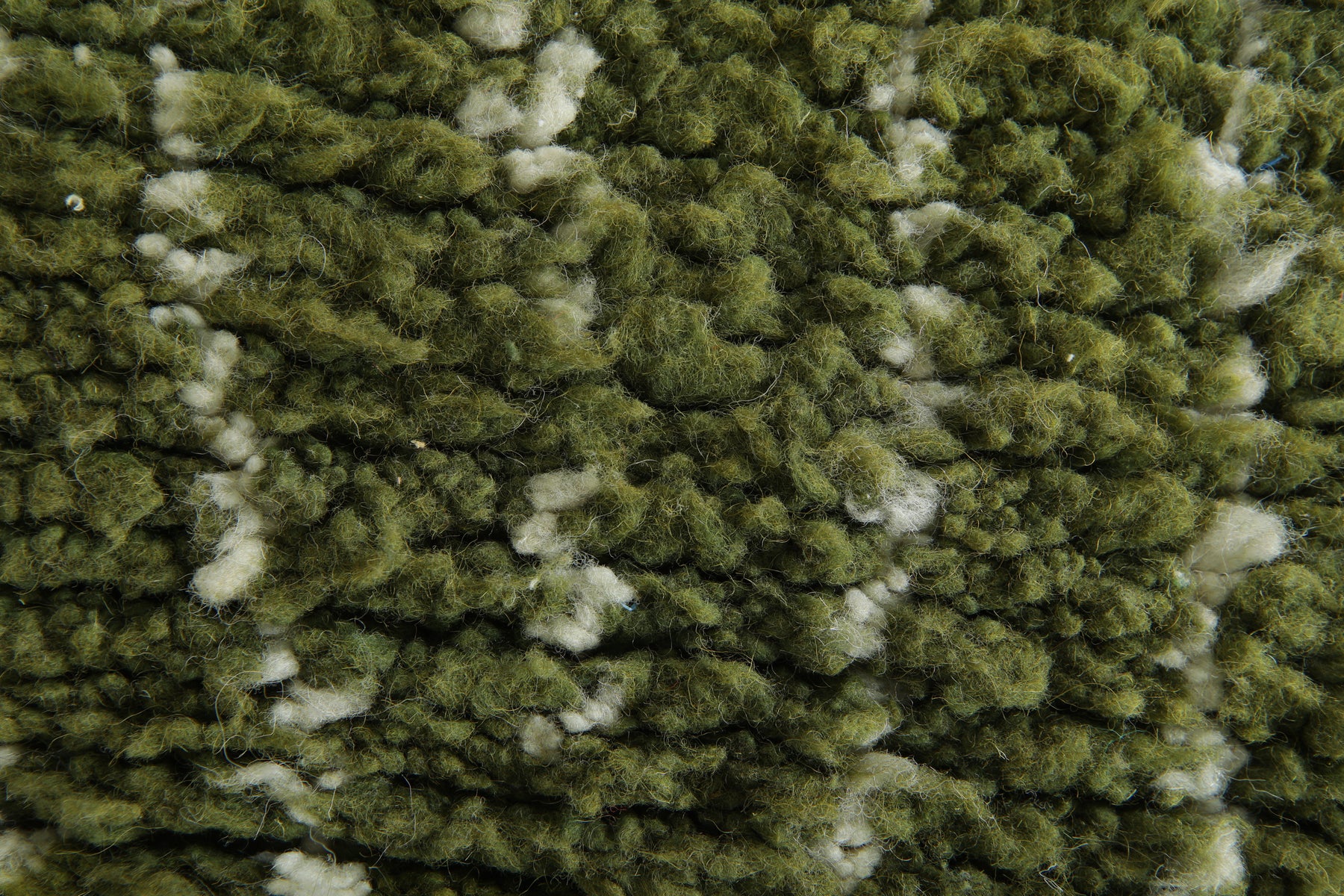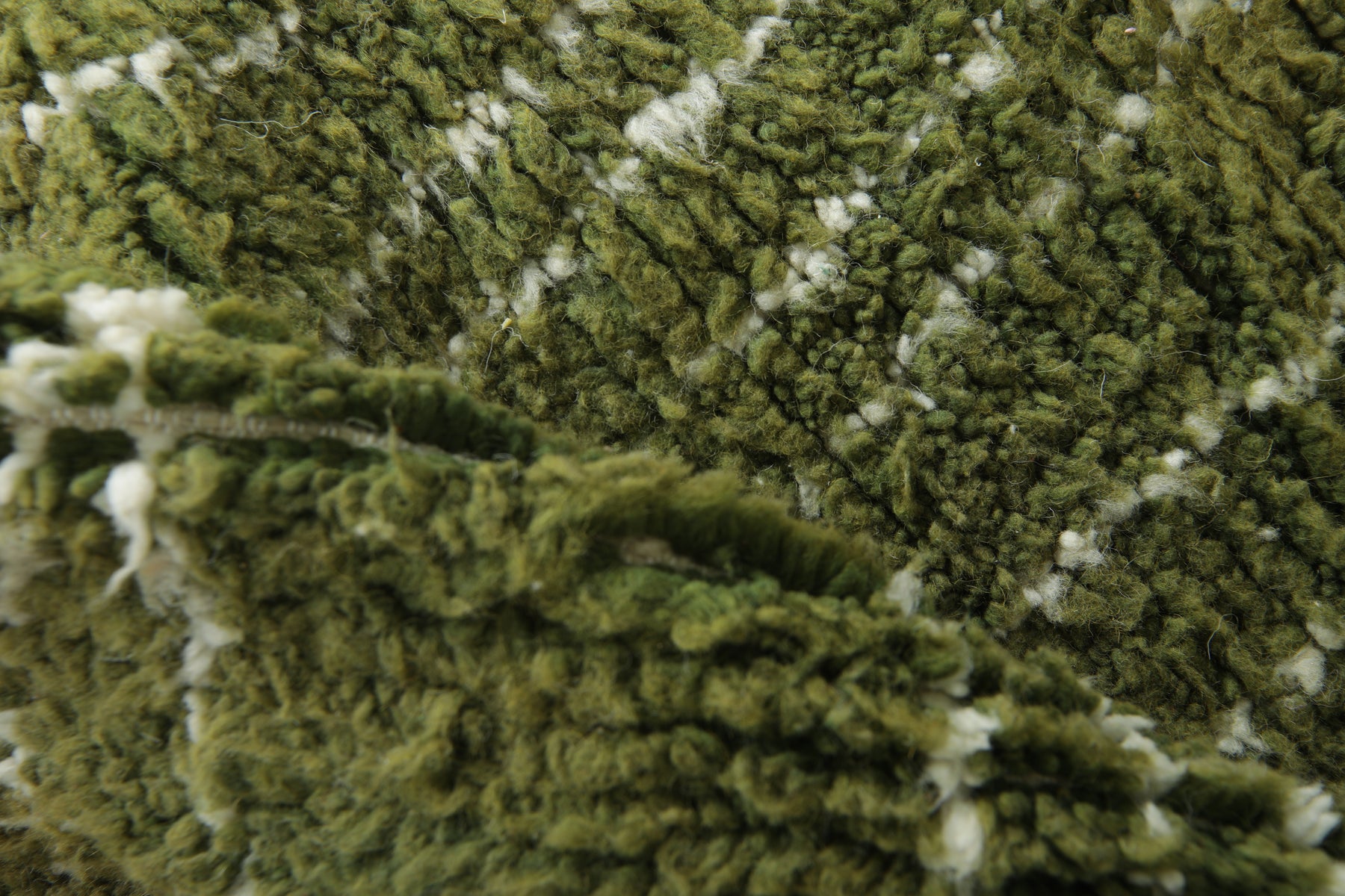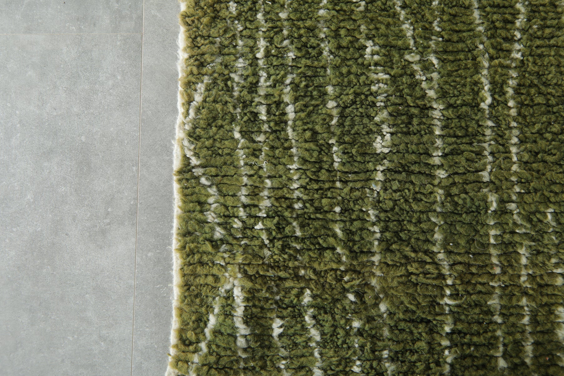 Add a modern twist to traditional Berber design with this Moroccan wool runner in Beni Ourain style. Handwoven by artisans in the Atlas Mountains, this rug features a rich olive green base accented with White abstract linear patterns, offering a contemporary take on the iconic Beni Ourain diamond motif.