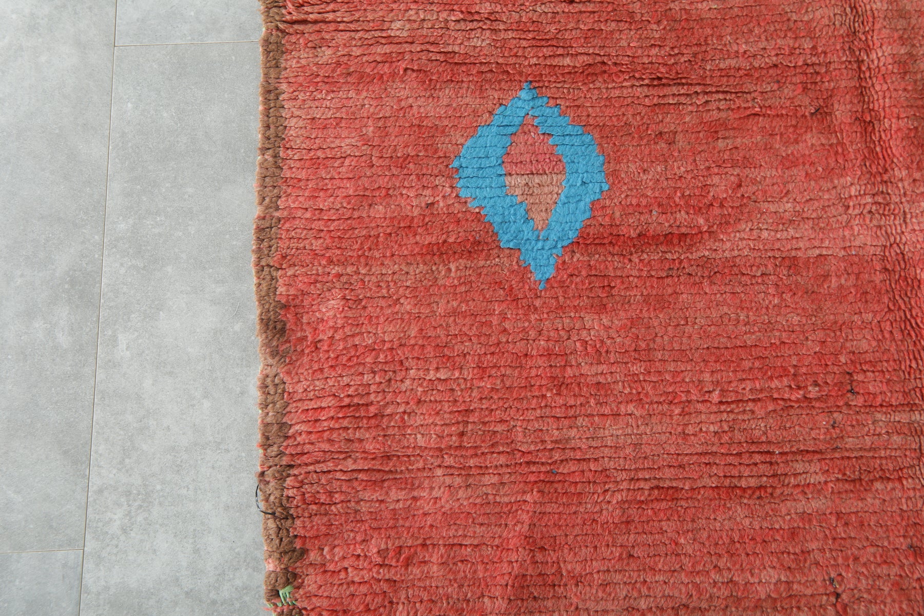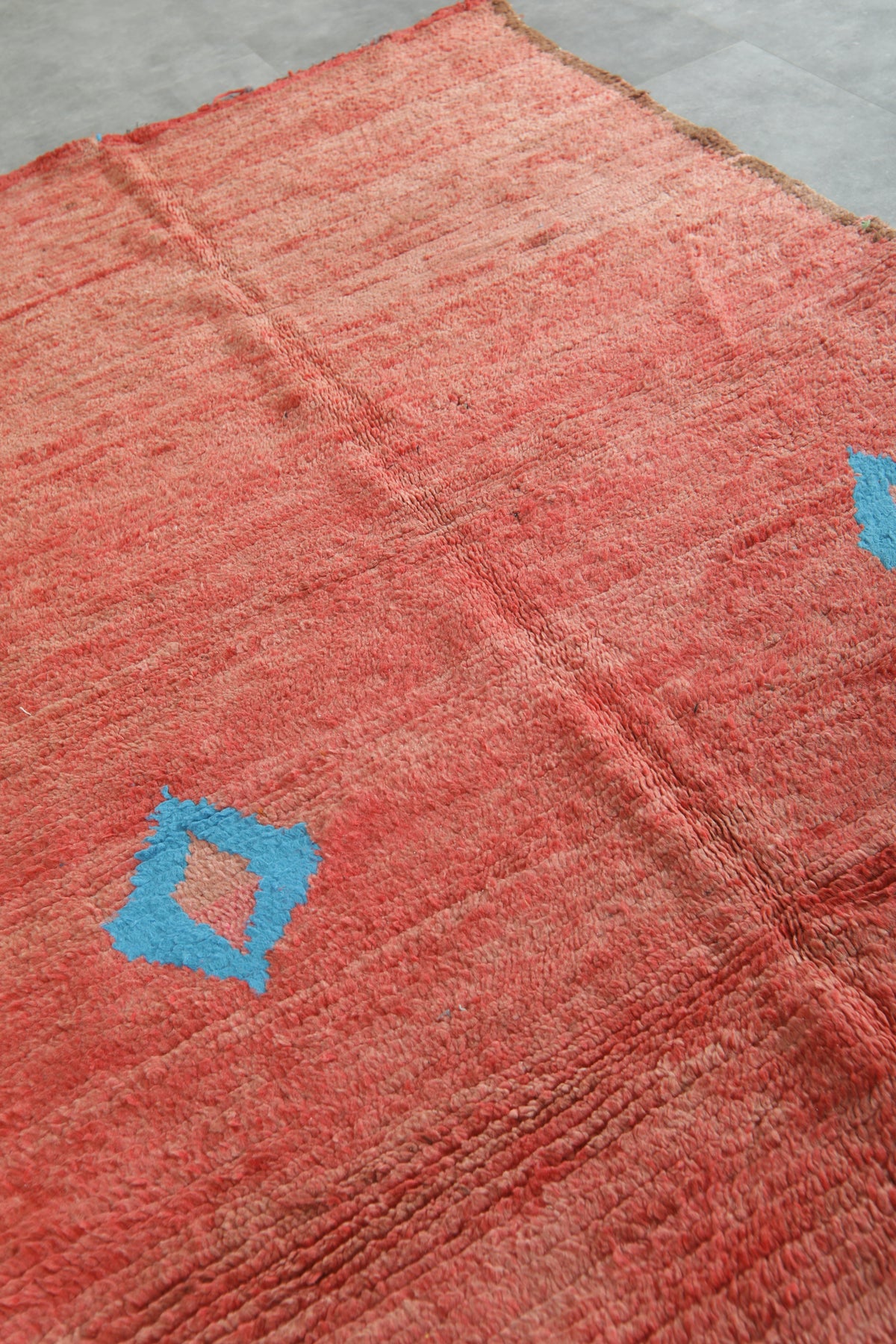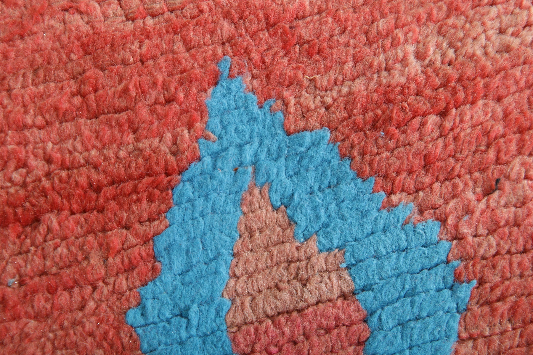 Discover the unique beauty of this authentic vintage Moroccan rug, a true masterpiece of tribal art, handwoven by skilled artisans in the High Atlas Mountains. Its powerful design features a vibrant rose-red field, beautifully adorned with two simple yet striking turquoise diamond motifs. The clean, graphic shapes create a modern aesthetic that is perfectly balanced by the organic charm of its handmade origins.