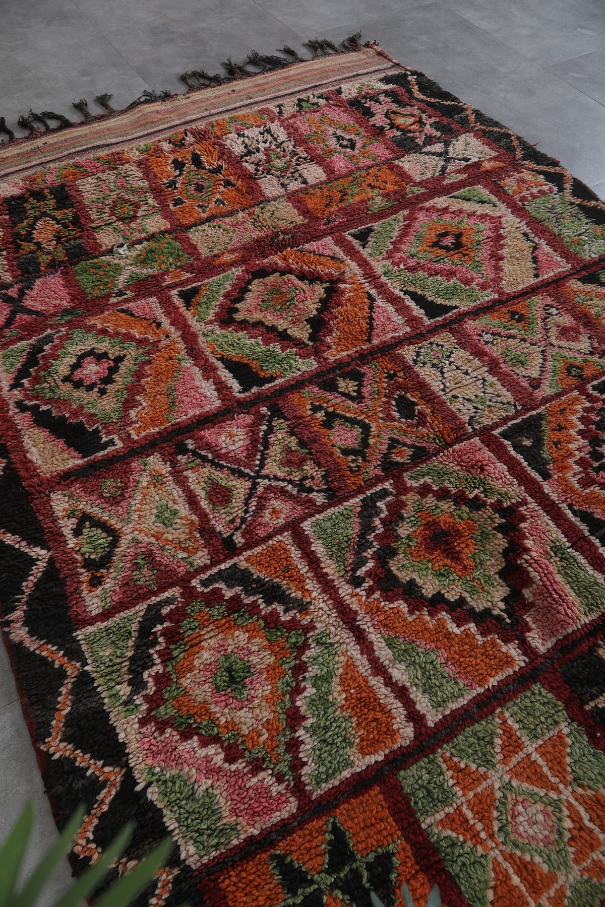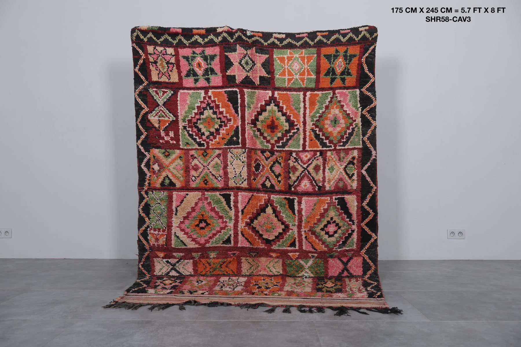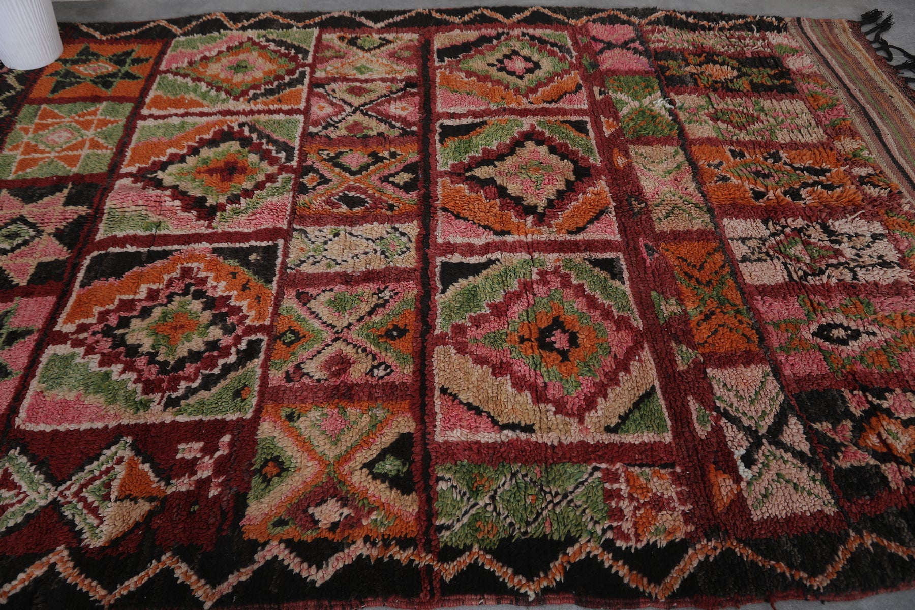Enhance your space with this exquisite Moroccan wool rug, measuring 5.7 FT x 8 FT. Expertly handwoven by Berber artisans, this rug features vibrant geometric patterns and diamond motifs in warm hues of pink, orange, green, and black. The intricate patchwork design blends traditional craftsmanship with contemporary flair, making it a standout piece in any room. Crafted from high-quality wool, this rug is not only soft and plush but also durable, ensuring lasting beauty and comfort. Perfect for adding warmth and character to your living room, bedroom, or office space.
