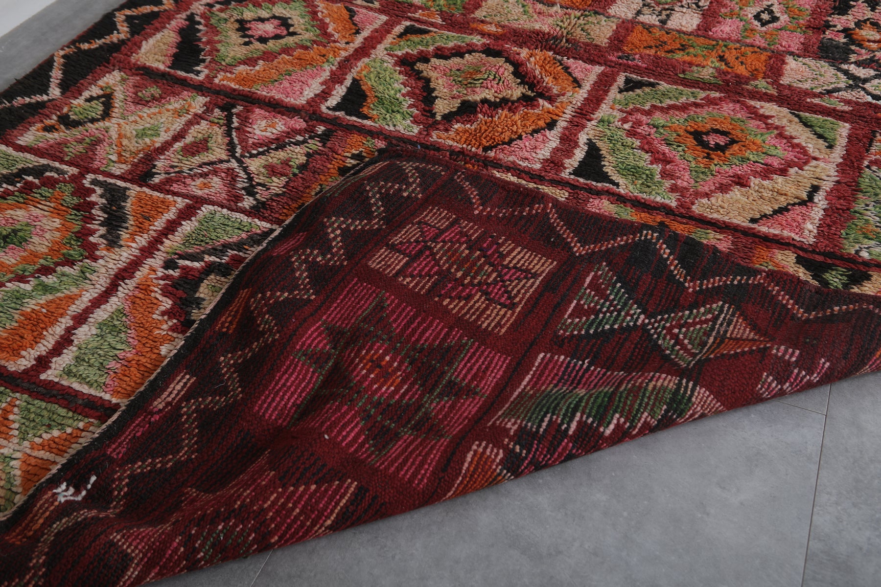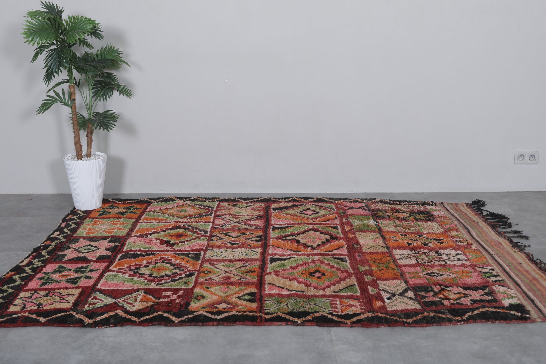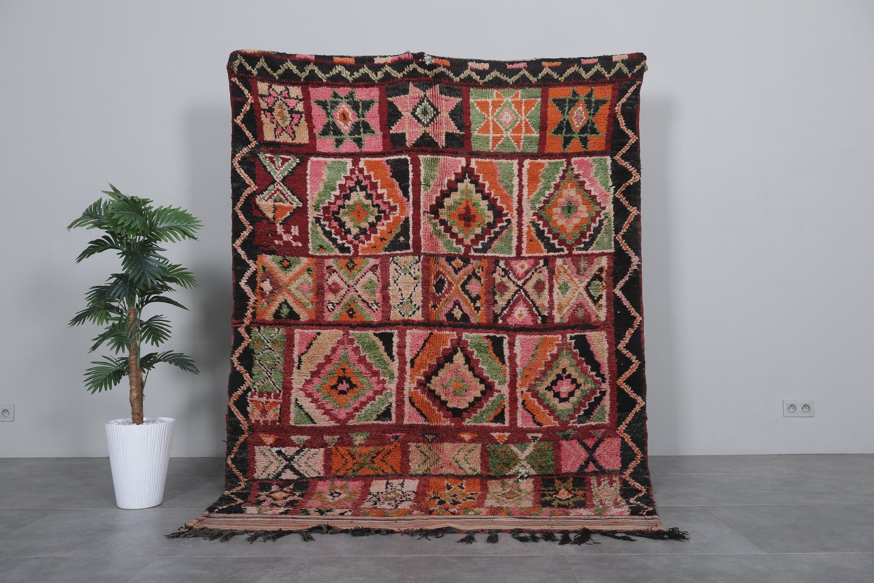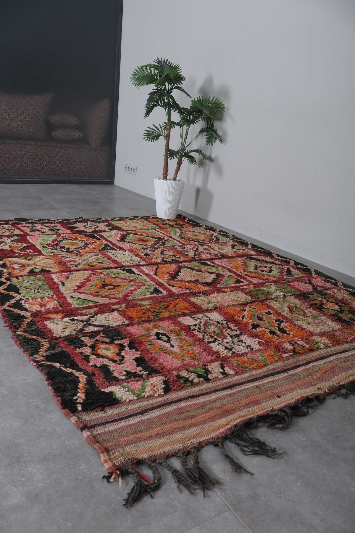 Enhance your space with this exquisite Moroccan wool rug, measuring 5.7 FT x 8 FT. Expertly handwoven by Berber artisans, this rug features vibrant geometric patterns and diamond motifs in warm hues of pink, orange, green, and black. The intricate patchwork design blends traditional craftsmanship with contemporary flair, making it a standout piece in any room. Crafted from high-quality wool, this rug is not only soft and plush but also durable, ensuring lasting beauty and comfort. Perfect for adding warmth and character to your living room, bedroom, or office space.