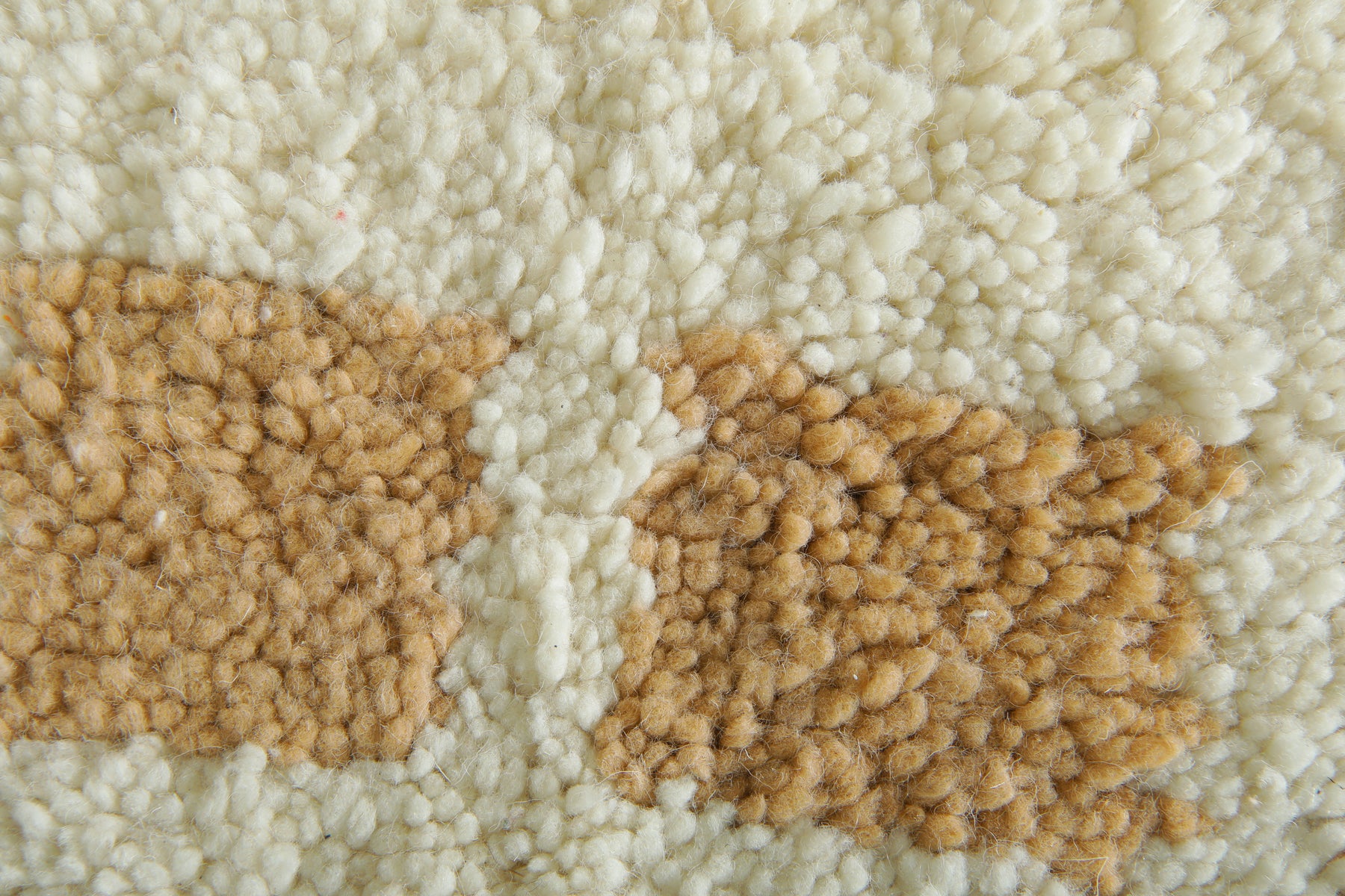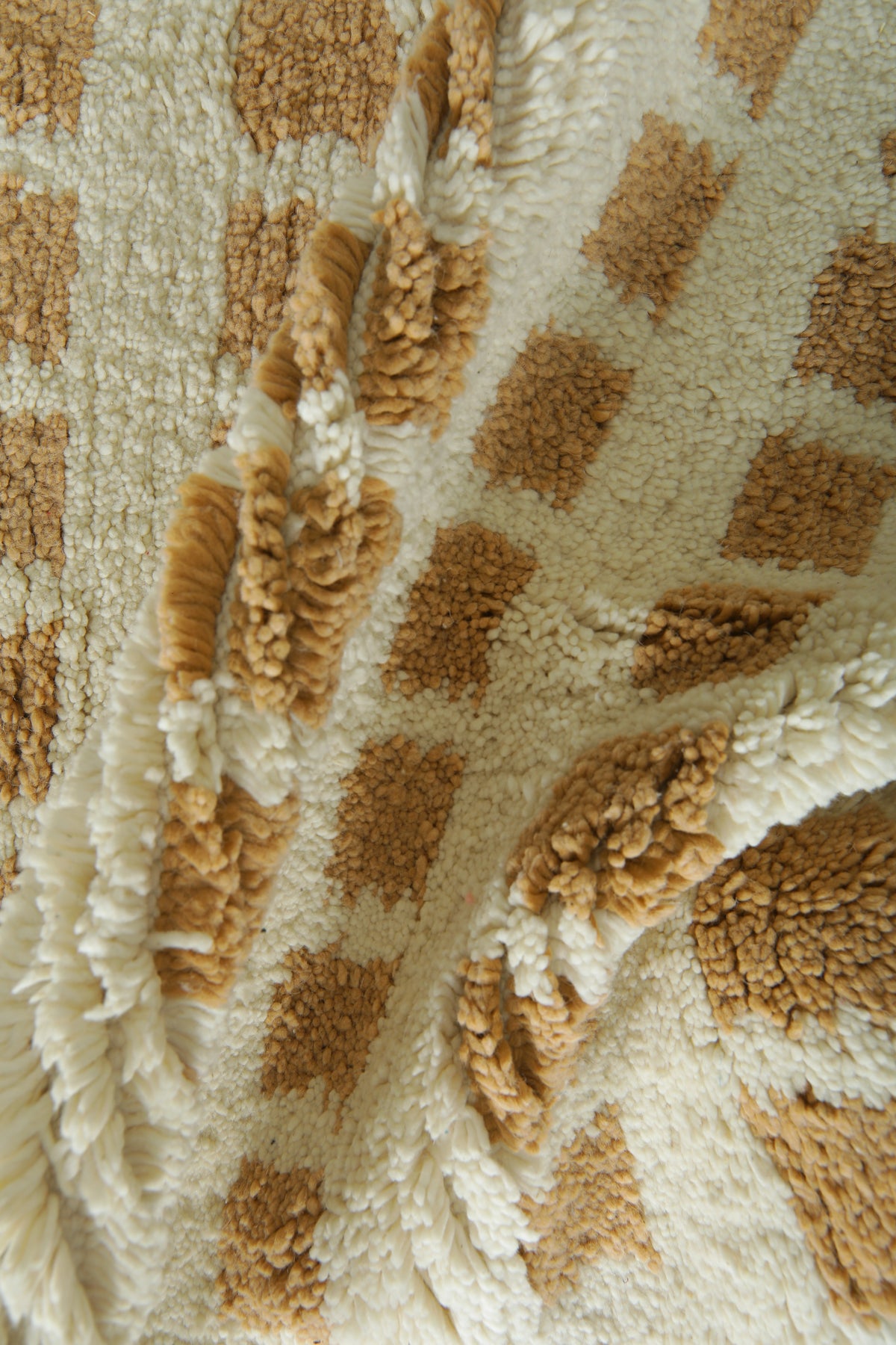 Experience the luxury of an Authentic Beni Ourain Rug, hand-knotted by Berber women in the Atlas Mountains. This rug features an incredibly soft, thick pile made from 100% natural, un-dyed sheep's wool. The design is a minimalist, elegant beige checkered pattern set on a creamy ivory background. Its neutral palette and simple geometric style make it the perfect grounding piece for Scandinavian, Minimalist, and Modern interiors, adding timeless style and warmth.