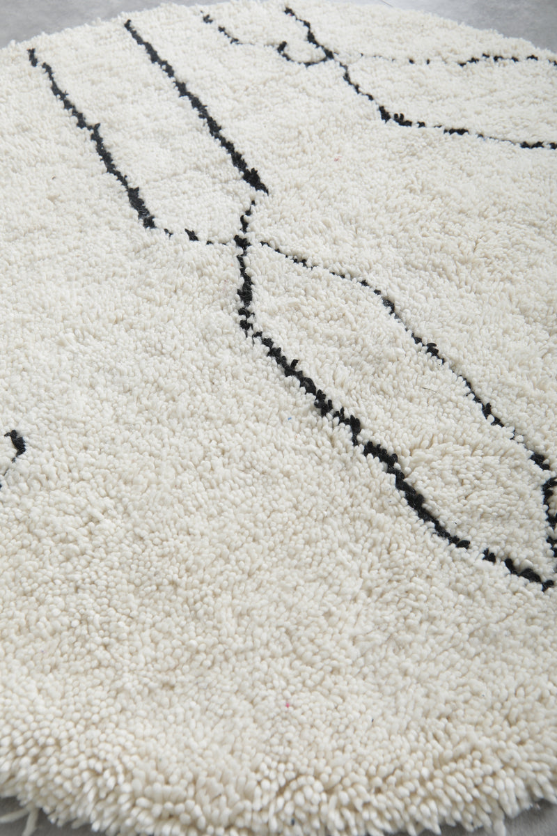 Elevate your interior with this elegant 4 ft round Moroccan rug, featuring a modern Berber-inspired design. Handcrafted by skilled artisans, this rug combines simplicity and sophistication with its minimalist black pattern on a plush white background. Perfect for creating a cozy and stylish ambiance, it is ideal for living rooms, bedrooms, or reading nooks. The soft texture ensures comfort while the durable construction promises long-lasting use.