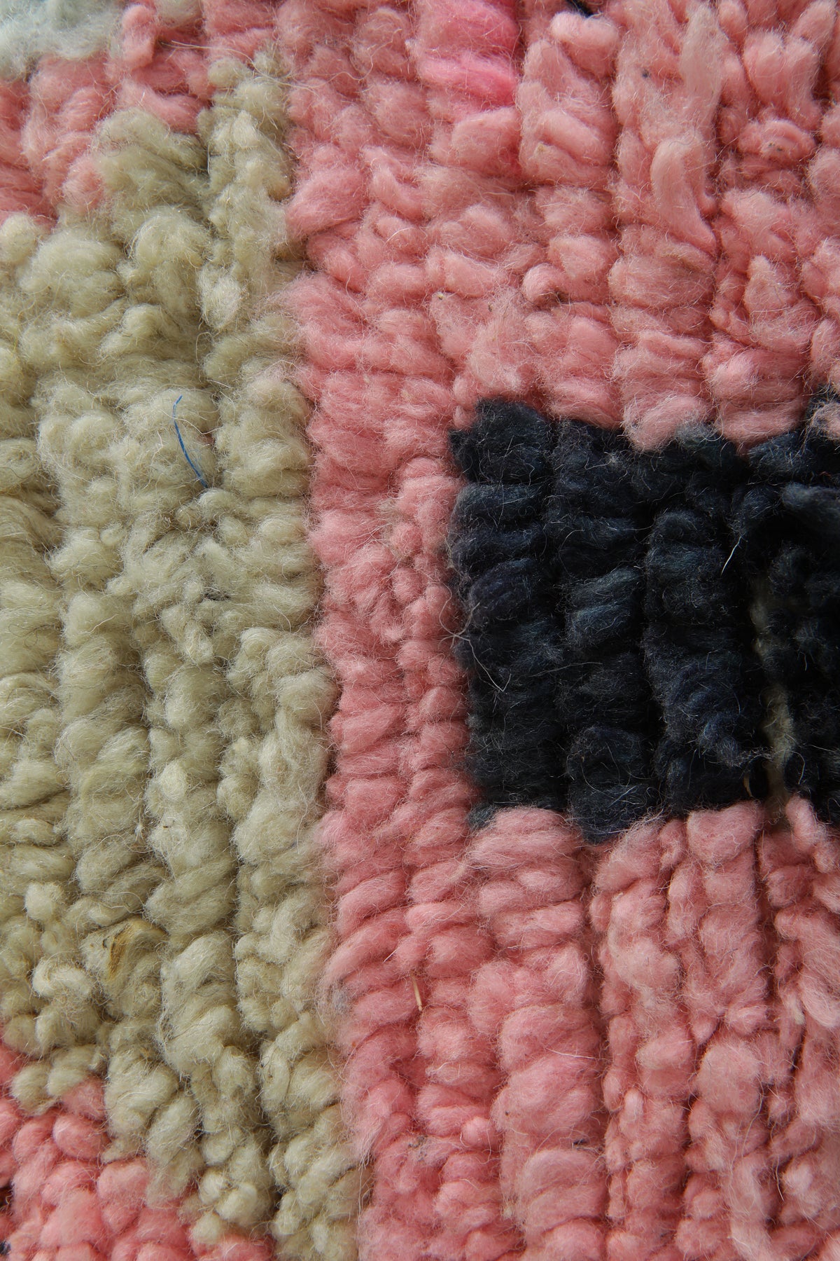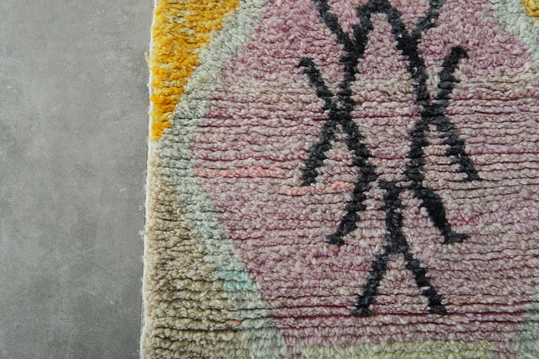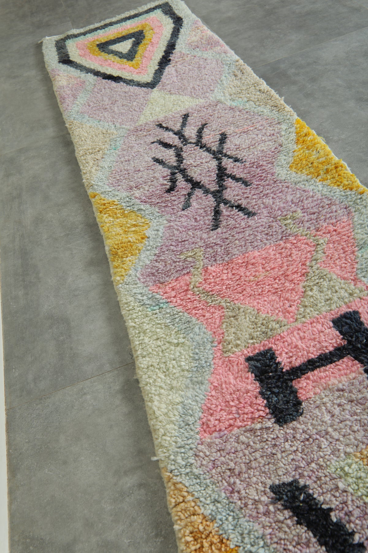 This handcrafted Moroccan runner rug features a striking Azilal-inspired design with geometric and abstract motifs in soft pastel tones—pink, yellow, light blue—contrasted by bold black accents. Woven by Berber artisans, the long and narrow format makes it ideal for hallways, entryways, or alongside a bed. The symmetrical layout includes diamond shapes, arrows, and tribal symbols, with a pointed triangular top and fringe detail at the bottom. Made from natural wool and dyed with mineral-based pigments, this one-of-a-kind piece blends traditional craftsmanship with modern color sensibility—perfect for boho, eclectic, or minimalist interiors.
