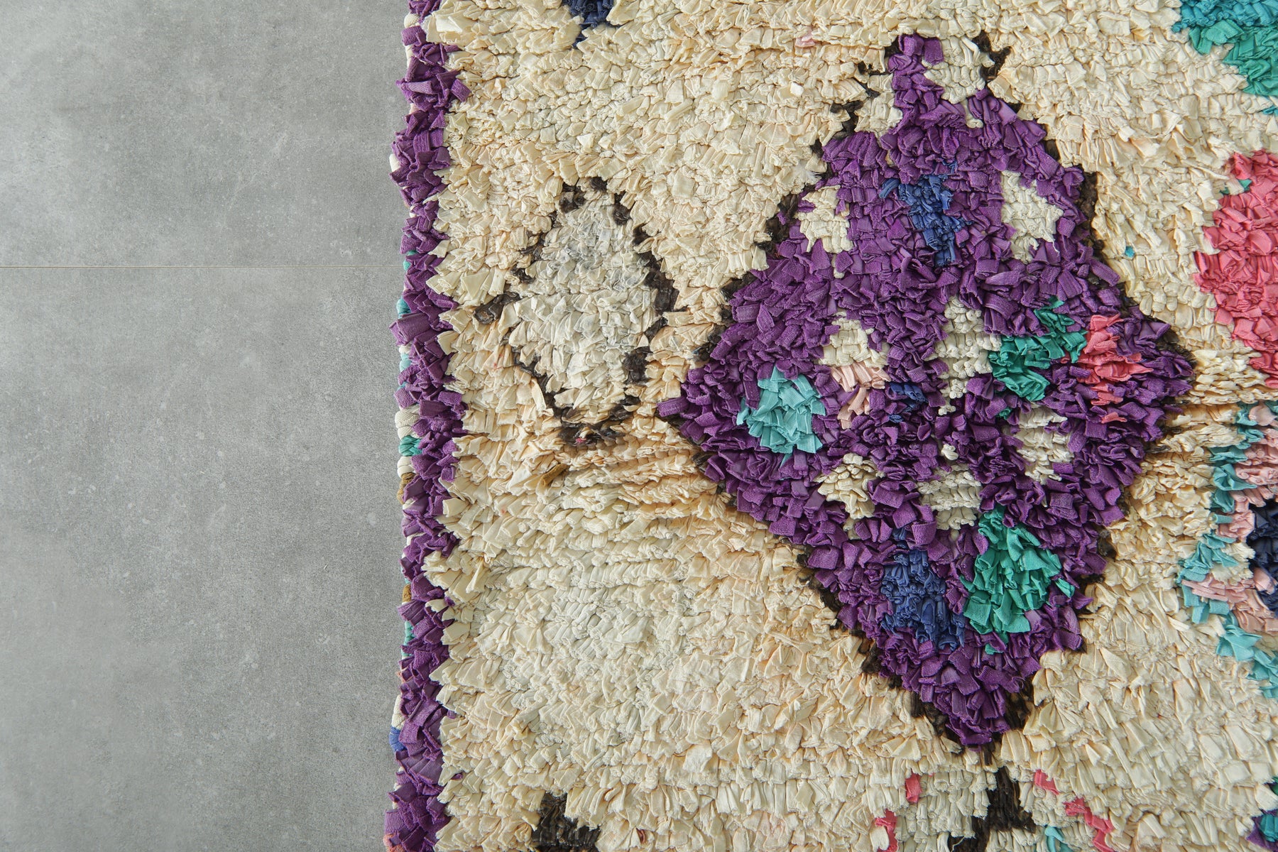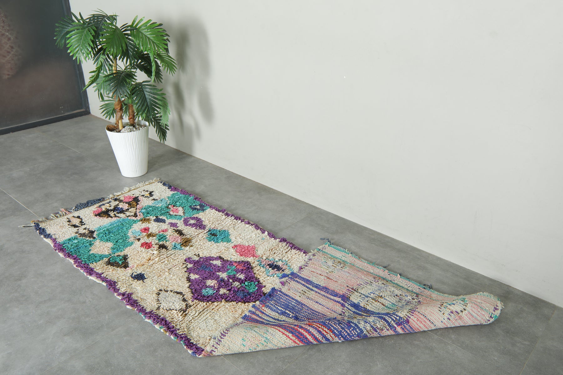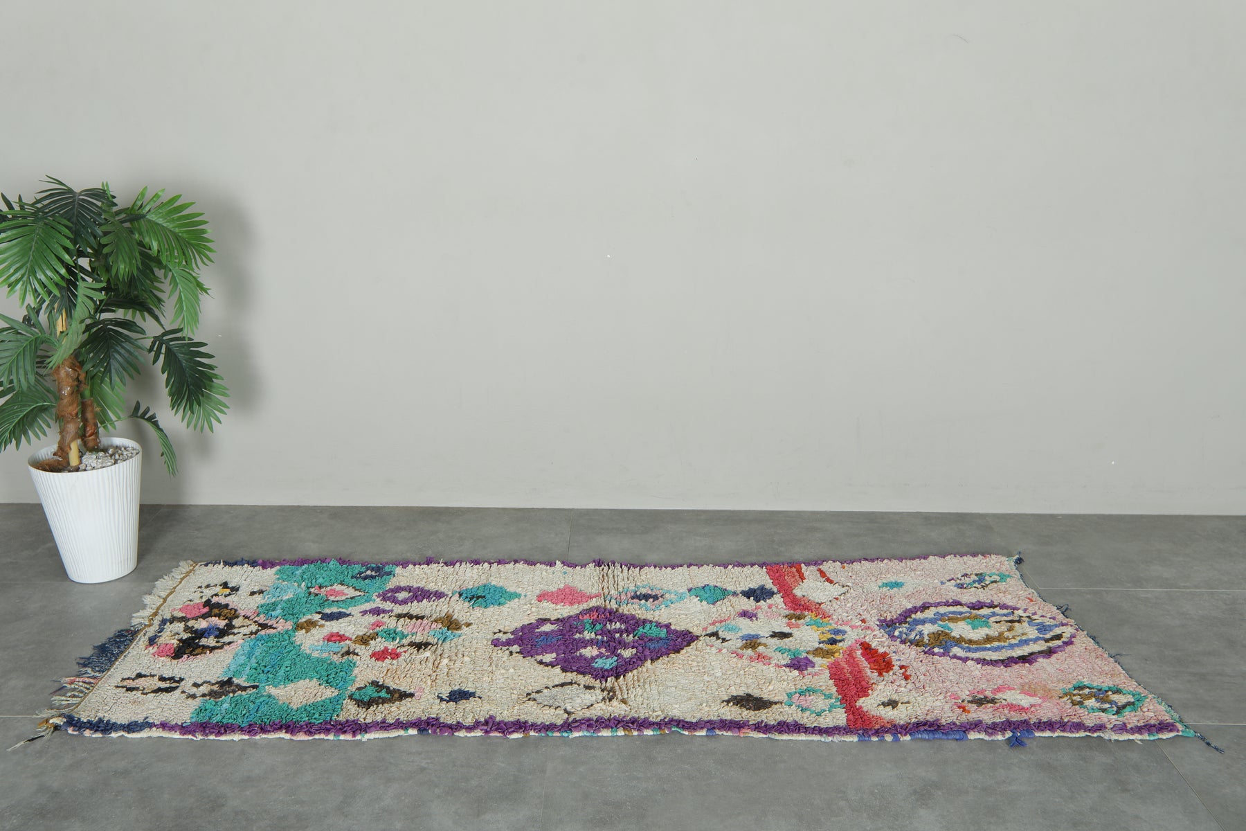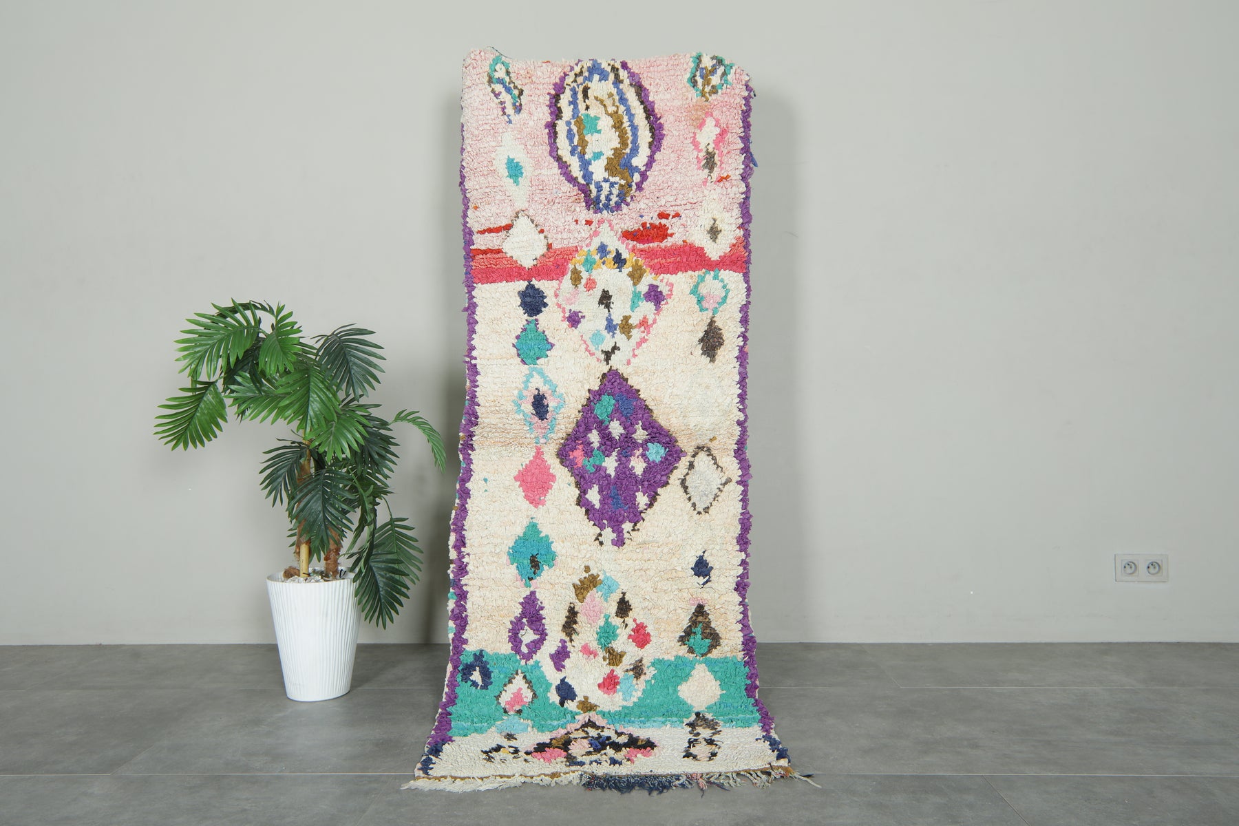 Add a vibrant touch to your home with this authentic Moroccan Boucherouite runner rug, handwoven from recycled textiles by skilled Berber artisans. Featuring a lively mix of pink, purple, turquoise, red, and ivory with bold diamond and abstract motifs, this unique rug brings color, character, and eco-friendly charm to any hallway, entryway, or modern bohemian interior. Its playful patterns and sustainable craftsmanship make it not just a rug, but a true piece of Moroccan art that brightens and personalizes your living space.