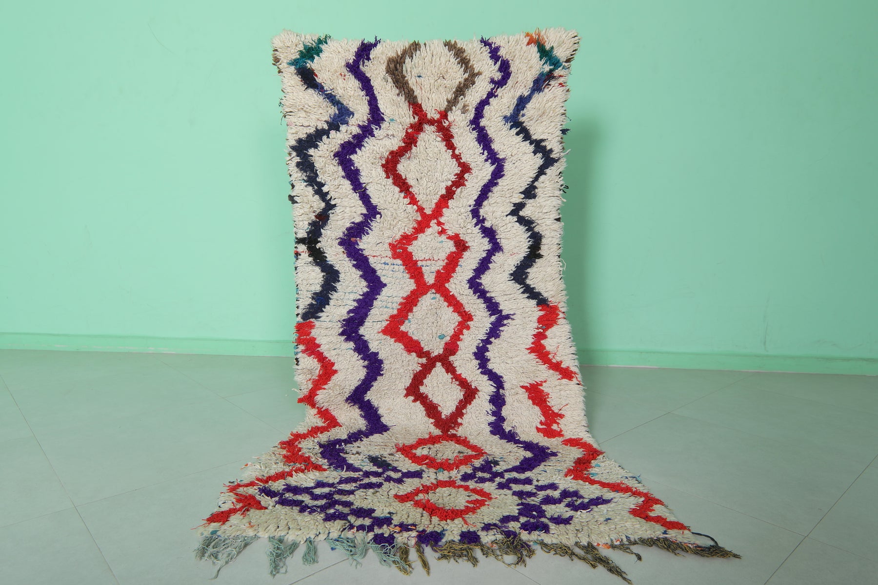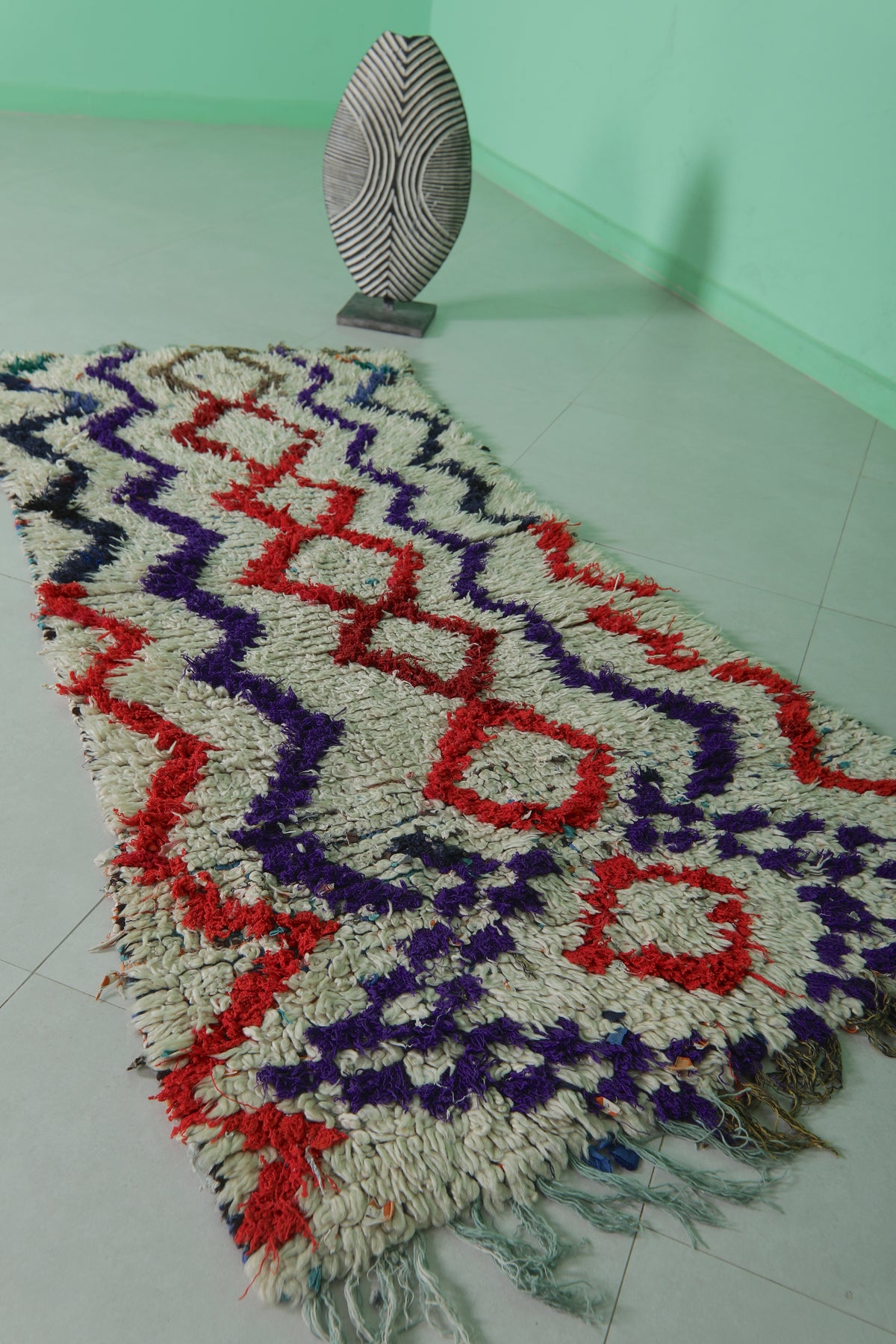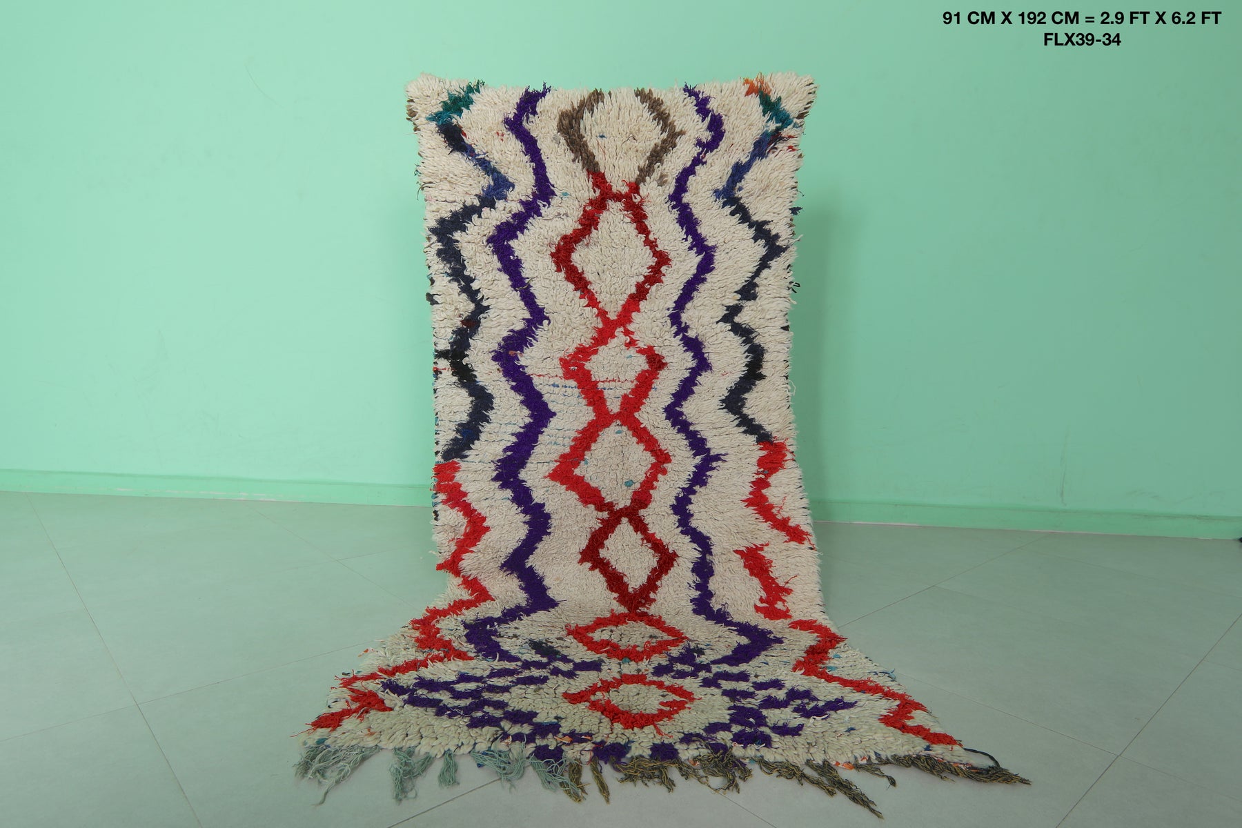 Transform your home with this handwoven Moroccan rug, featuring bold geometric patterns in vibrant red, purple, and blue tones on a cream backdrop. Measuring 2.9 x 6.2 ft, this rug is ideal for enhancing hallways, living rooms, or bedrooms. Its intricate zigzag and diamond-inspired motifs highlight traditional craftsmanship, adding an artistic touch to your decor. Durable and versatile, it combines striking colors and timeless design to create a warm and inviting atmosphere.