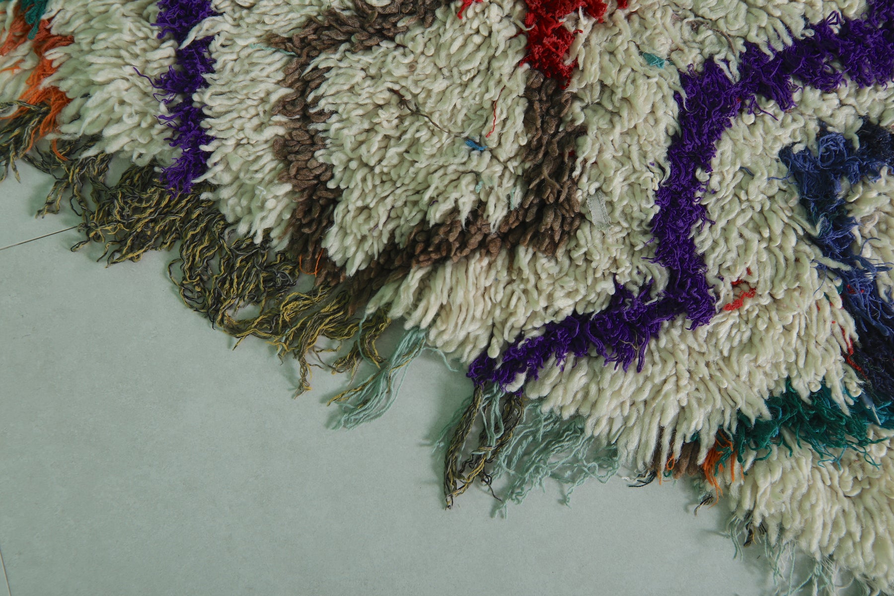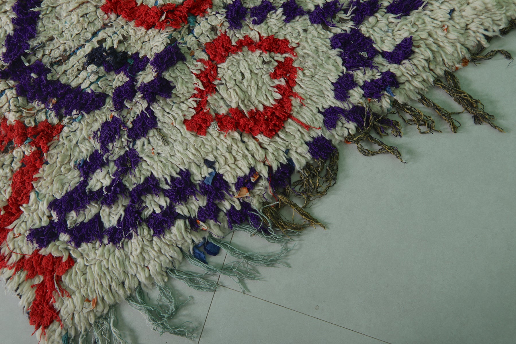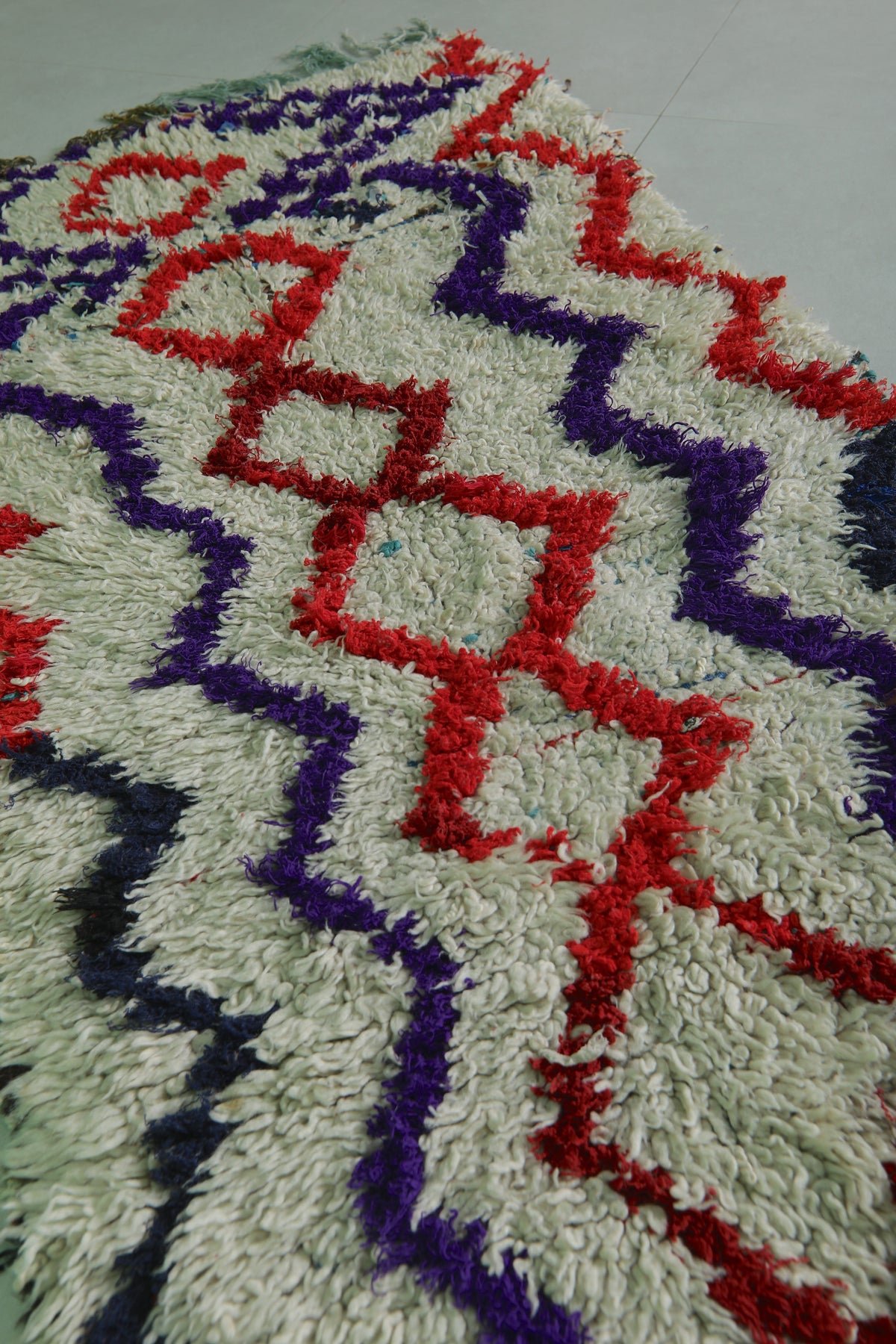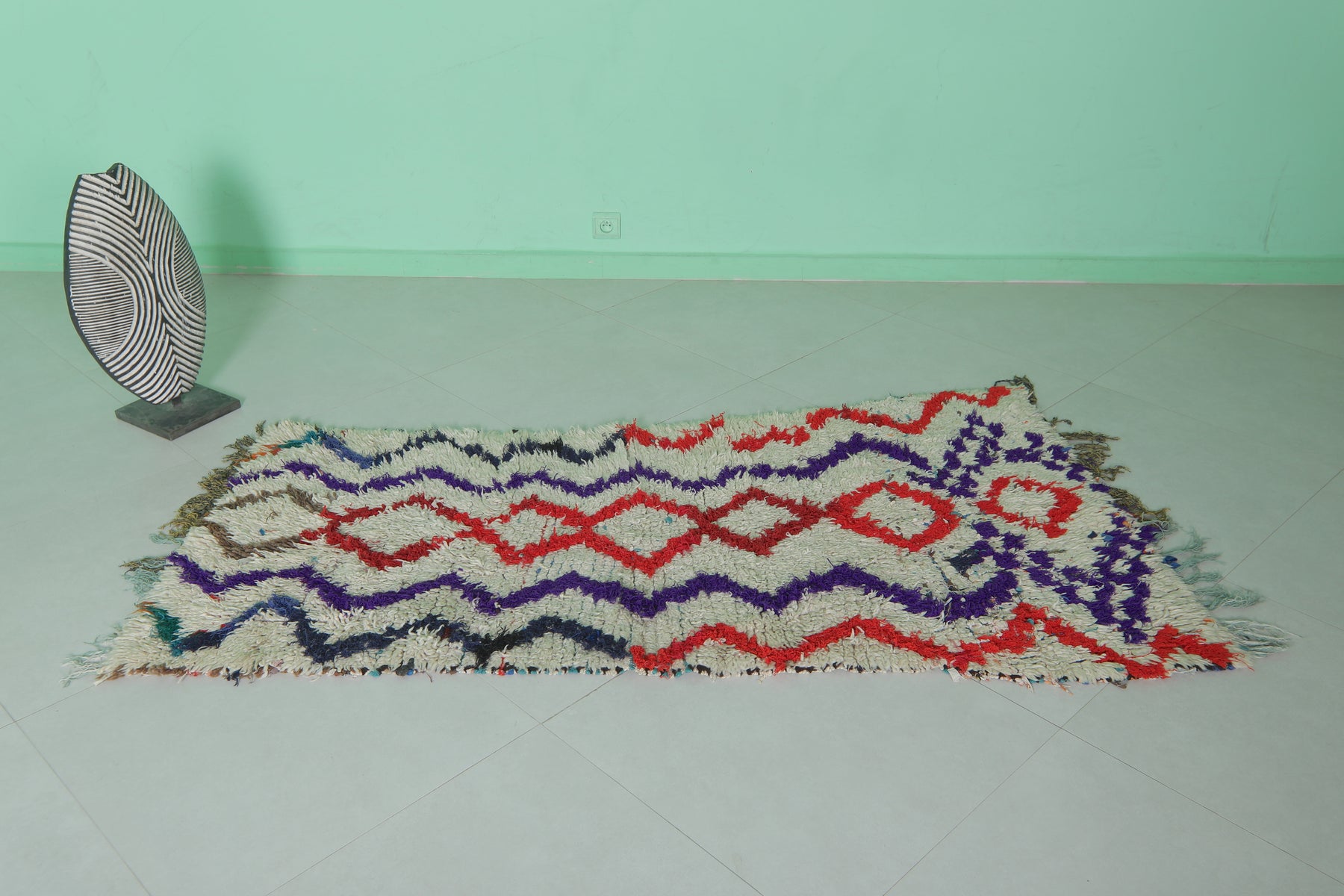 Transform your home with this handwoven Moroccan rug, featuring bold geometric patterns in vibrant red, purple, and blue tones on a cream backdrop. Measuring 2.9 x 6.2 ft, this rug is ideal for enhancing hallways, living rooms, or bedrooms. Its intricate zigzag and diamond-inspired motifs highlight traditional craftsmanship, adding an artistic touch to your decor. Durable and versatile, it combines striking colors and timeless design to create a warm and inviting atmosphere.