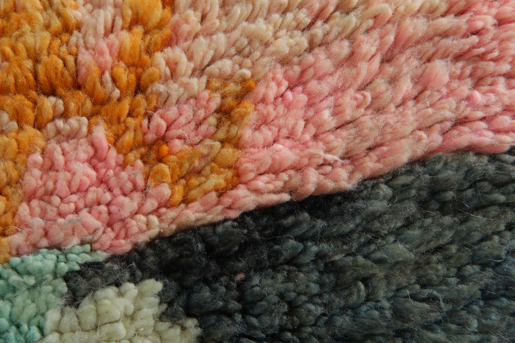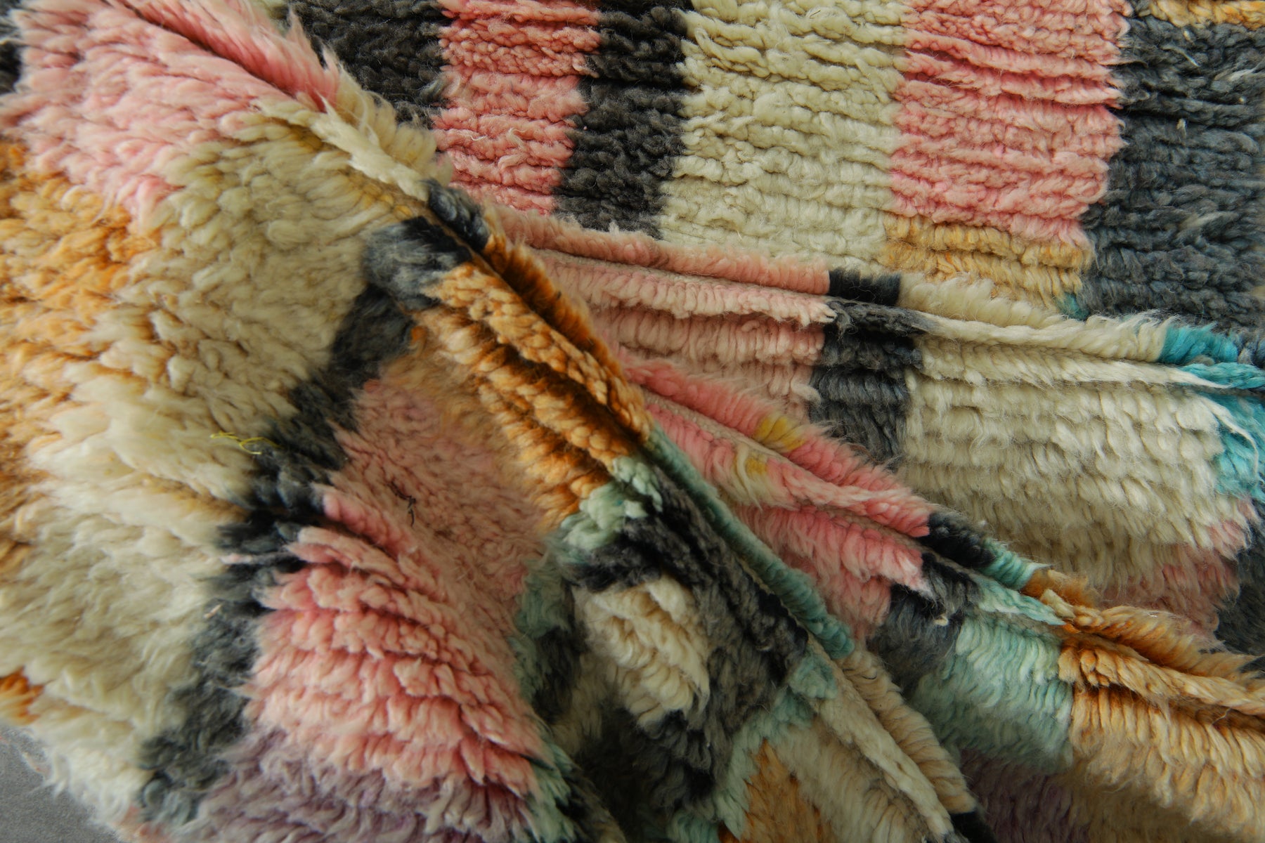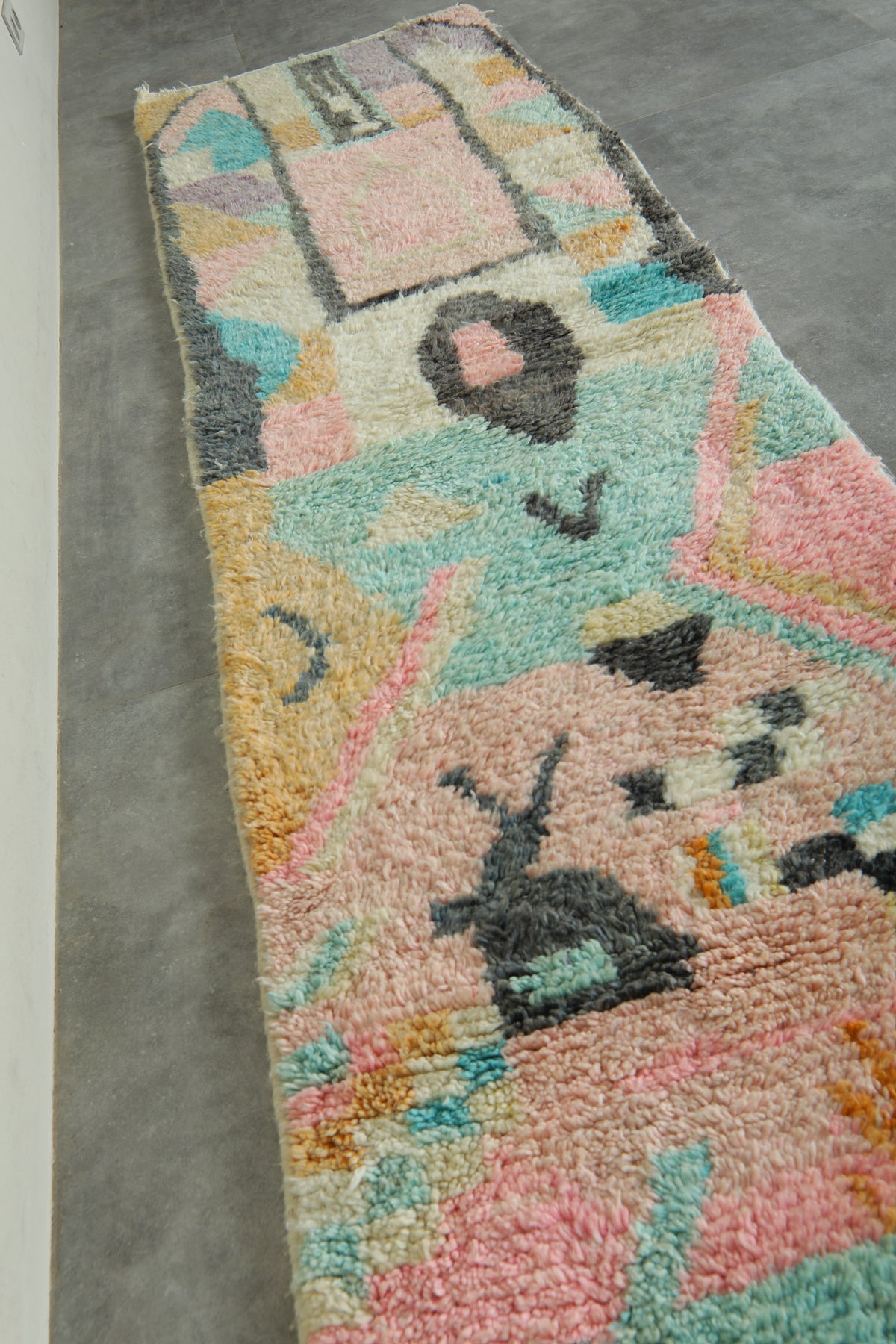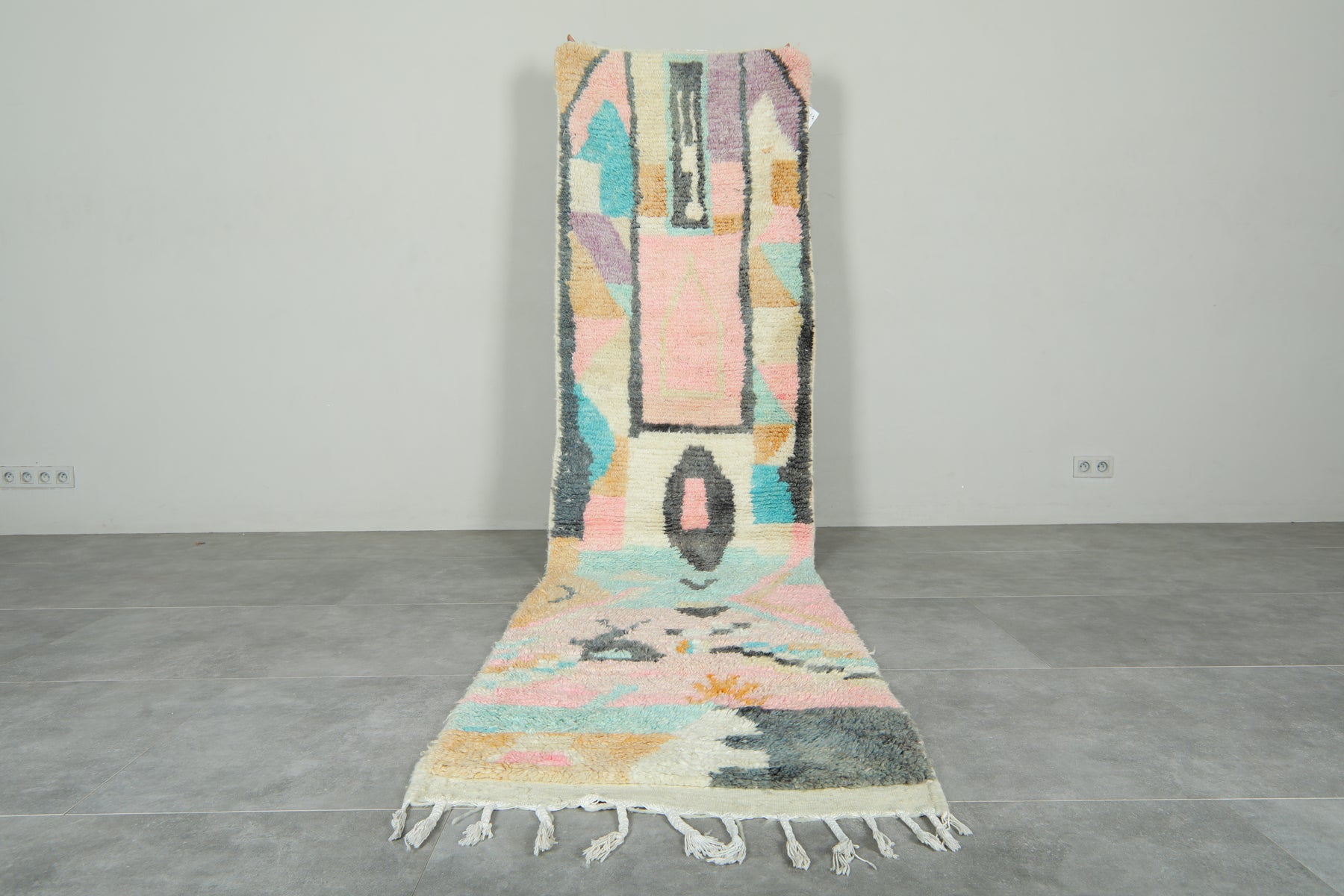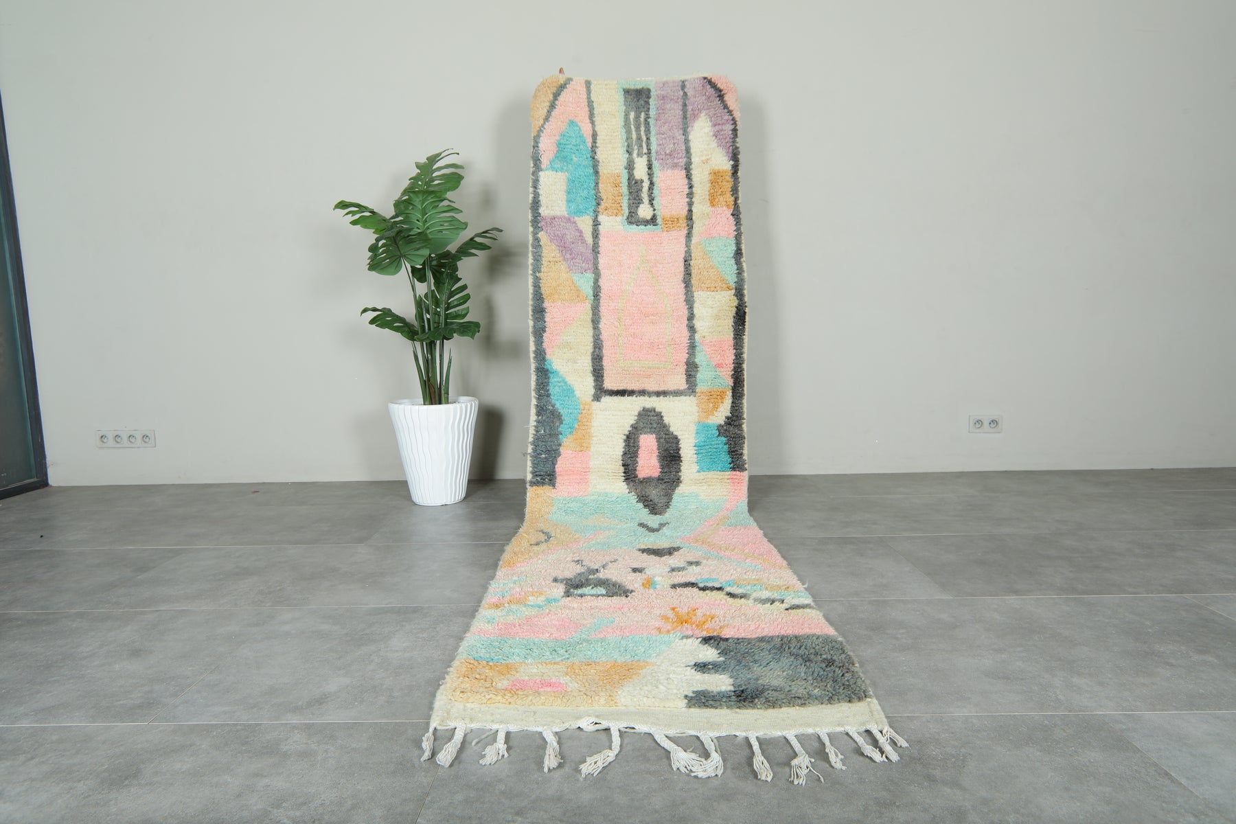 Brighten up your hallway or entryway with this stunning Moroccan runner rug, handwoven from natural wool by Berber artisans. Designed in a Beni Ourain-inspired style, it features a playful pastel geometric pattern with soft tones of pink, mint green, peach, ivory, grey, and turquoise, accented with abstract motifs that bring a modern twist to traditional Moroccan craftsmanship.