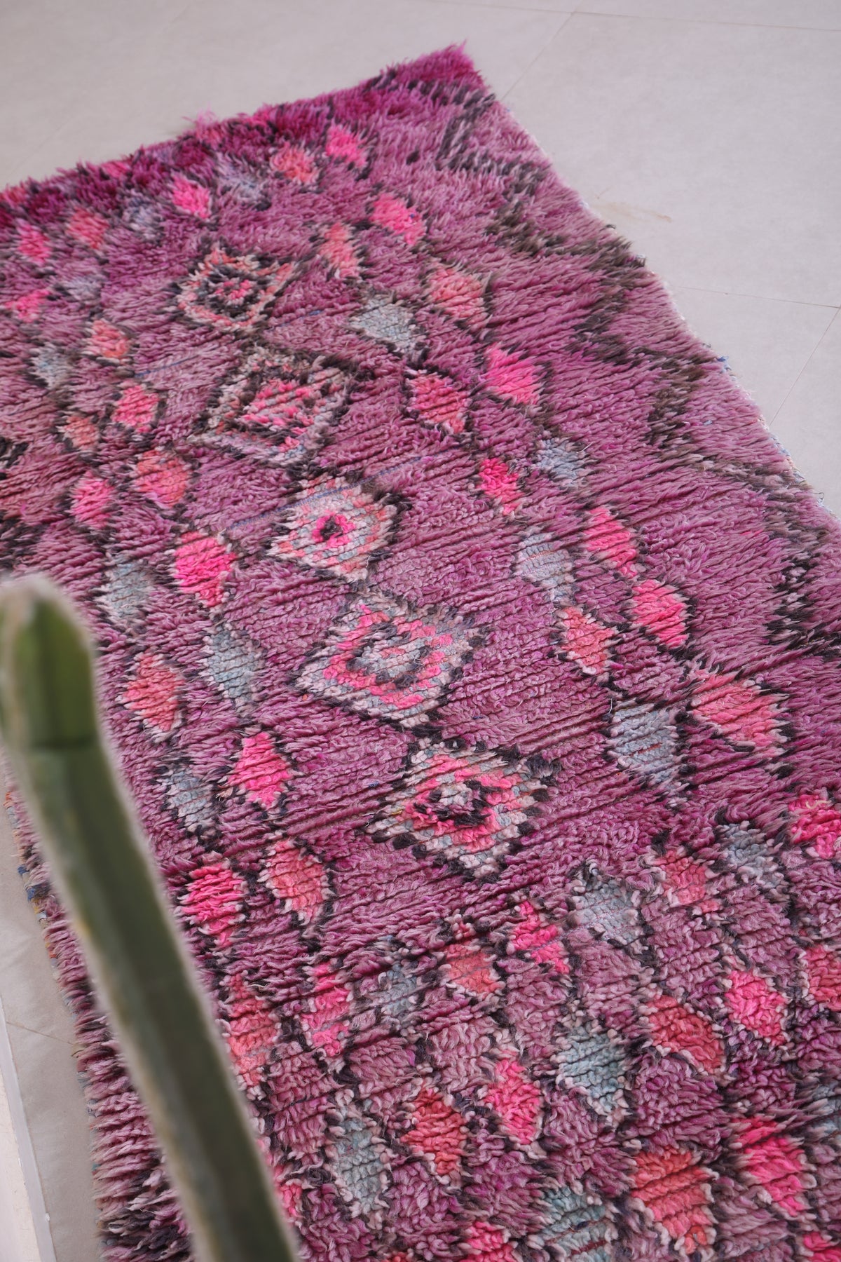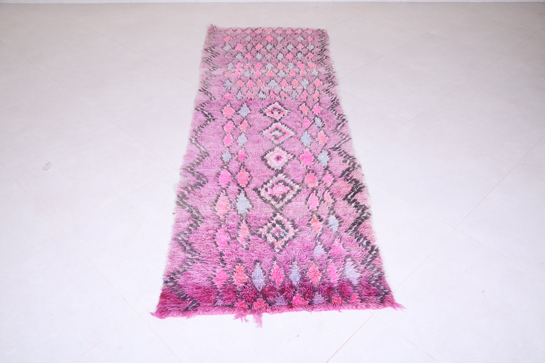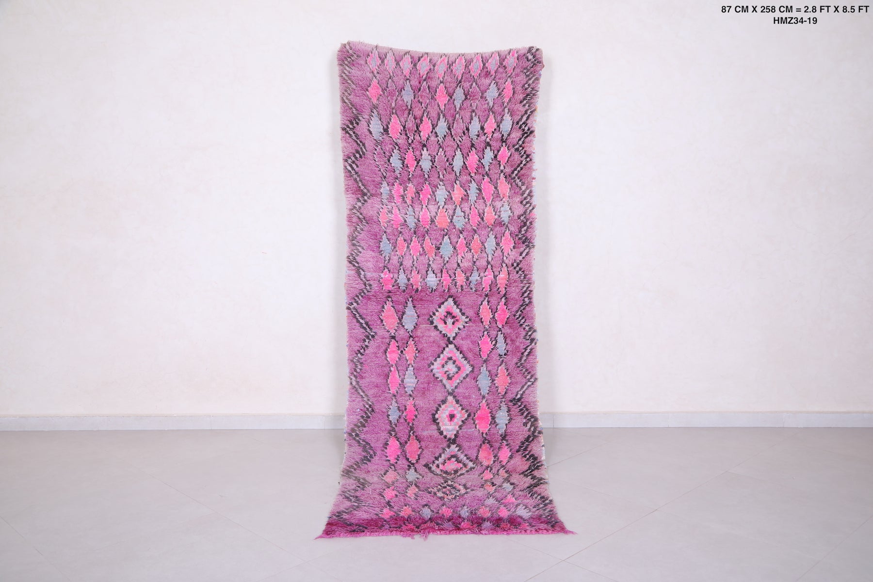 Make a bold statement with this Purple Moroccan Runner Rug (2.8 x 8.5 FT), a vibrant handmade piece featuring rich magenta tones, diamond motifs, and layered texture for a striking boho-chic vibe.