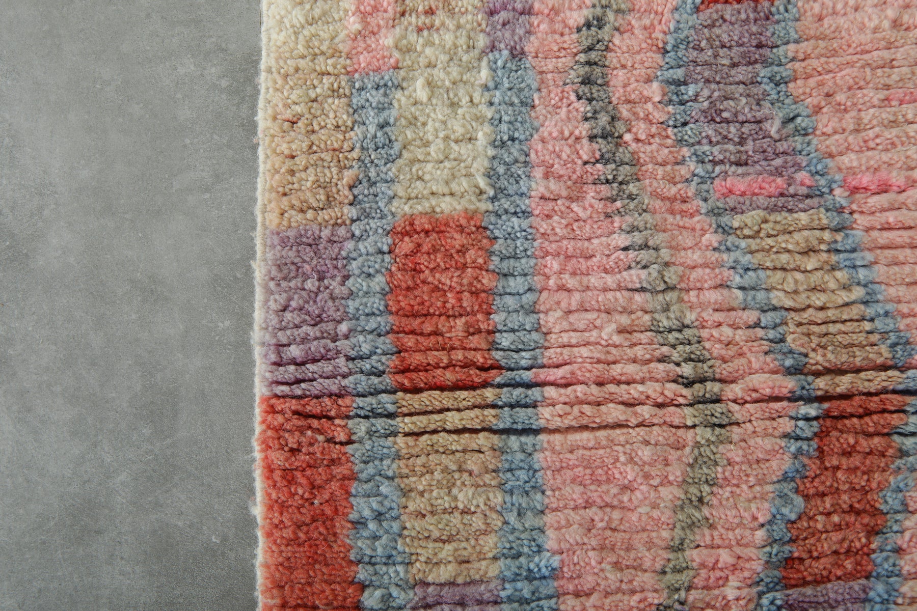 Transform narrow spaces with this handcrafted Moroccan runner rug, featuring soothing pastel hues and a subtle zigzag motif. Designed with soft shades of blush pink, sky blue, cream, and coral, this runner adds warmth and artistic flair to hallways, entryways, kitchens, or bedside areas.