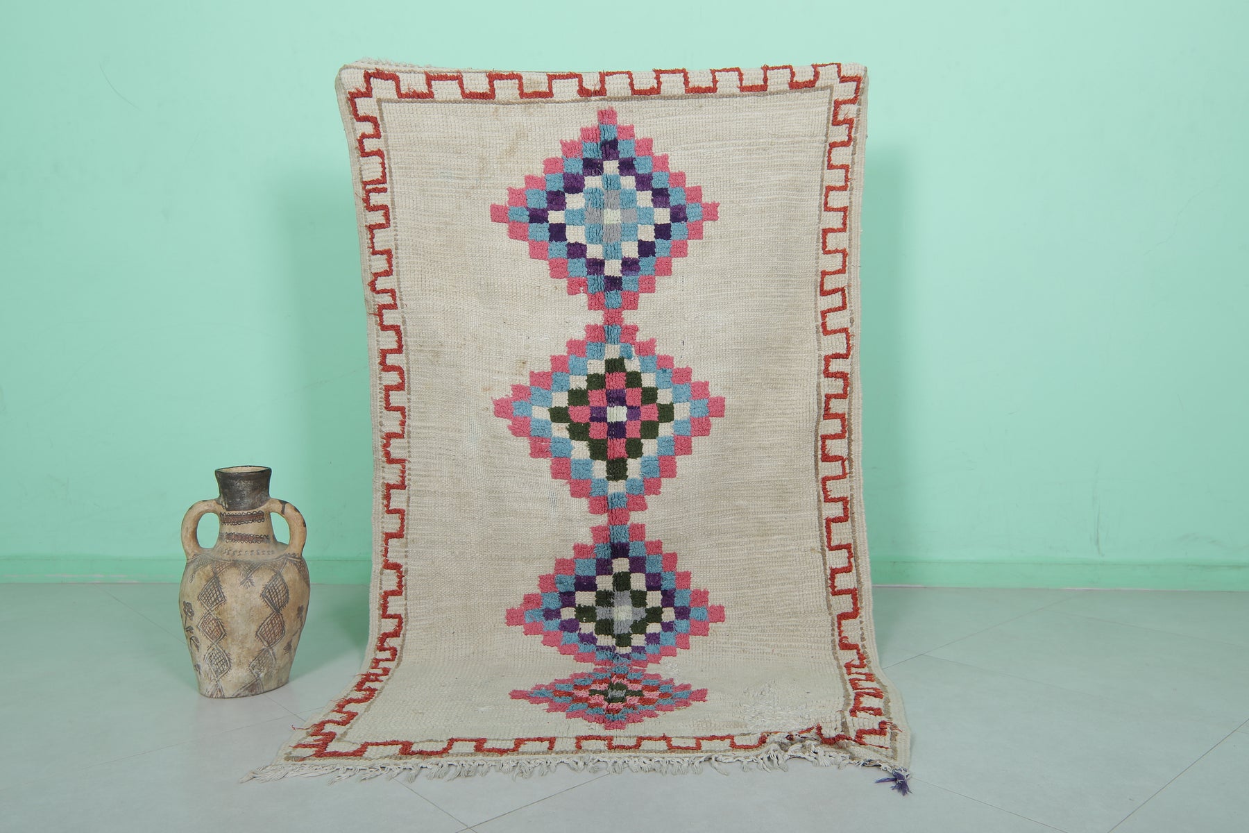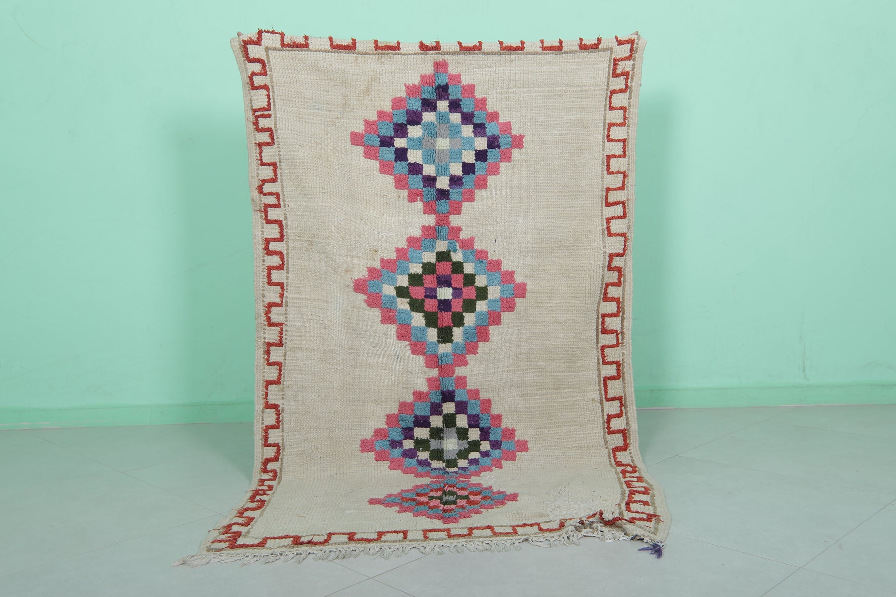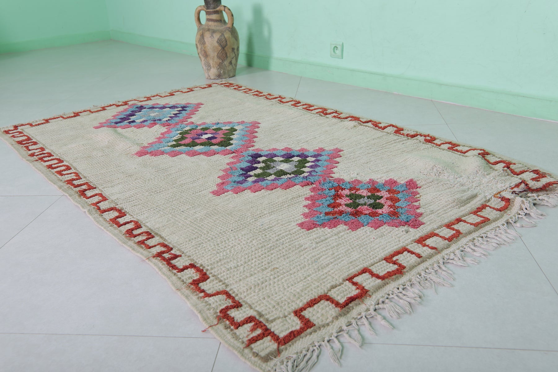 Add vintage elegance and bold pattern to your space with this Handmade Moroccan Berber Runner Rug, sized at 3.7 x 6.2 feet. Expertly woven in Morocco, this eye-catching rug features three stacked diamond medallions in rich jewel tones, centered on a soft beige background. A vivid red geometric border frames the piece, enhancing its tribal charm. Perfect for entryways, living rooms, or reading nooks, this rug brings handcrafted heritage and striking design into any home.