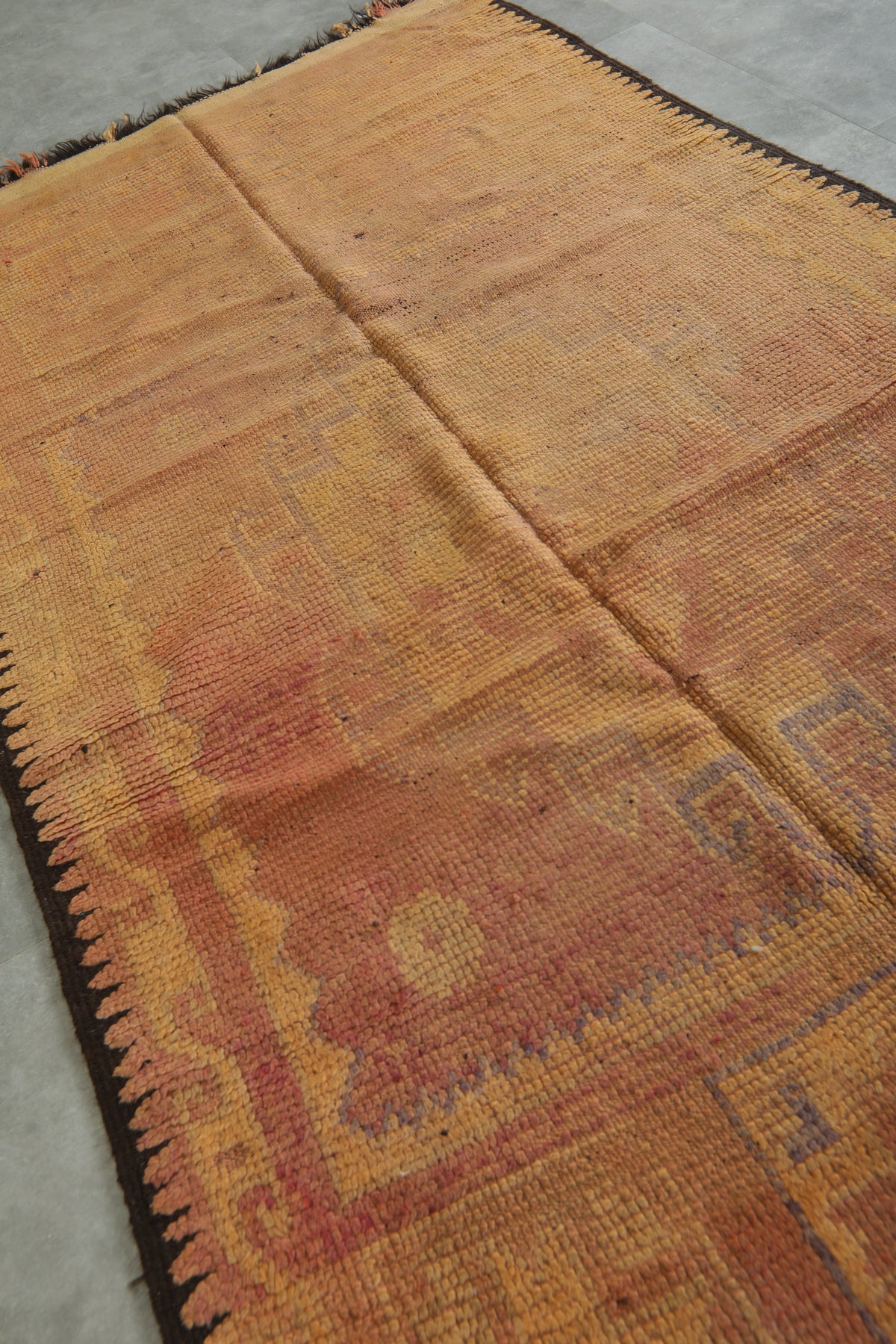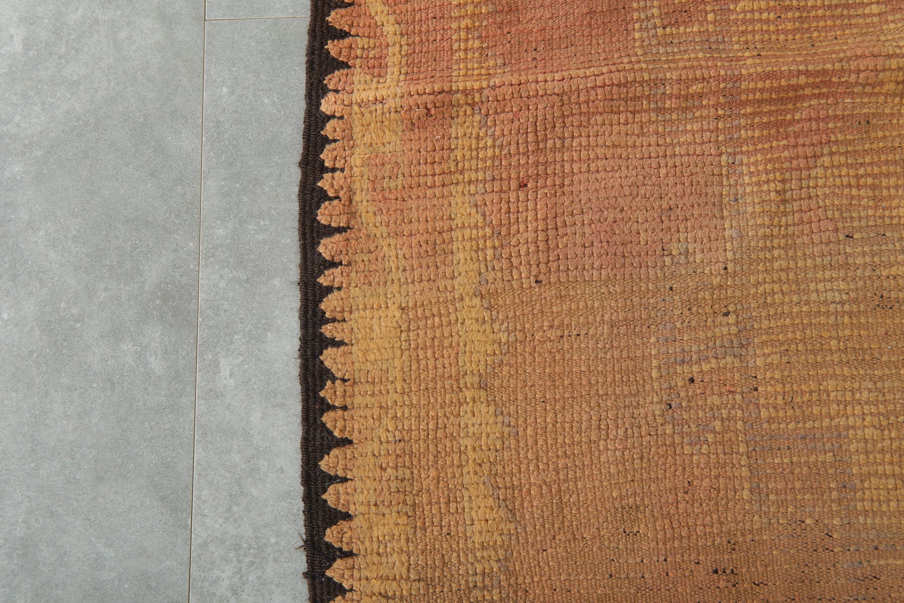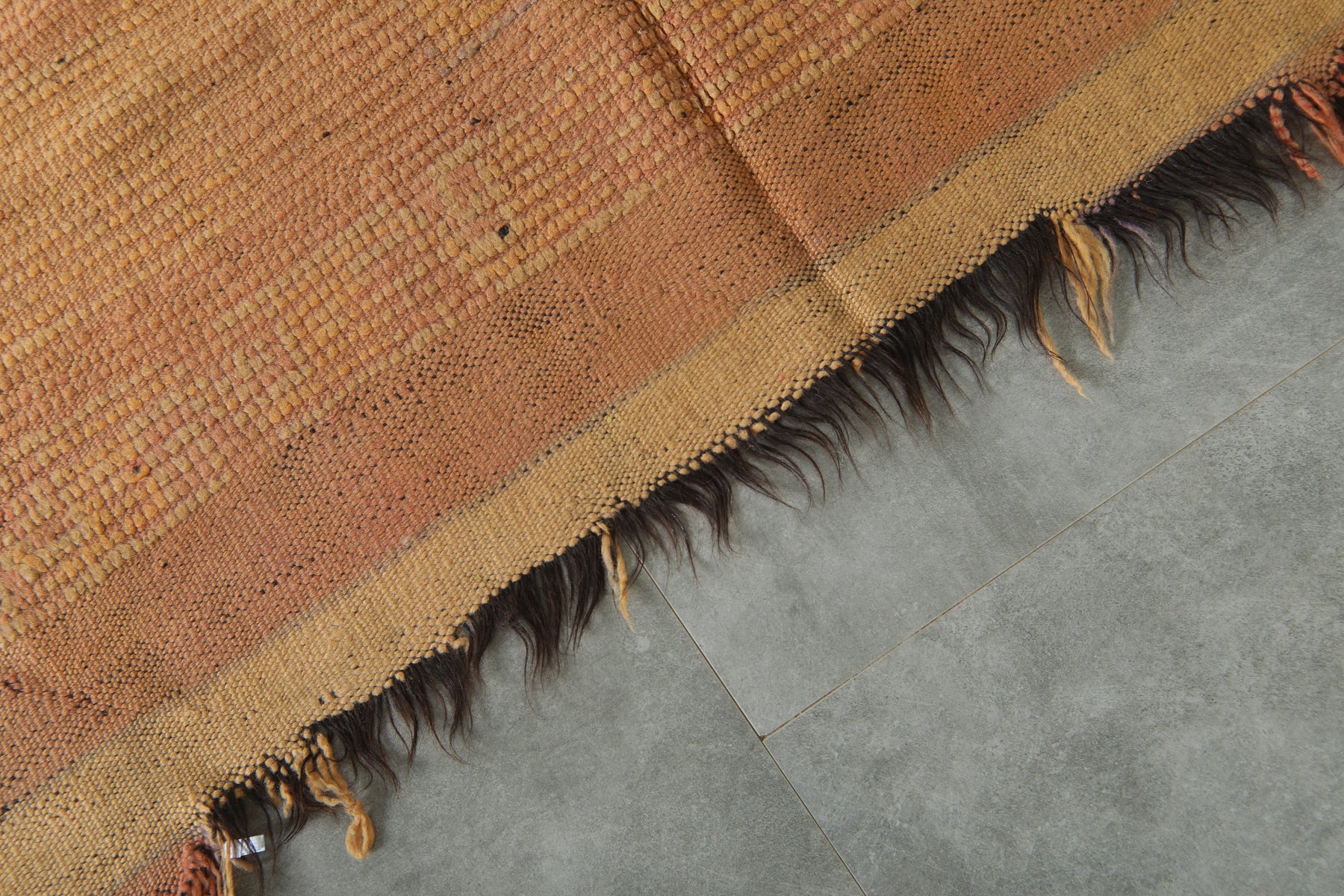 Discover the quiet beauty of this handmade Moroccan Kilim rug. A genuine flat-weave Berber rug, this piece showcases a stunning palette of beige and gold. Its minimalist geometric patterns and distinct dark border create a refined look perfect for boho home decor and rustic interiors. As a vintage area rug, it adds texture and history to your space without overwhelming it, making it an excellent choice for a living room, bedroom, or hallway.