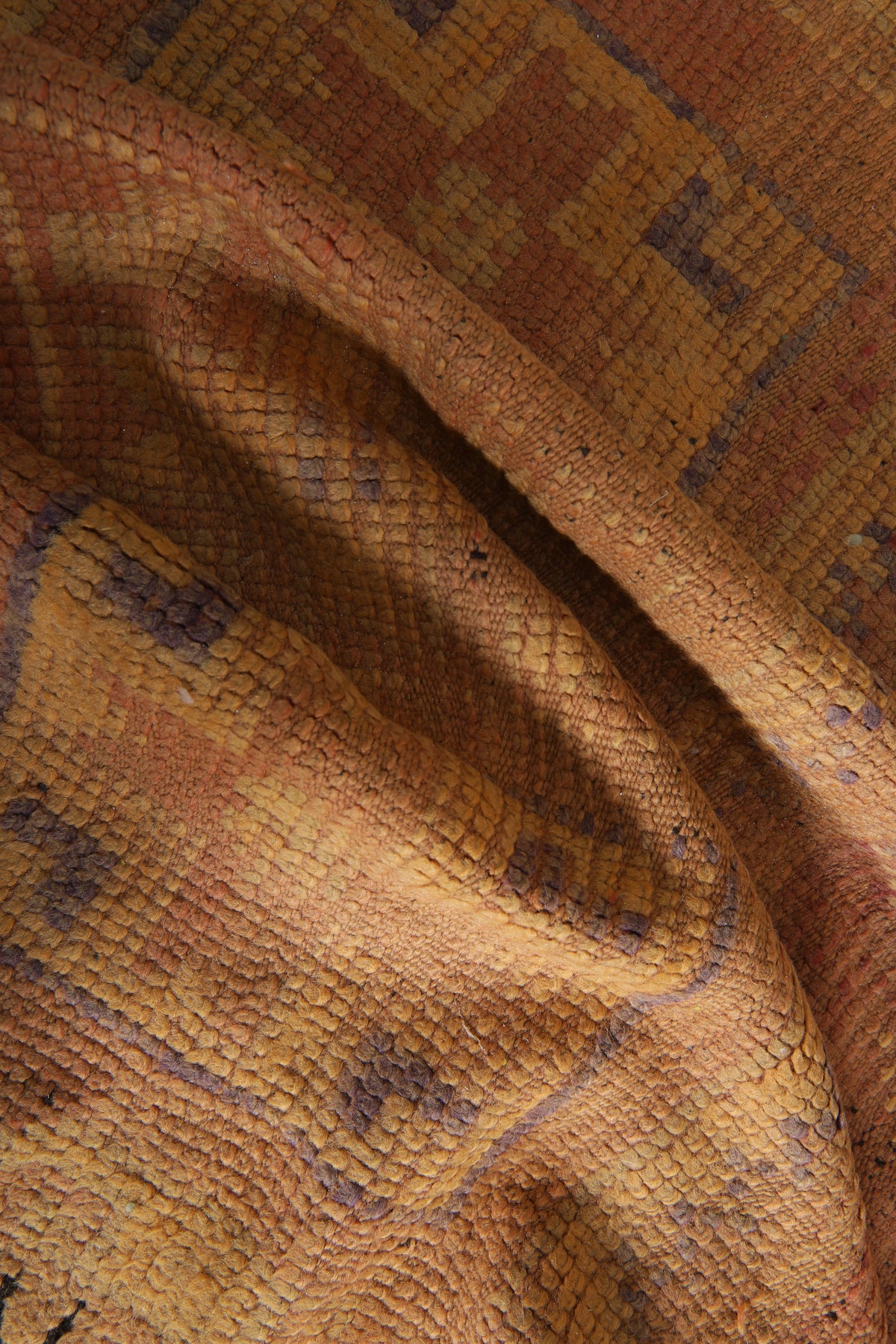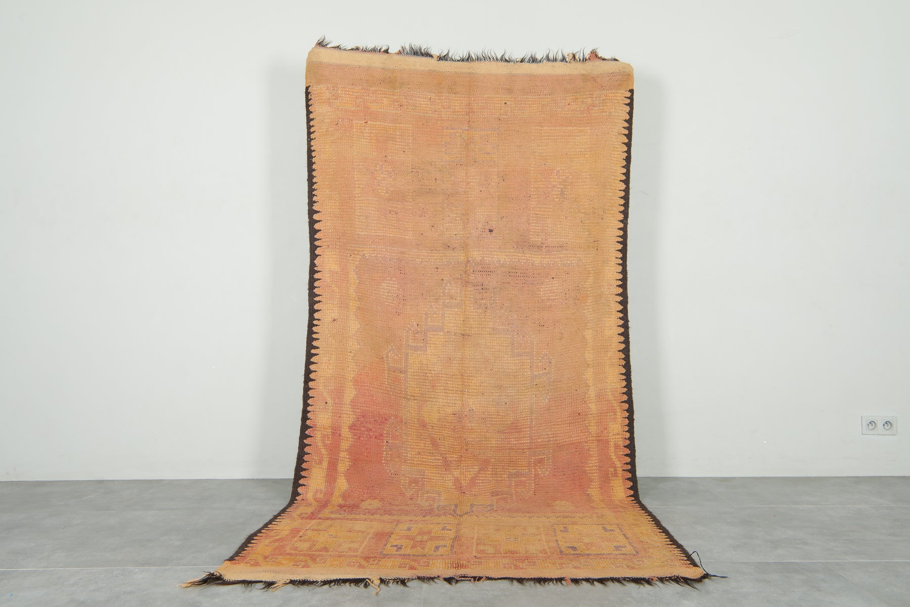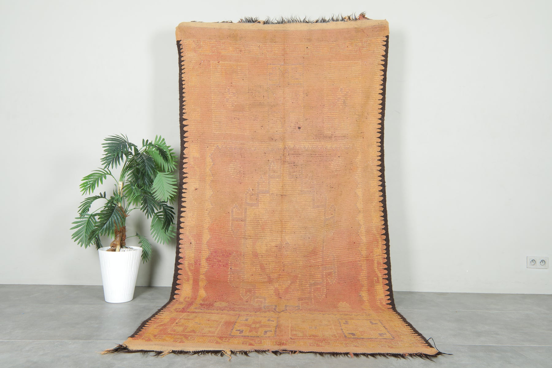 Discover the quiet beauty of this handmade Moroccan Kilim rug. A genuine flat-weave Berber rug, this piece showcases a stunning palette of beige and gold. Its minimalist geometric patterns and distinct dark border create a refined look perfect for boho home decor and rustic interiors. As a vintage area rug, it adds texture and history to your space without overwhelming it, making it an excellent choice for a living room, bedroom, or hallway.