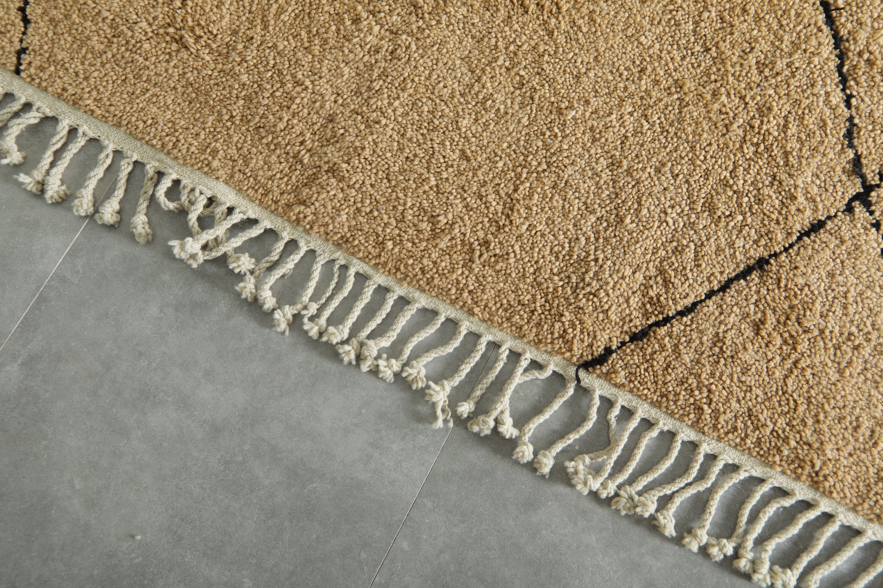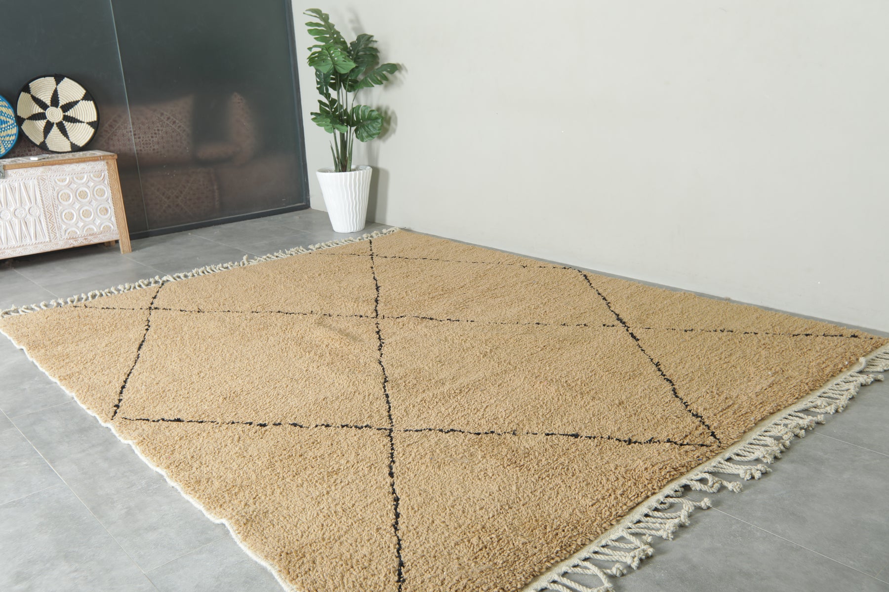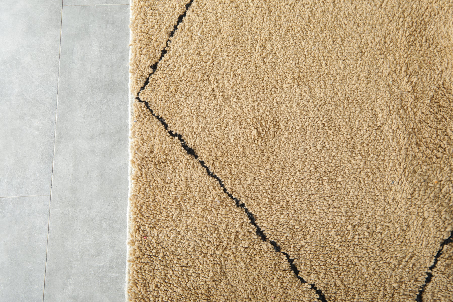 Timeless and understated, this handwoven Moroccan beni ourain rug features a warm beige wool base accented by a minimalist black diamond lattice. The geometric pattern evokes classic Berber symbolism while maintaining a clean, modern aesthetic. Finished with soft off-white fringe, it brings texture and authenticity to any space.