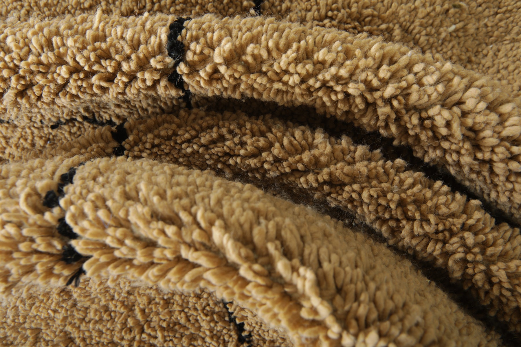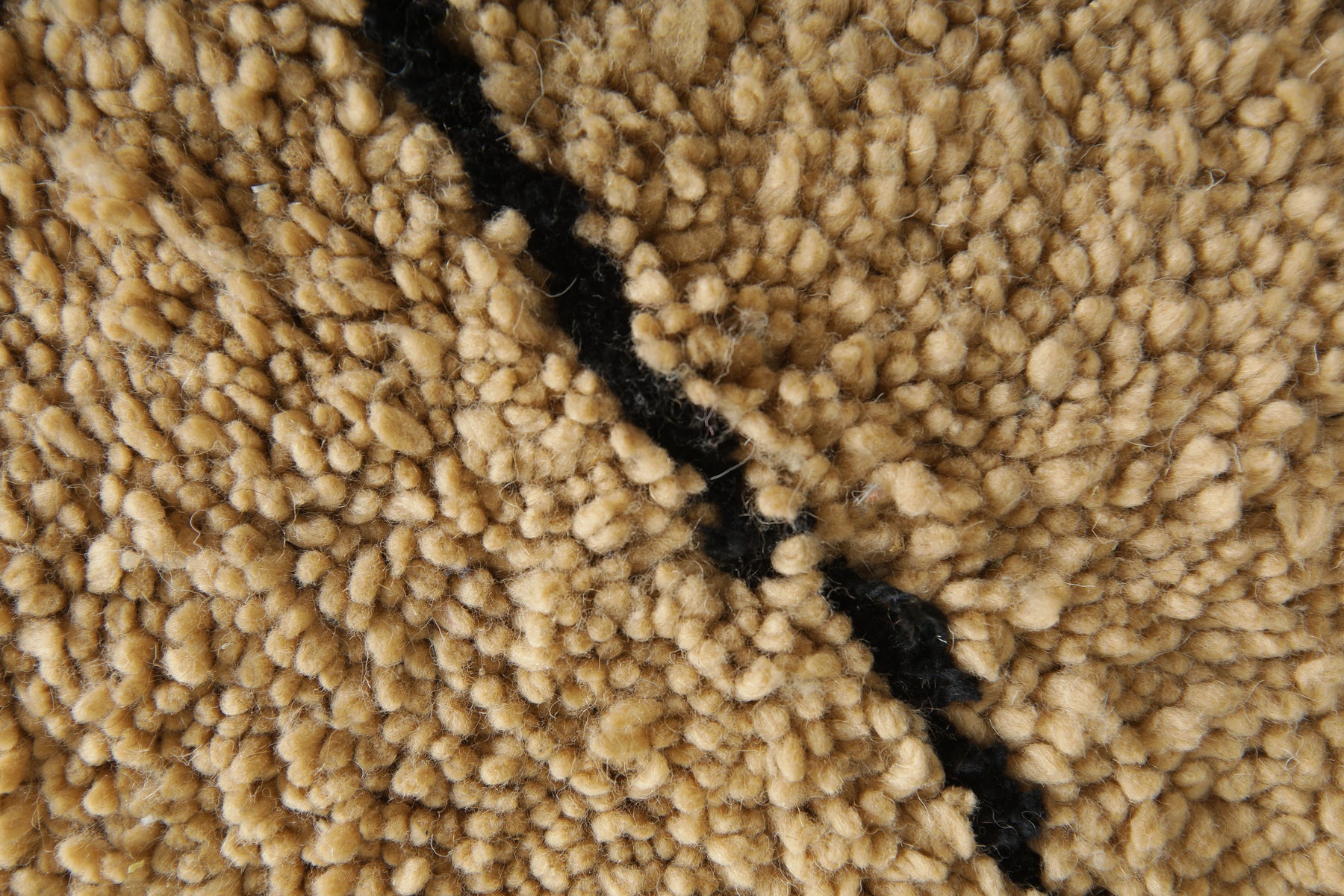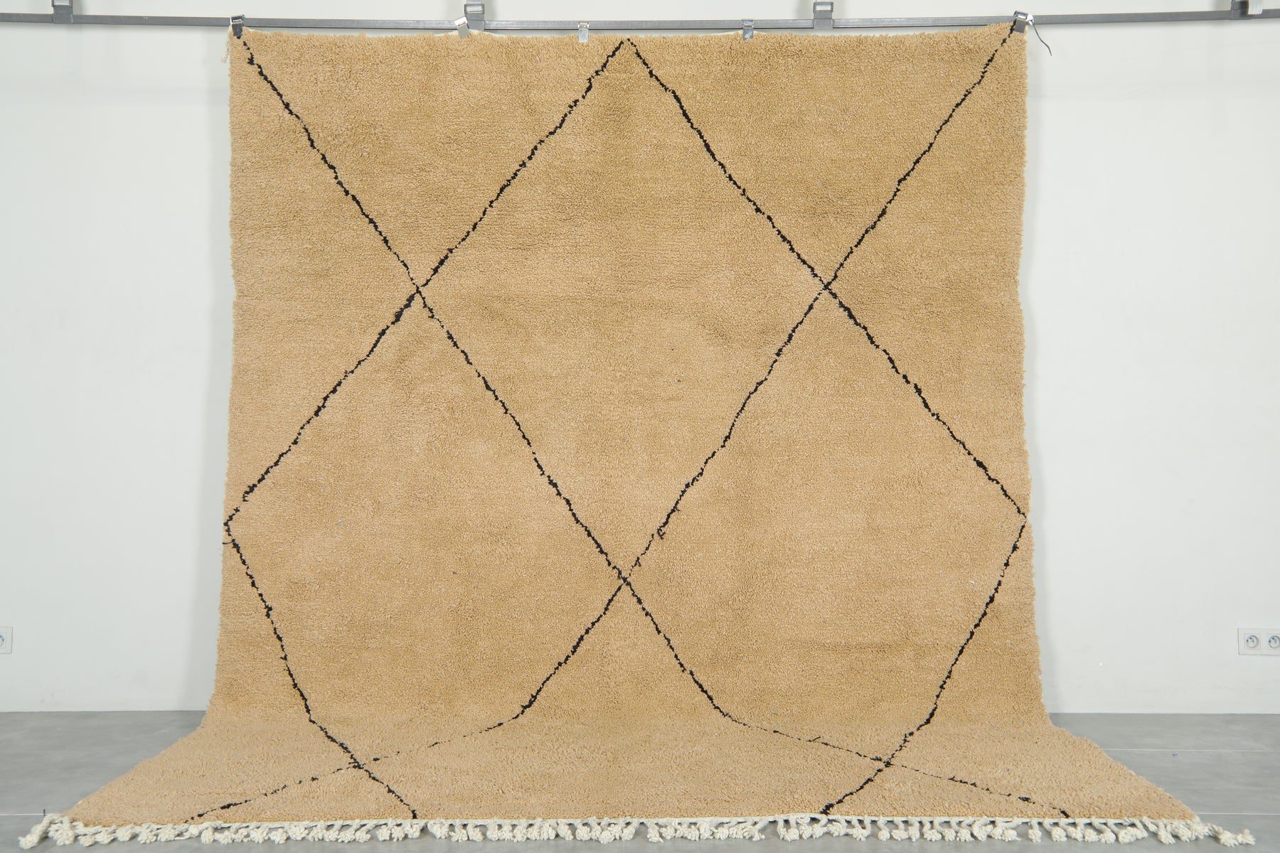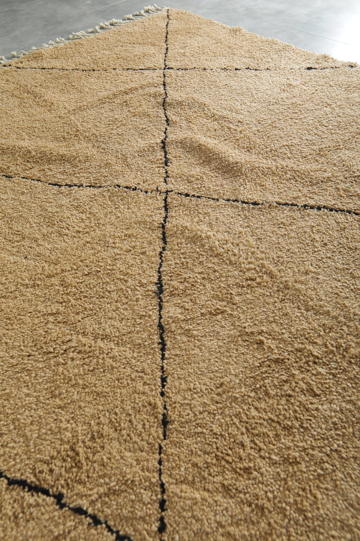 Timeless and understated, this handwoven Moroccan beni ourain rug features a warm beige wool base accented by a minimalist black diamond lattice. The geometric pattern evokes classic Berber symbolism while maintaining a clean, modern aesthetic. Finished with soft off-white fringe, it brings texture and authenticity to any space.