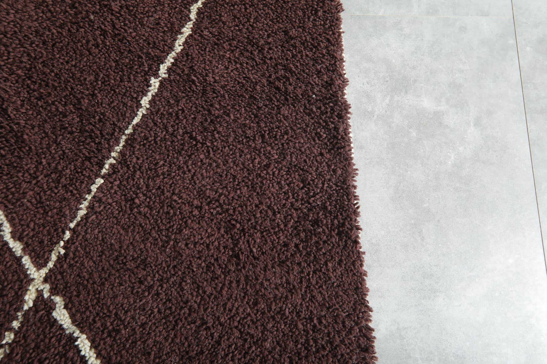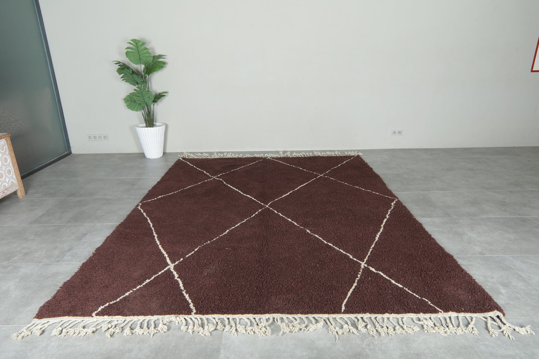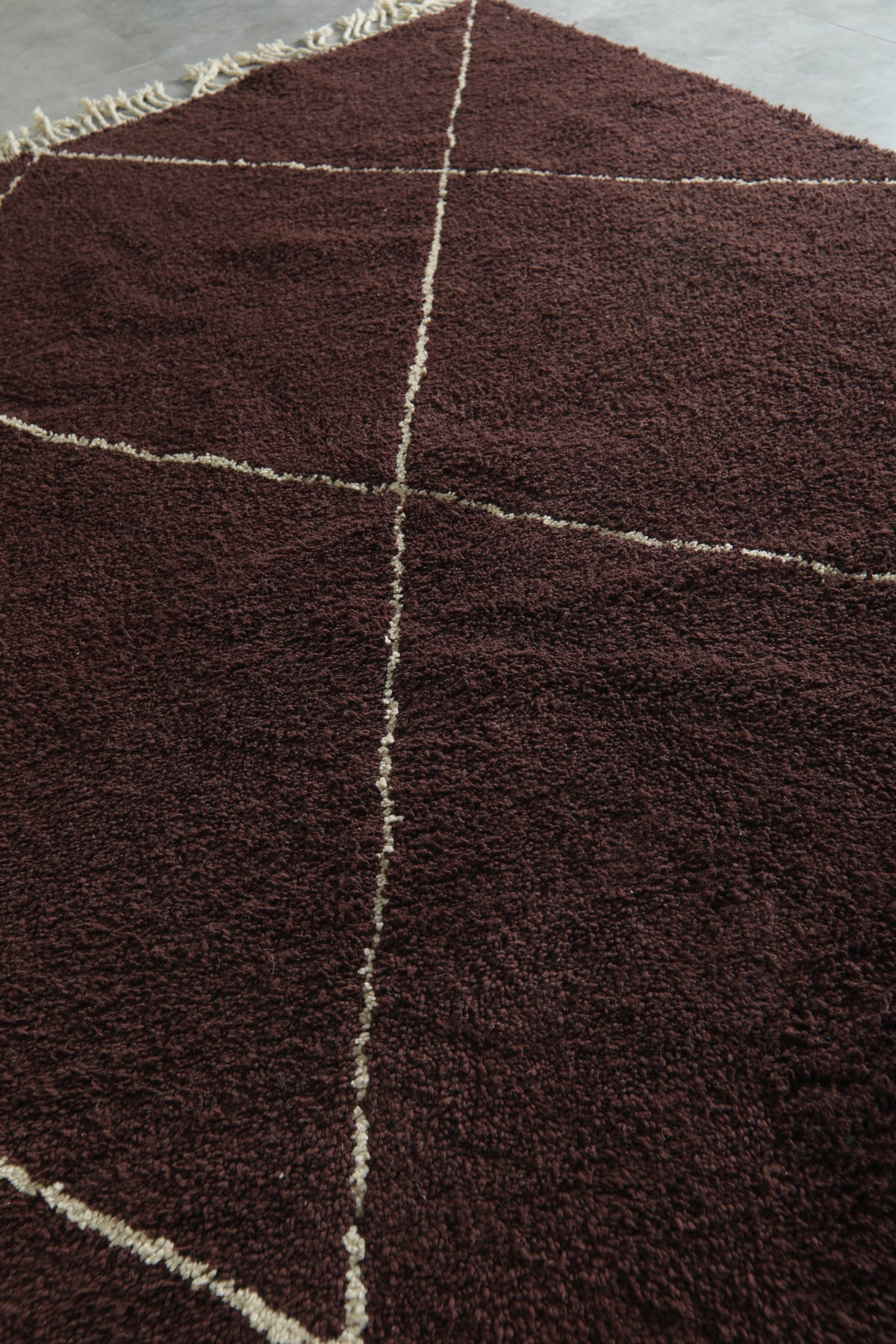 Grounded and graphic, this handwoven Moroccan Beni Ourain rug features a deep brown wool base with crisp white lines forming a classic diamond lattice. Its shaggy texture adds warmth and depth, while the hand-knotted fringe offers a touch of traditional Berber craftsmanship. The bold contrast and earthy tone make it a striking centerpiece—perfect for modern, rustic, or bohemian interiors seeking texture and authenticity.