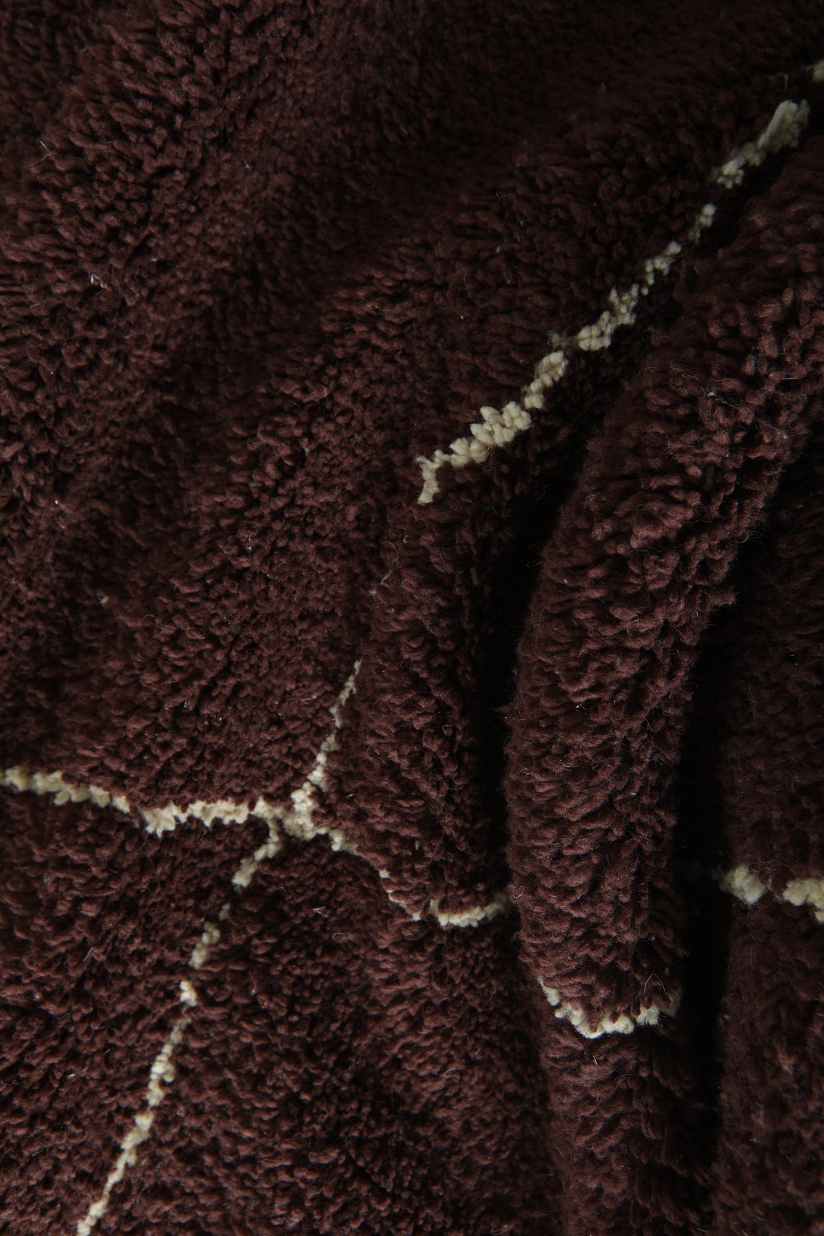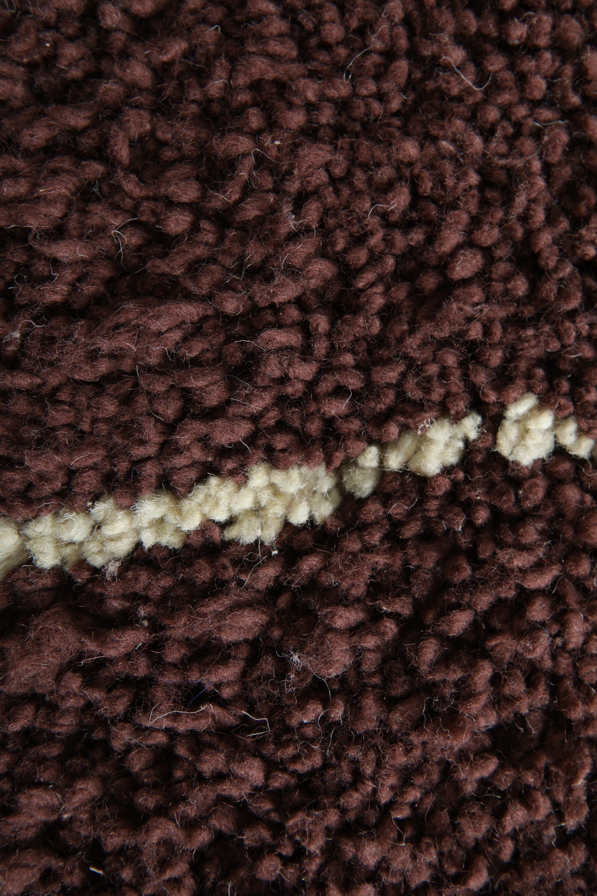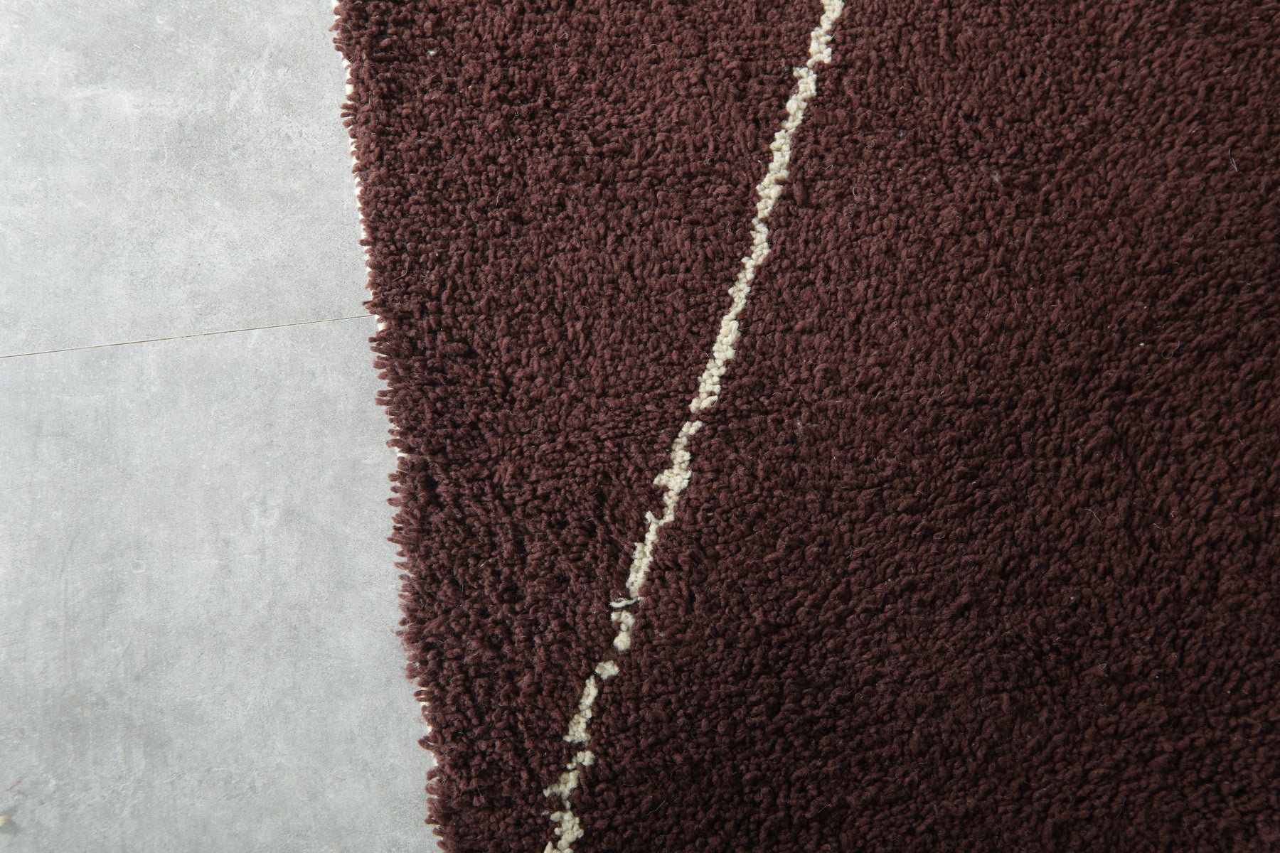 Grounded and graphic, this handwoven Moroccan Beni Ourain rug features a deep brown wool base with crisp white lines forming a classic diamond lattice. Its shaggy texture adds warmth and depth, while the hand-knotted fringe offers a touch of traditional Berber craftsmanship. The bold contrast and earthy tone make it a striking centerpiece—perfect for modern, rustic, or bohemian interiors seeking texture and authenticity.