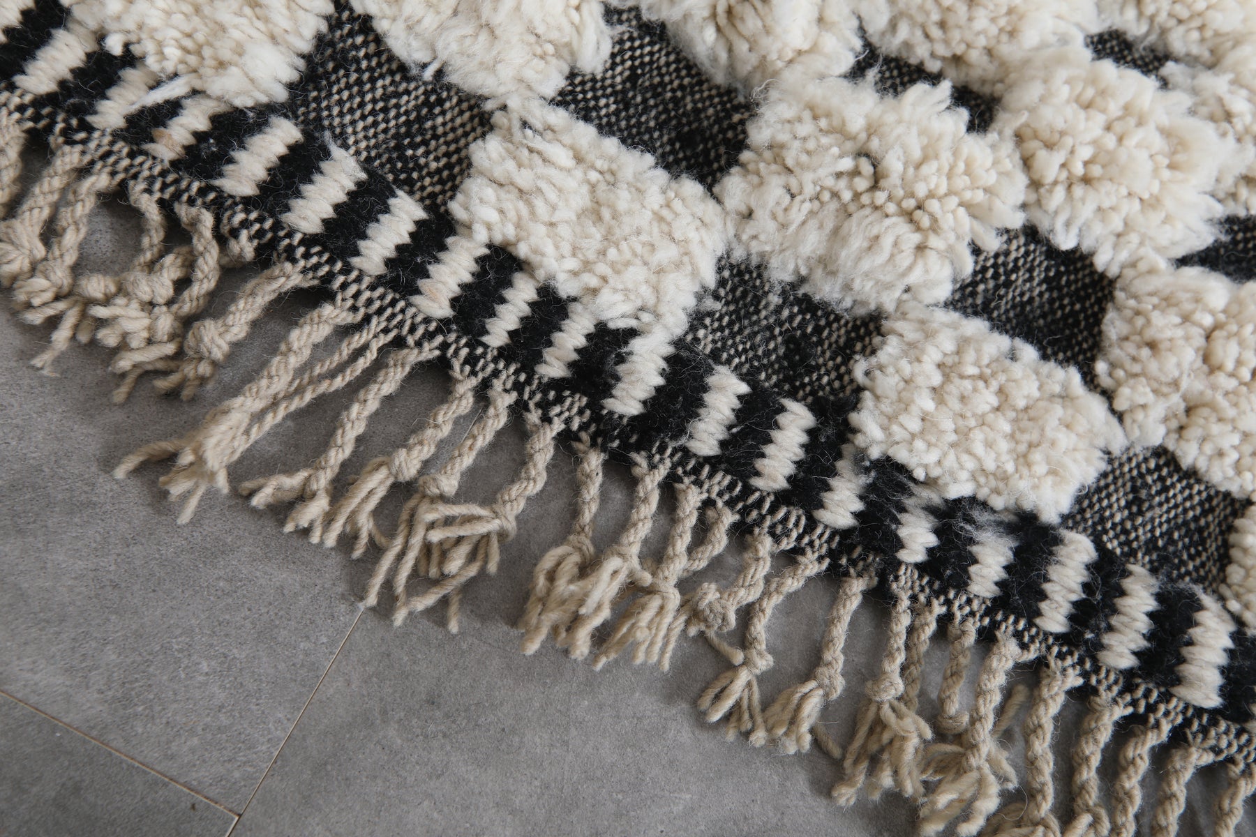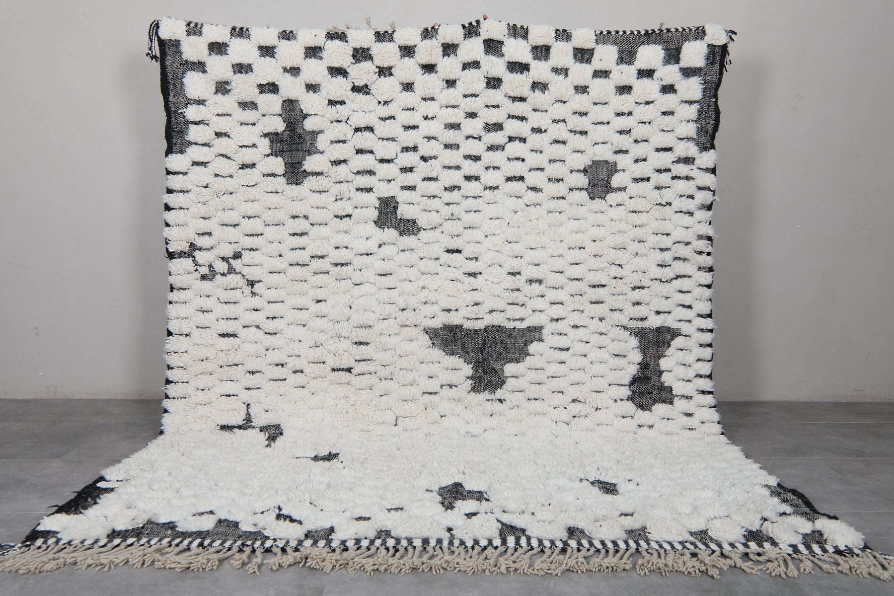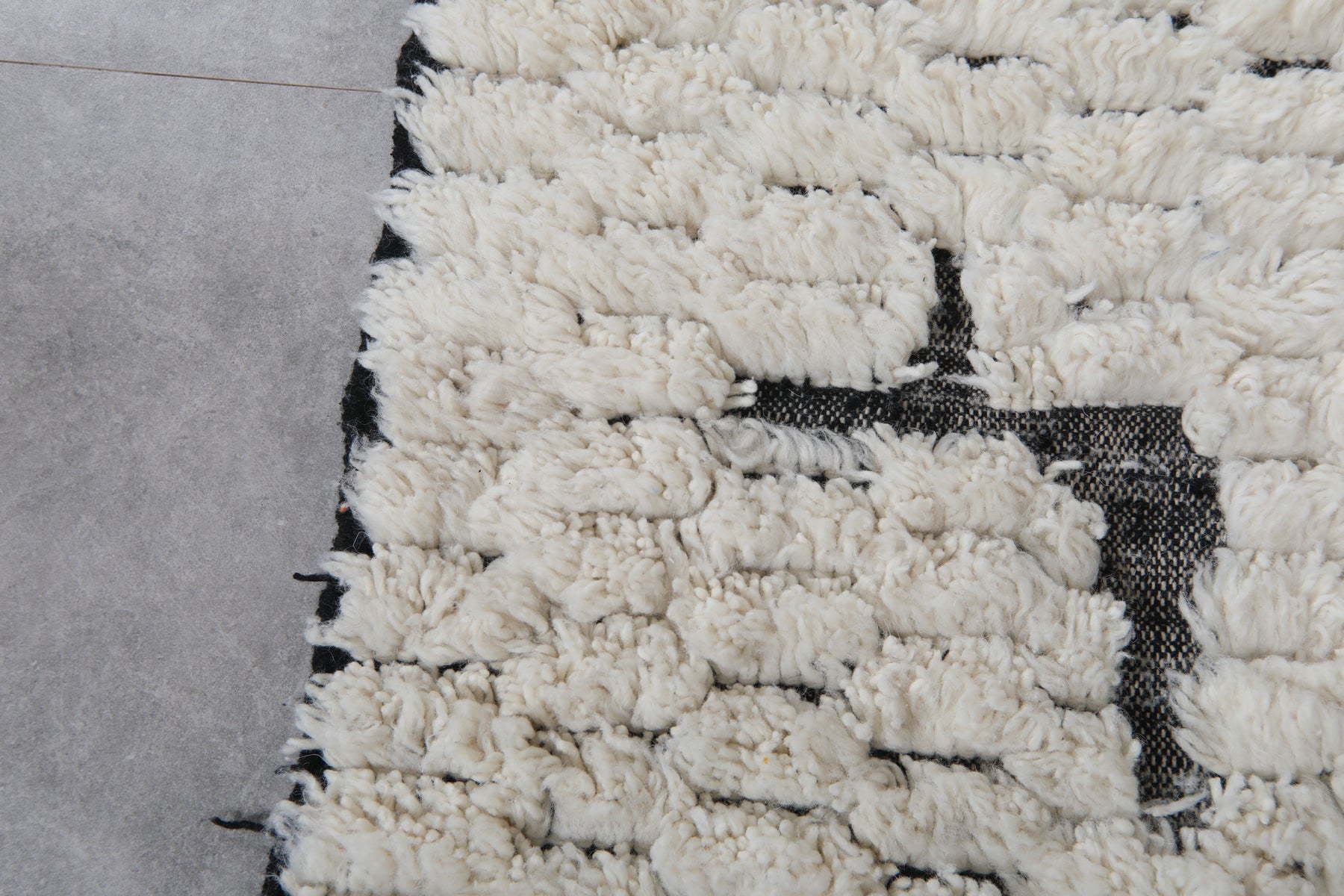 Add bold character to your space with this black and white Moroccan rug, featuring a modern checkered design with abstract motifs. Handwoven from 100% wool, this plush Beni Ourain-style rug brings both comfort and striking contrast to any room. Its monochrome palette makes it a versatile addition to minimalist, contemporary, or boho interiors. Ideal for living rooms, bedrooms, or studios, this eye-catching rug is a statement piece rooted in Moroccan tradition and crafted for modern living.