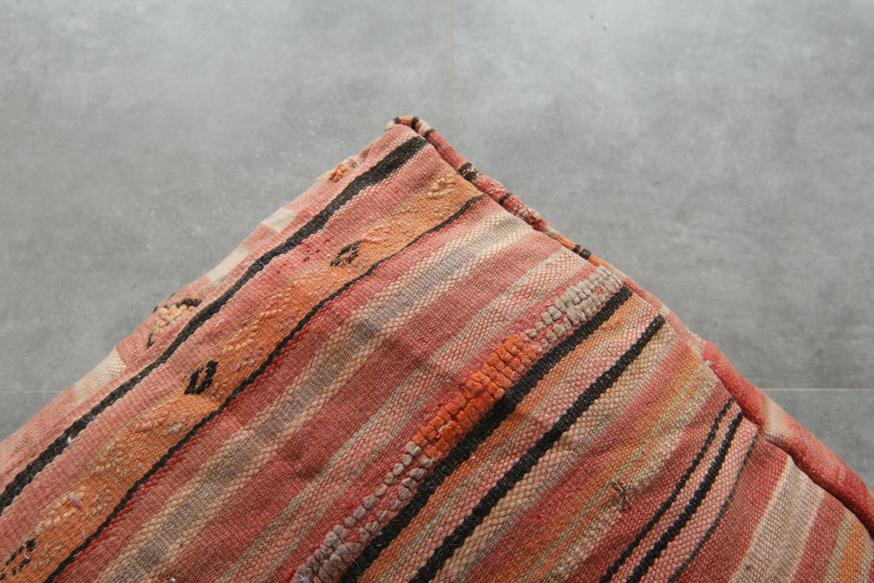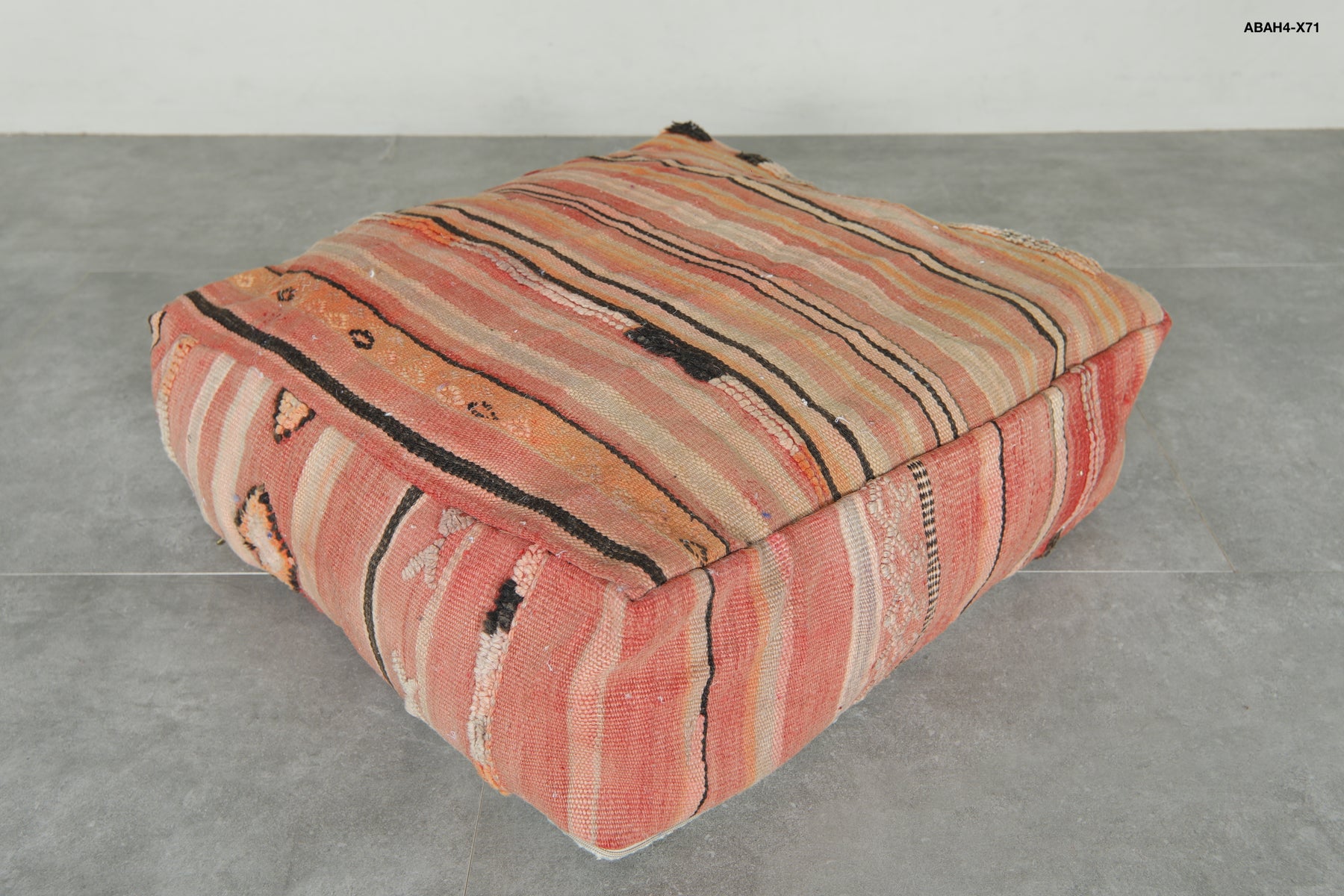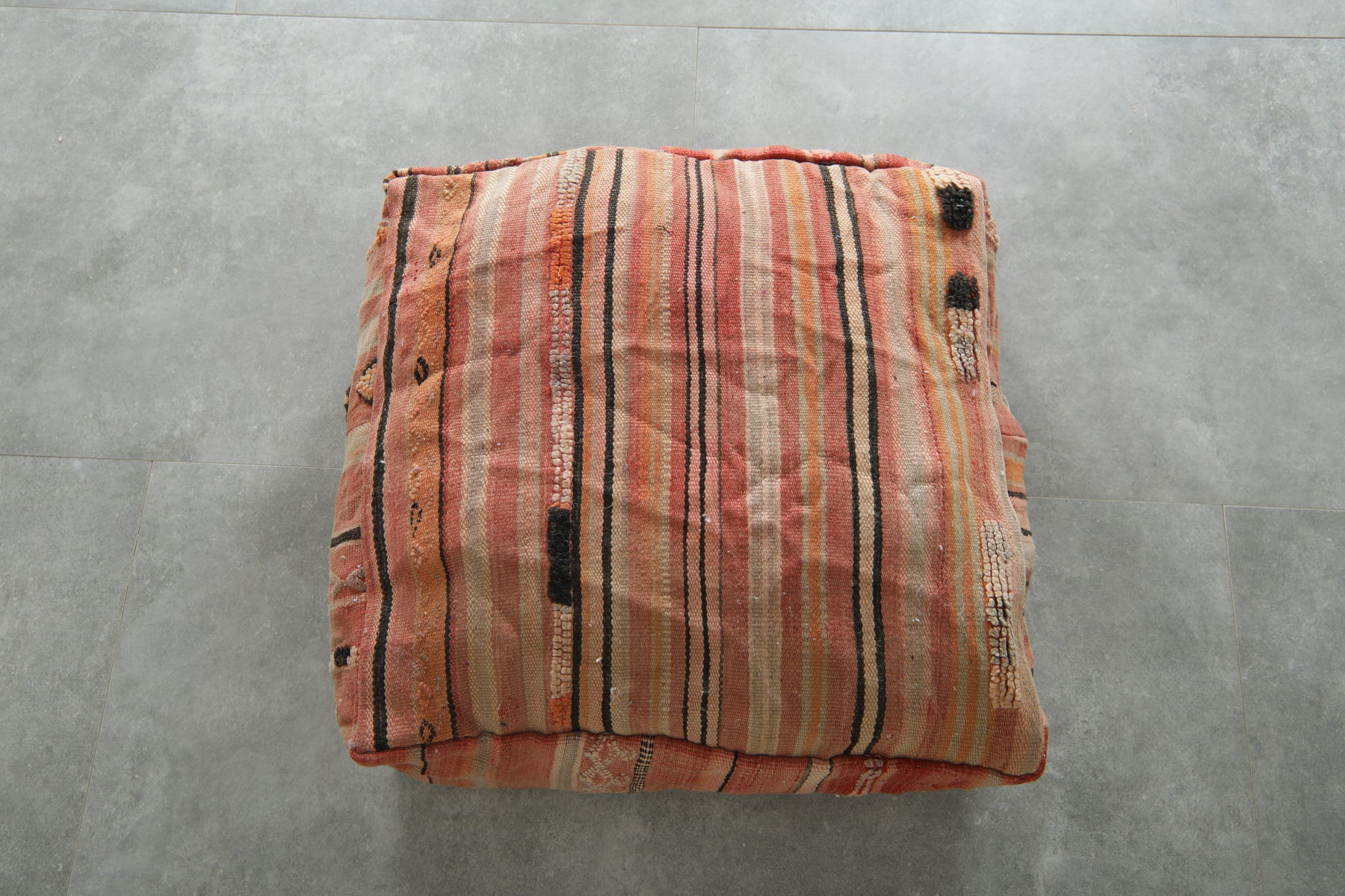 Add a pop of artisanal charm and earthy color to your interior with this handcrafted Moroccan Kilim pouf, featuring a striking geometric design in terracotta, peach, burnt orange, and soft beige tones. Made from upcycled vintage Kilim rugs and handwoven by skilled Moroccan artisans, this floor cushion brings warmth, cultural richness, and bohemian texture to any space.