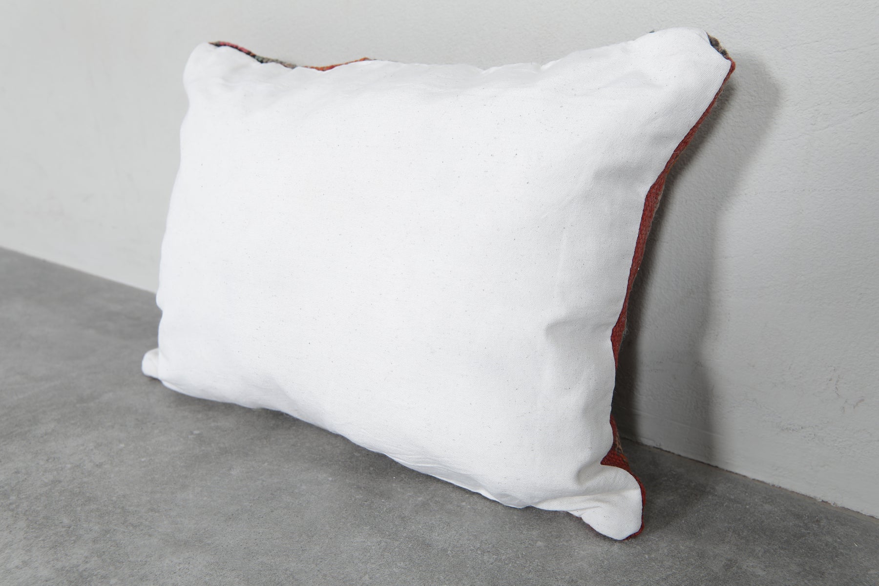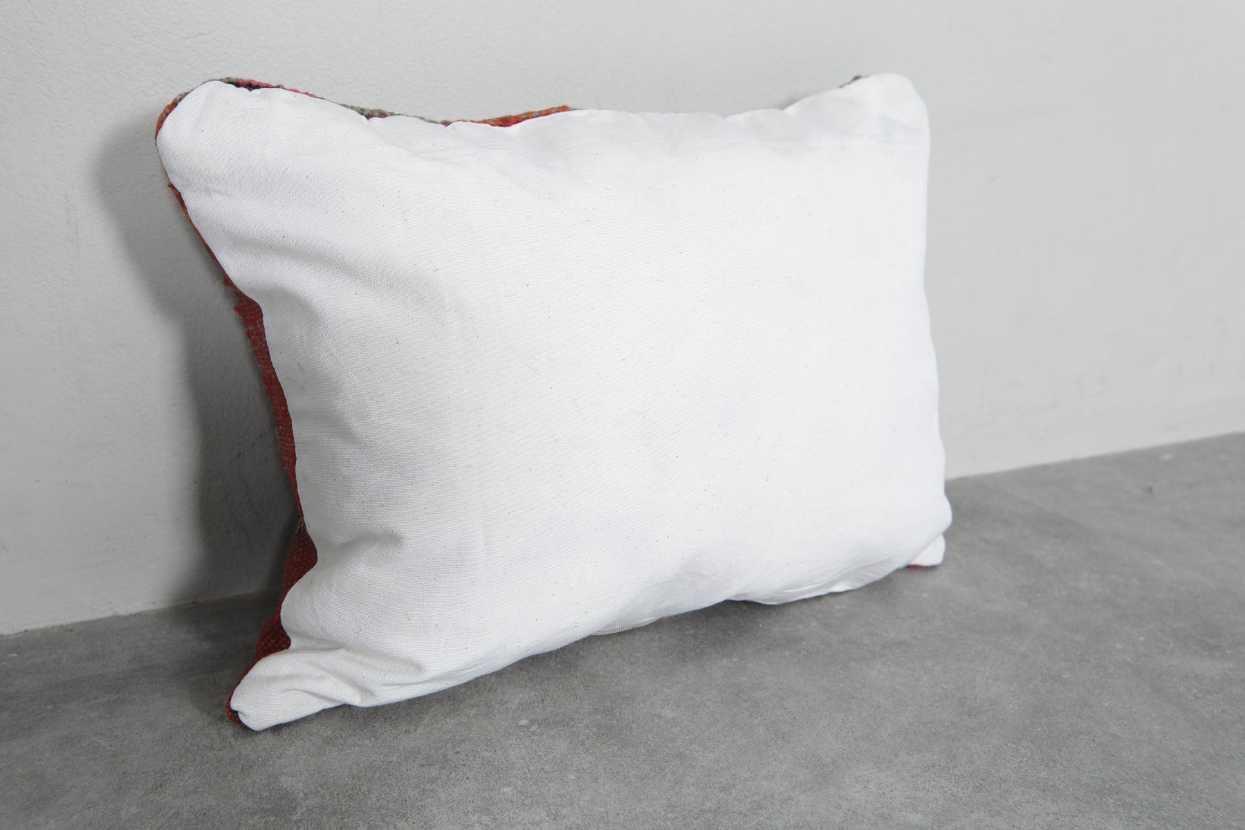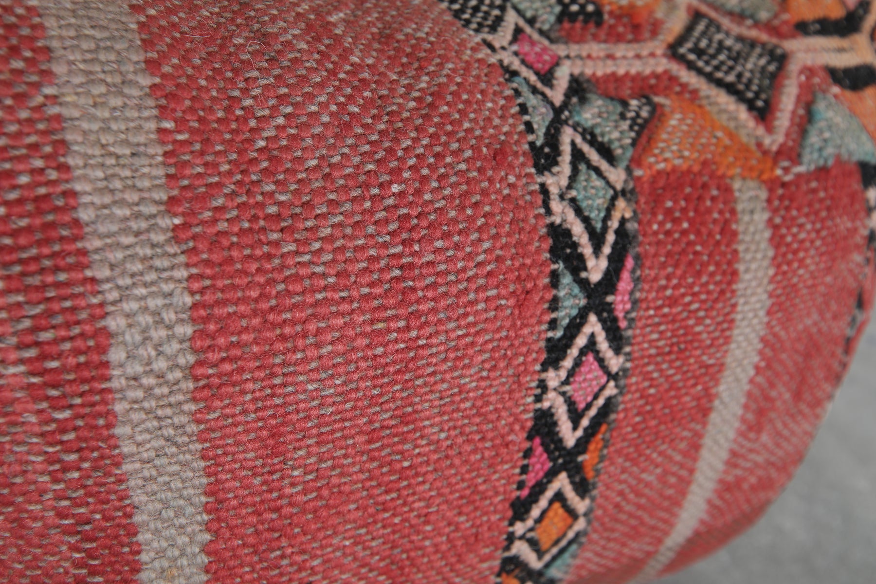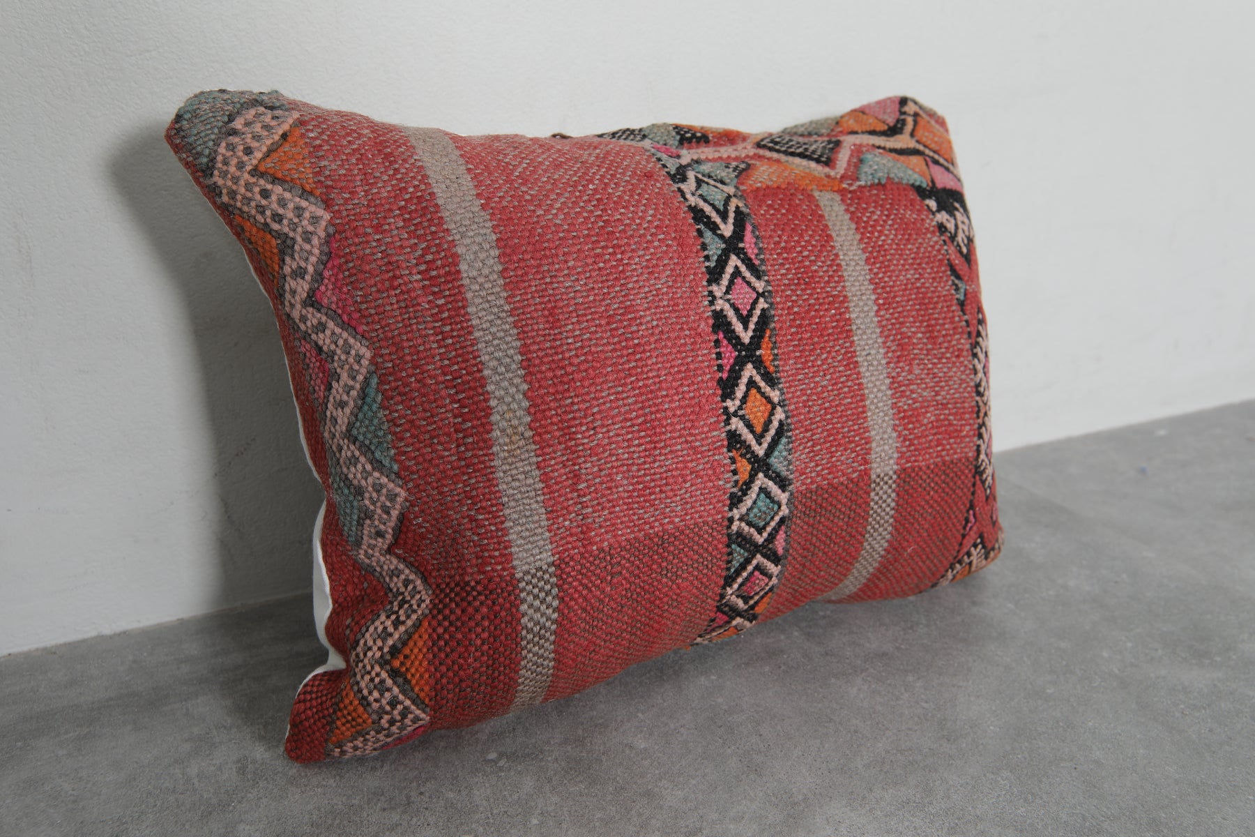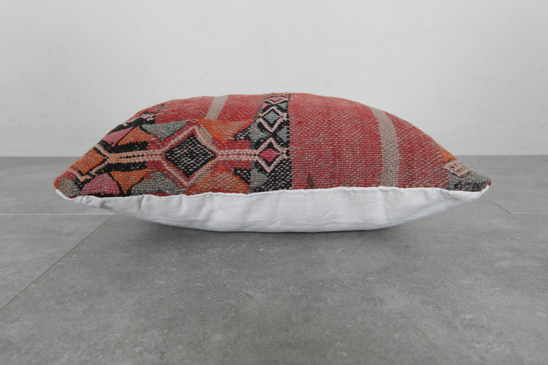 Add warmth and charm to your space with this stunning Moroccan Kilim pillow. Featuring vibrant red hues accented with intricate geometric patterns in shades of orange, pink, and teal, this pillow is a perfect addition to any boho or eclectic decor. Made from authentic handwoven fabric, its durable design combines tradition with modern aesthetics. Size: 14.9 x 19.6 inches.