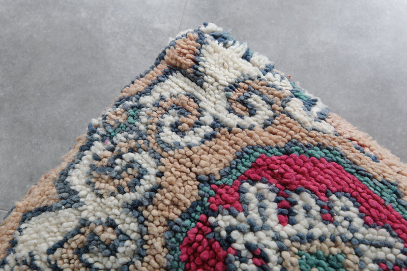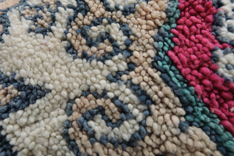 Enhance your space with the beauty of Moroccan craftsmanship with this handwoven vintage wool pouf. Featuring a plush shaggy texture, this floor cushion showcases intricate Berber motifs in warm beige, cream, and deep blue, accented by a bold medallion in red and green. The high-pile wool creates a soft and inviting feel, making it a perfect cozy seat, stylish accent, or luxurious footrest.