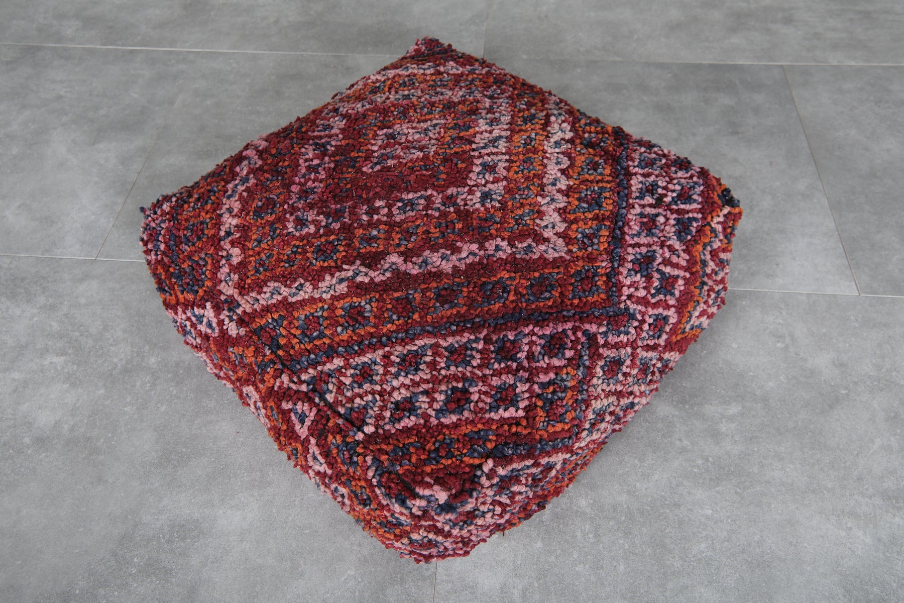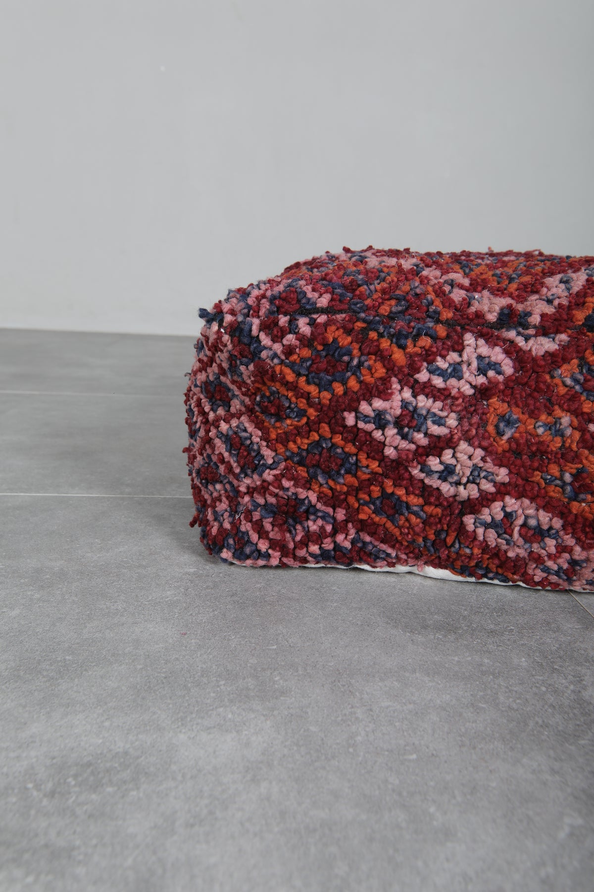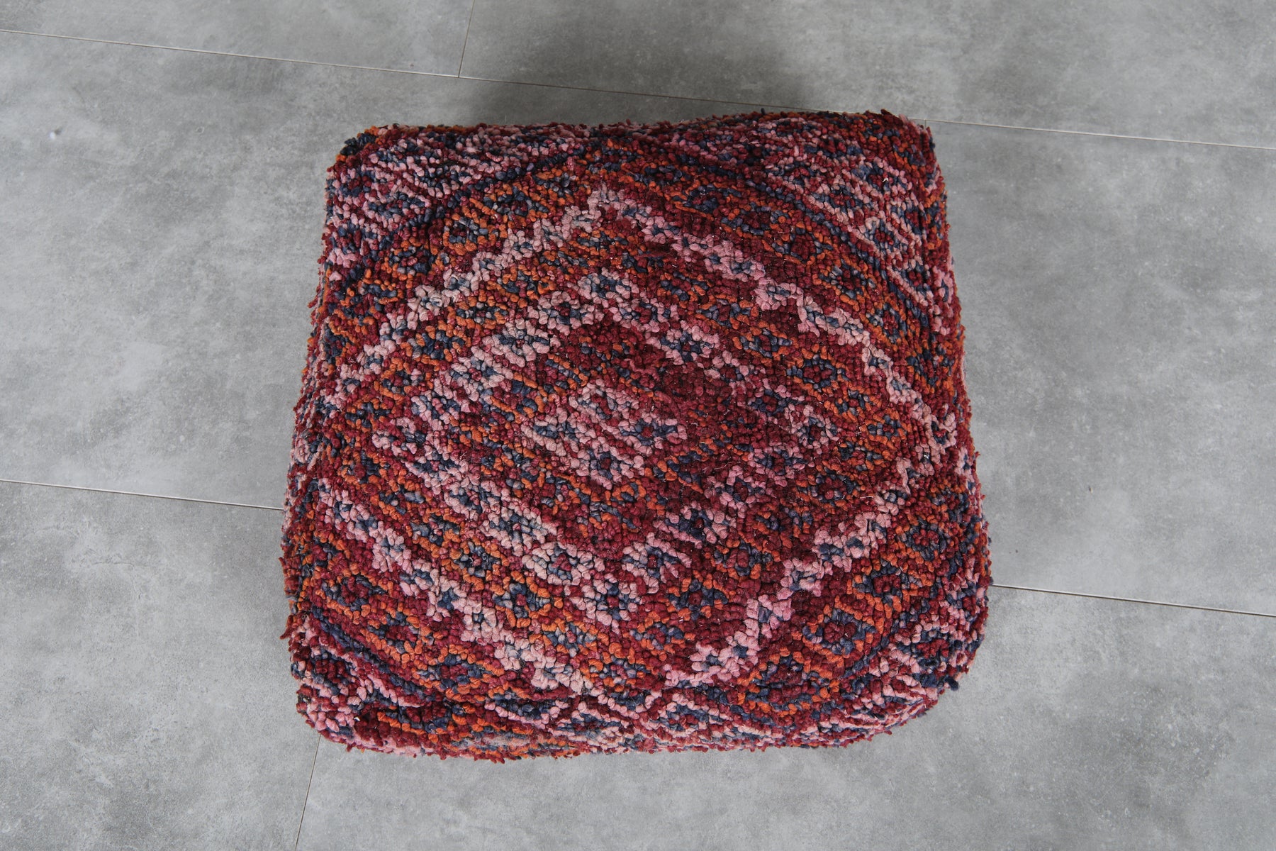 Enhance your living space with this striking handwoven Moroccan wool pouf, rich in deep burgundy, navy, and hints of burnt orange. The intricate geometric patterns, woven with traditional Berber artistry, create a warm and inviting aesthetic perfect for any bohemian or eclectic interior. Crafted from soft vintage wool, this pouf offers both durability and comfort, making it an ideal seating option, decorative accent, or stylish footrest.