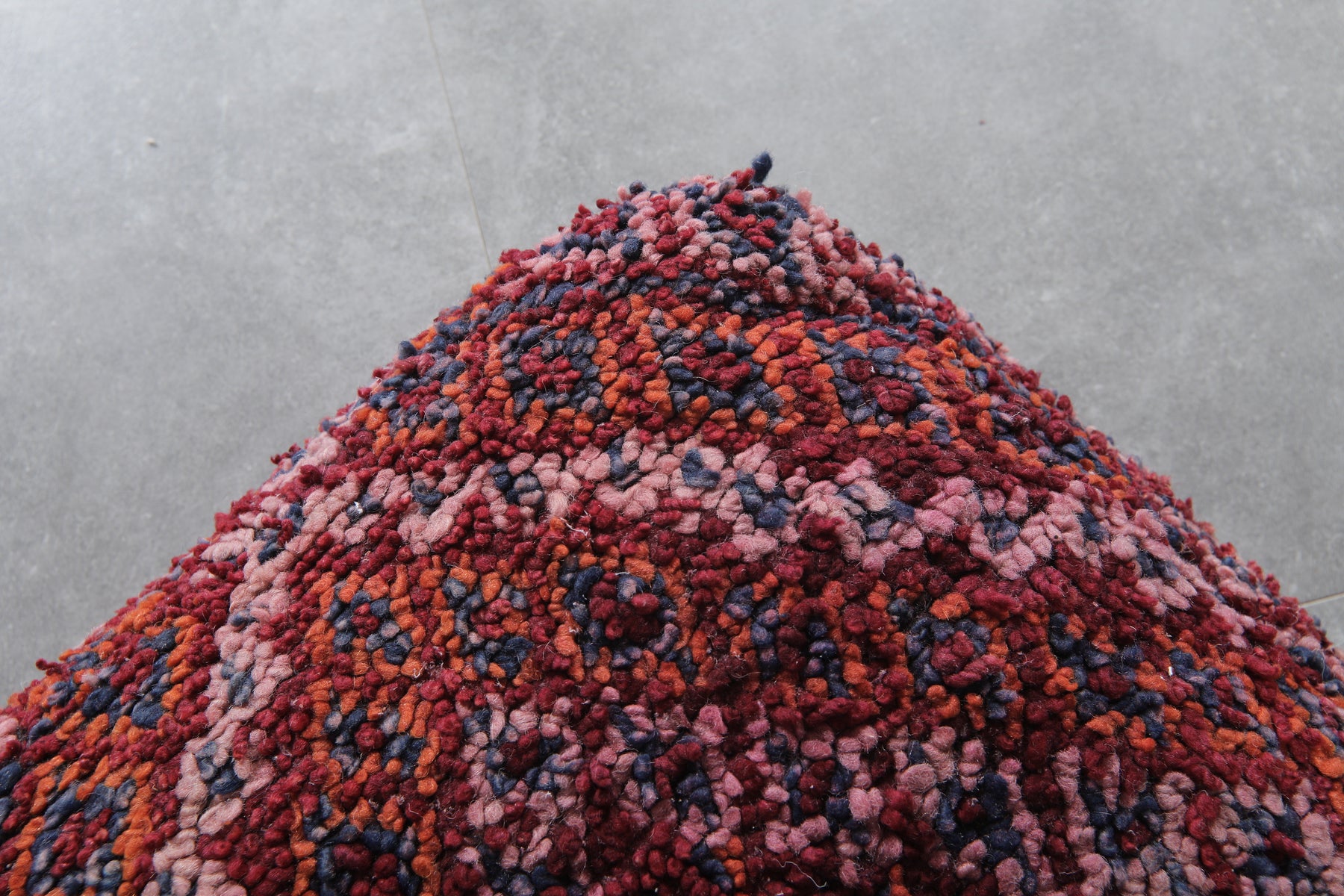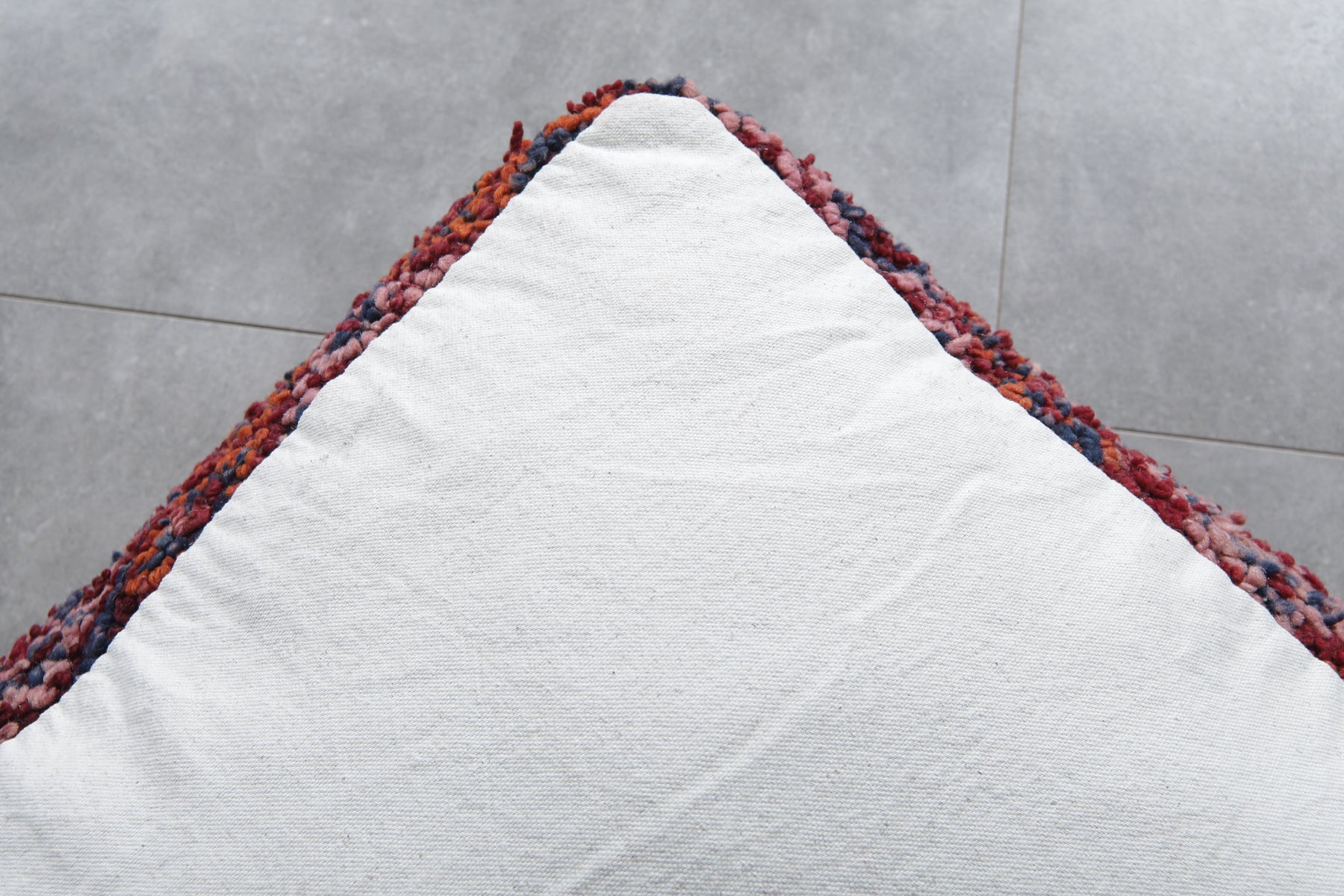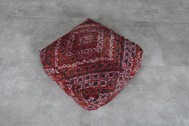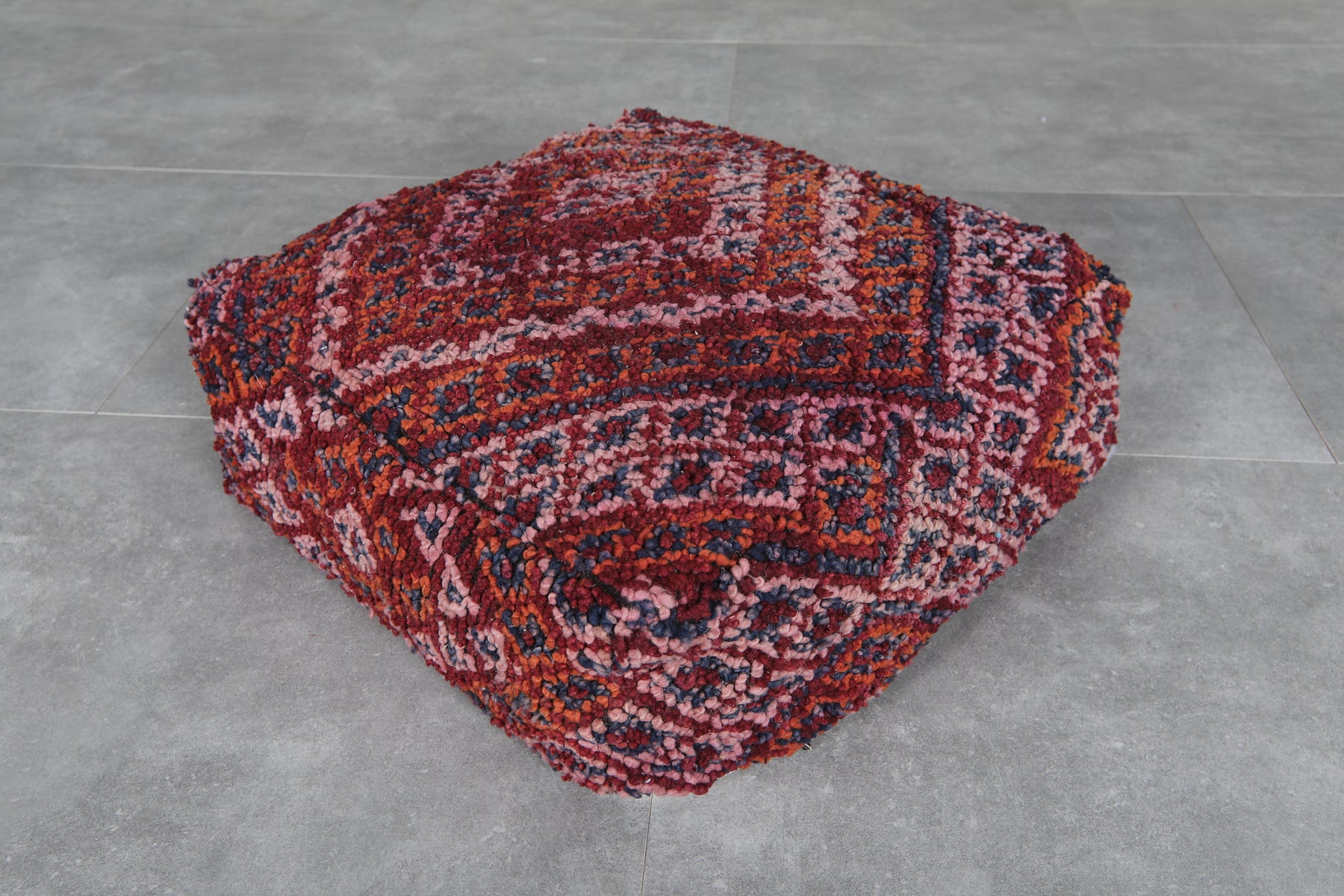 Enhance your living space with this striking handwoven Moroccan wool pouf, rich in deep burgundy, navy, and hints of burnt orange. The intricate geometric patterns, woven with traditional Berber artistry, create a warm and inviting aesthetic perfect for any bohemian or eclectic interior. Crafted from soft vintage wool, this pouf offers both durability and comfort, making it an ideal seating option, decorative accent, or stylish footrest.