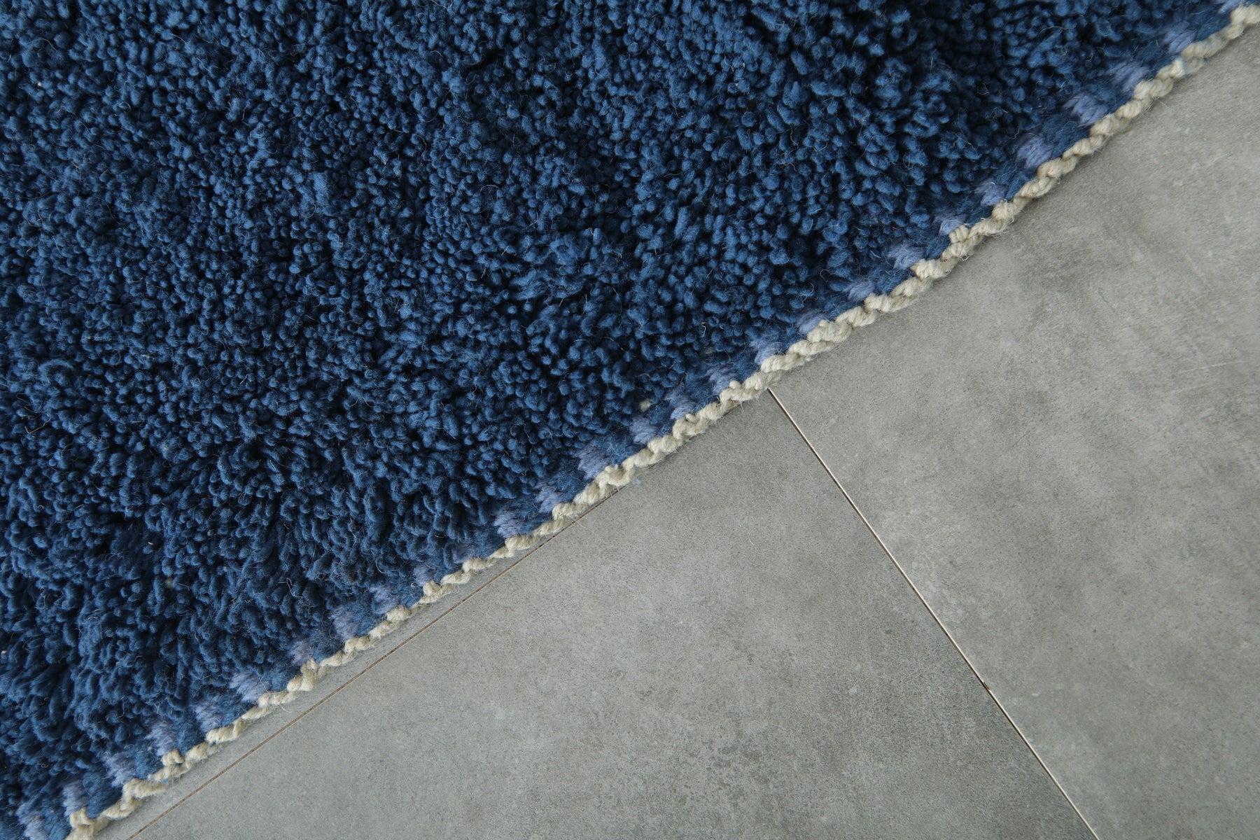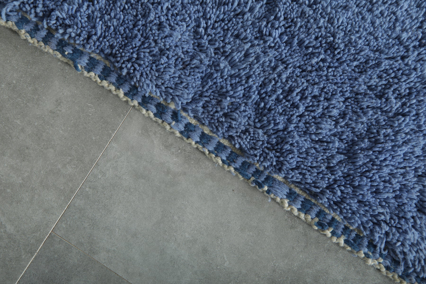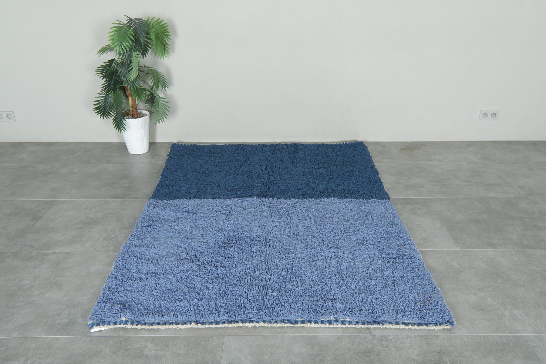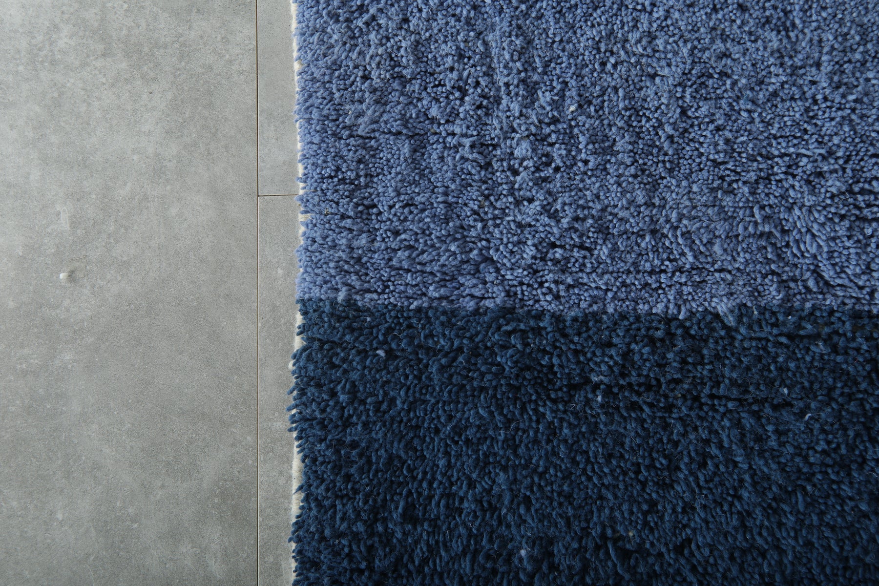 Add modern elegance to your home with this beautifully handcrafted Moroccan rug. Its clean color-block design blends deep navy blue with a lighter denim shade, creating a soothing and stylish gradient effect.