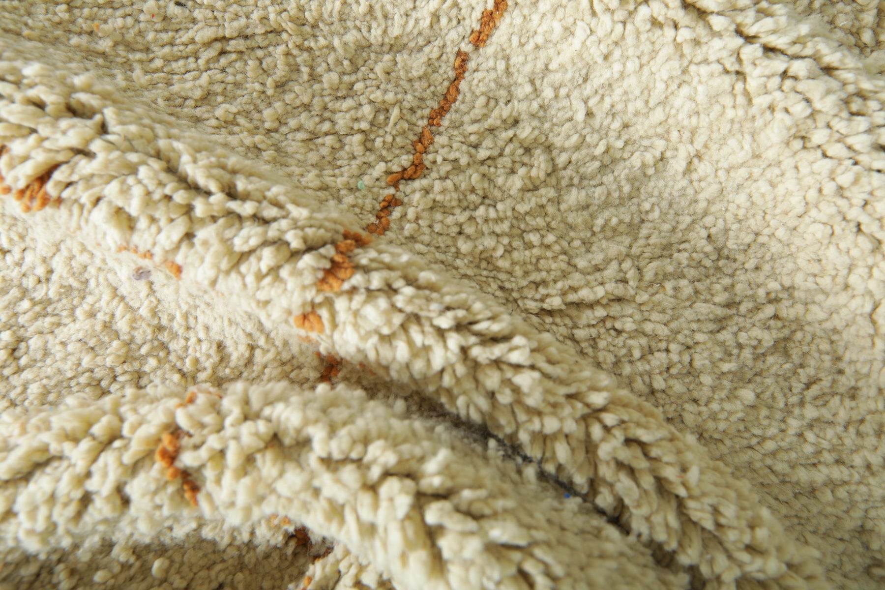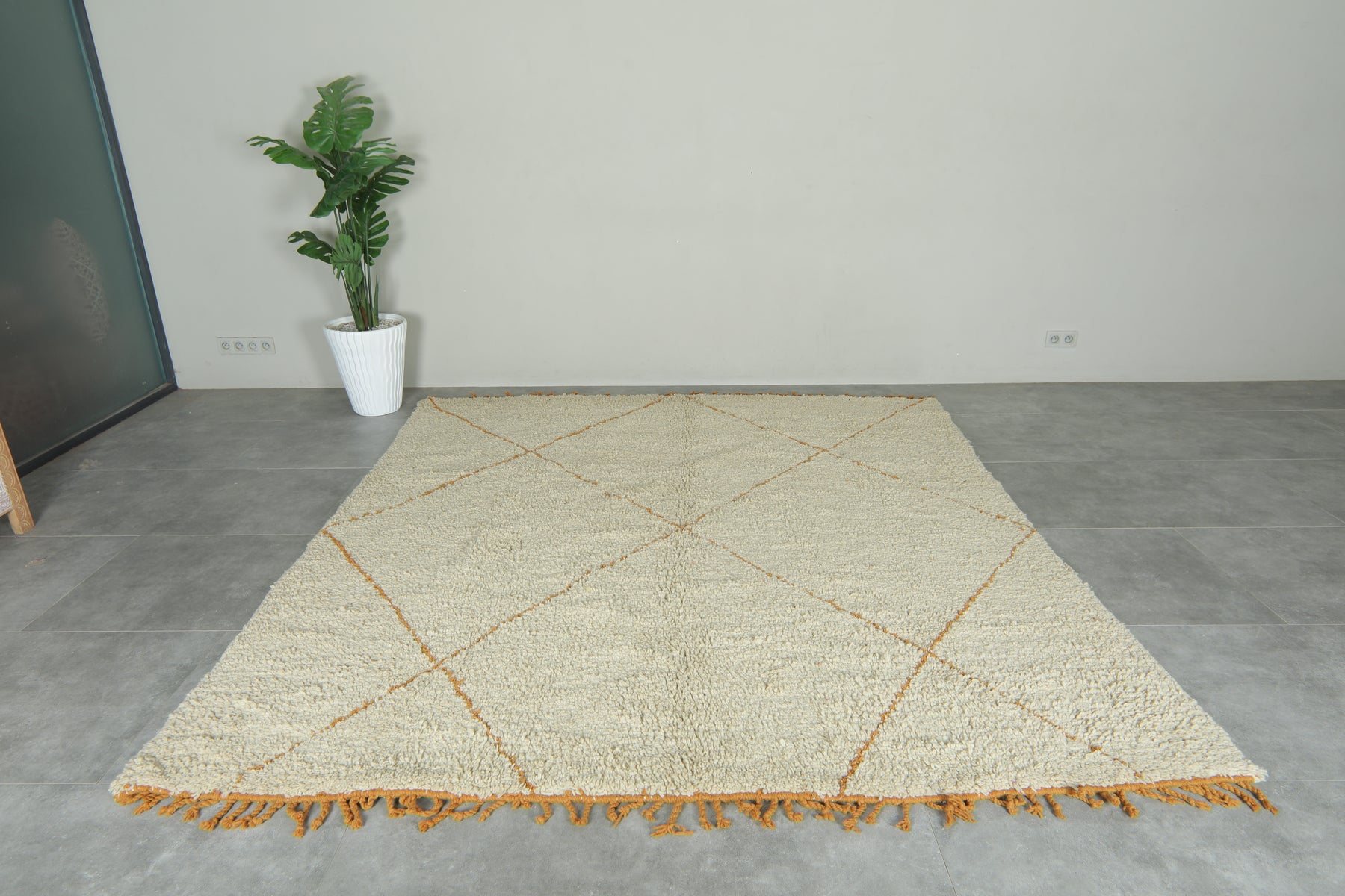 Handwoven in the Atlas Mountains, this genuine Beni Ourain rug features a white base crafted from 100% natural wool. A lattice of fine burnt orange lines forms a classic diamond motif across the surface, adding warmth and visual rhythm. The plush, high-pile texture invites comfort, while the hand-knotted fringe in matching burnt orange tones completes the piece with a traditional touch. Perfect for grounding neutral interiors or adding subtle color to minimalist spaces.