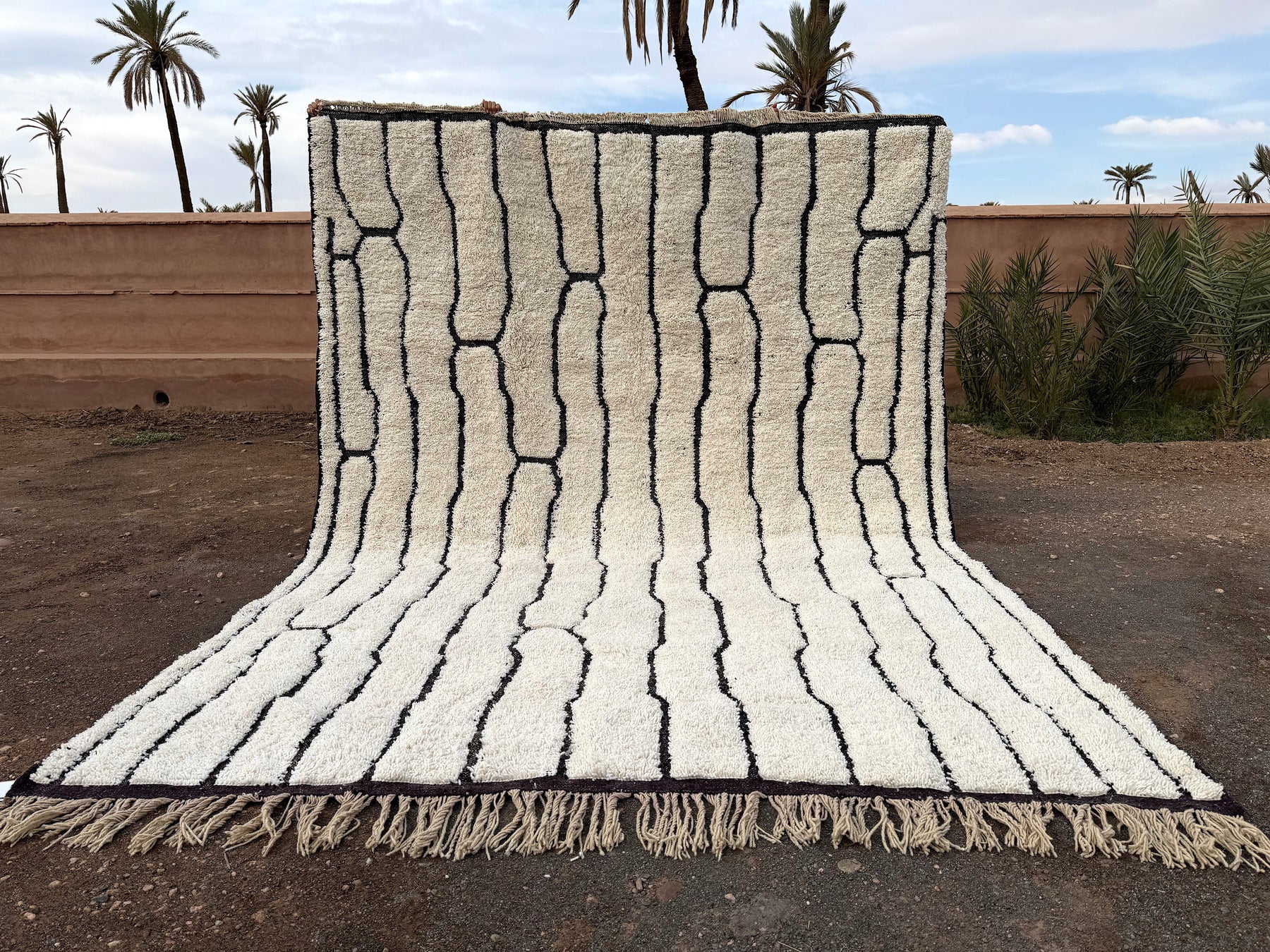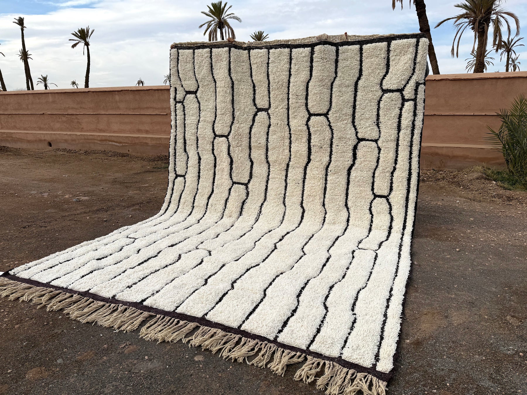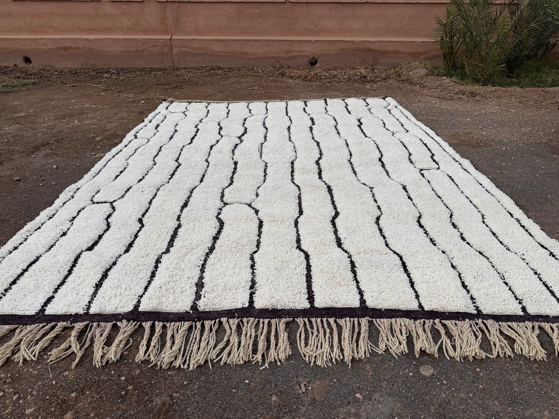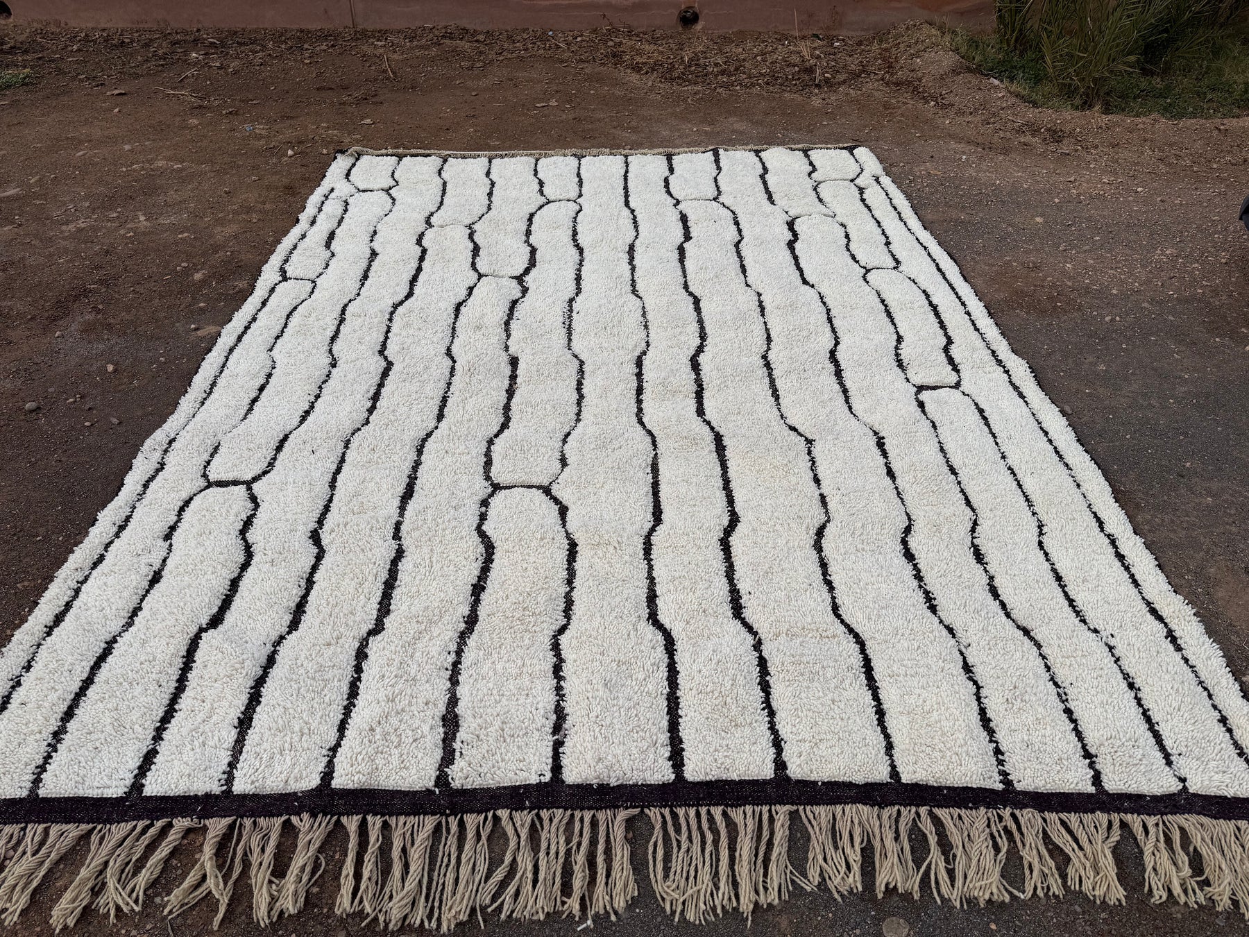 Abstract White Moroccan Rug – Handmade Beni Ourain Design Elevate your space with this striking abstract white Moroccan rug, a contemporary interpretation of traditional Beni Ourain craftsmanship. Hand-woven by skilled Berber artisans using premium natural wool, this piece features bold black geometric lines that add modern sophistication to any room. The neutral palette and minimalist design complement both eclectic and refined interiors, while the durable wool construction ensures lasting beauty. Available in custom sizes to fit your exact specifications. Free shipping included. A timeless investment in authentic Moroccan heritage and artisanal quality.