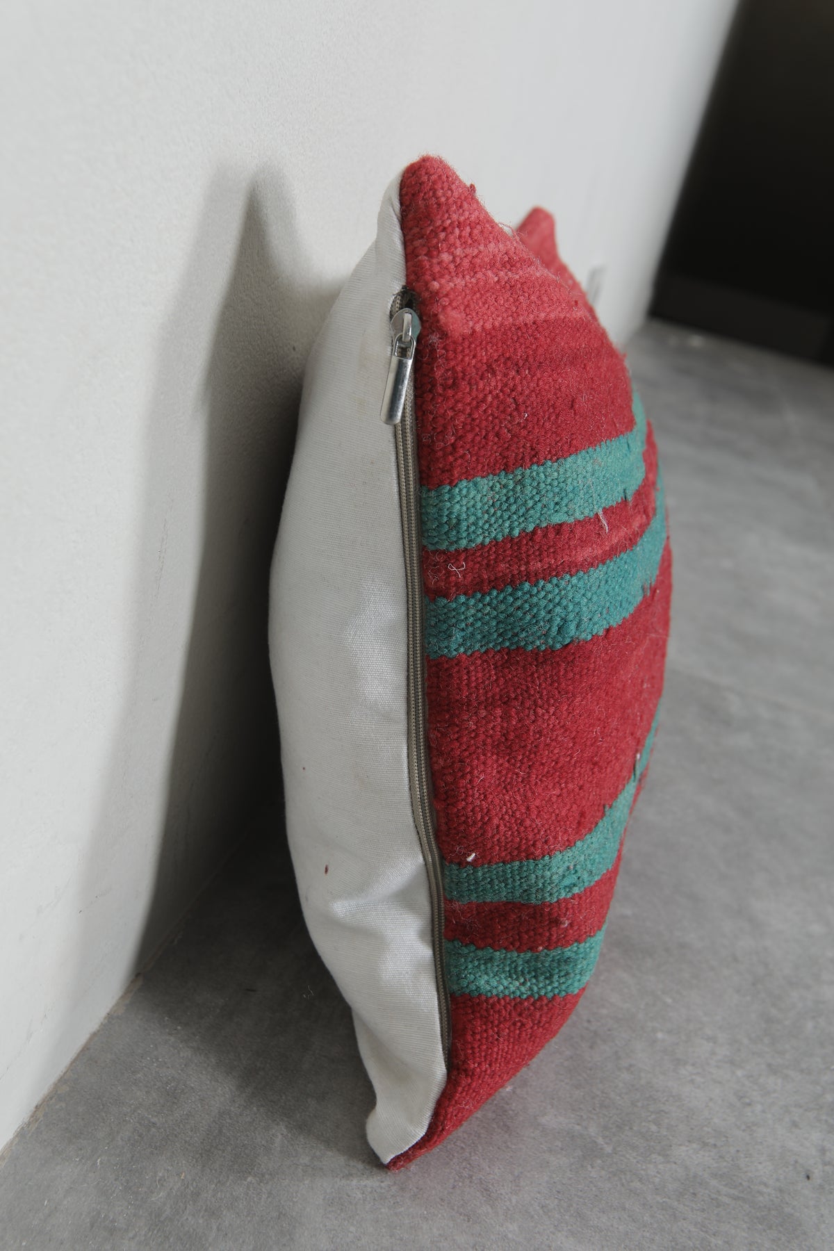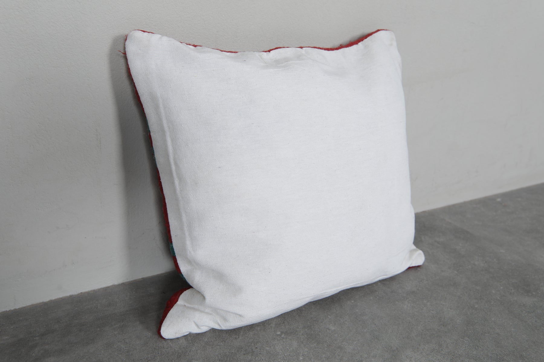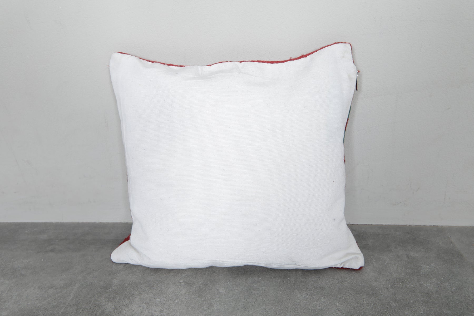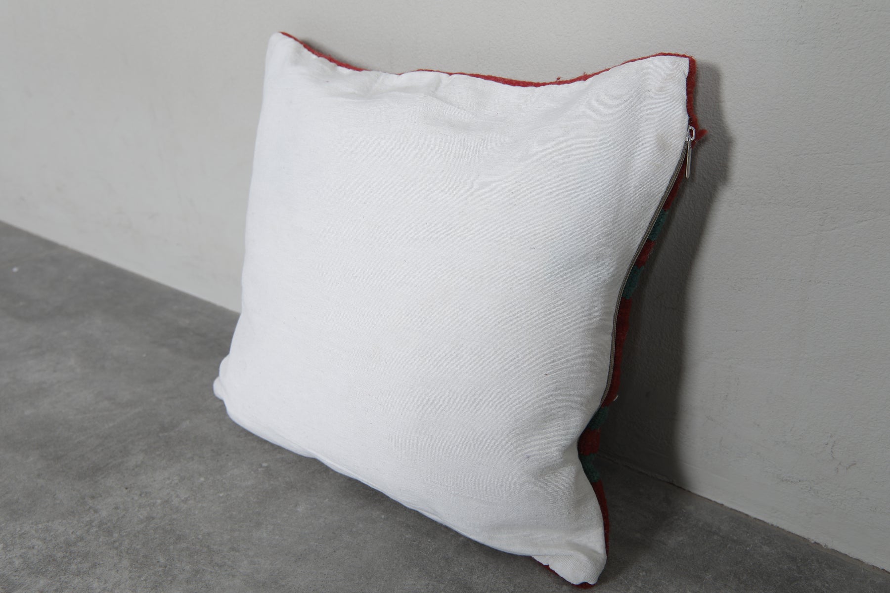 Bring warmth and handmade charm to your home with this exquisite Moroccan kilim pillow cover. Crafted by skilled Berber artisans, it features traditional weaving and intricate embroidery, offering a beautifully textured wool surface. Its slightly rectangular shape adds a stylish, balanced touch to sofas, chairs, or beds.