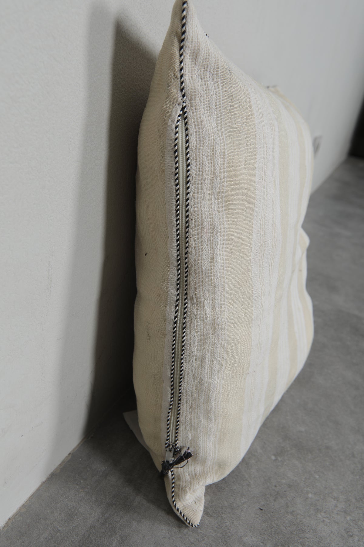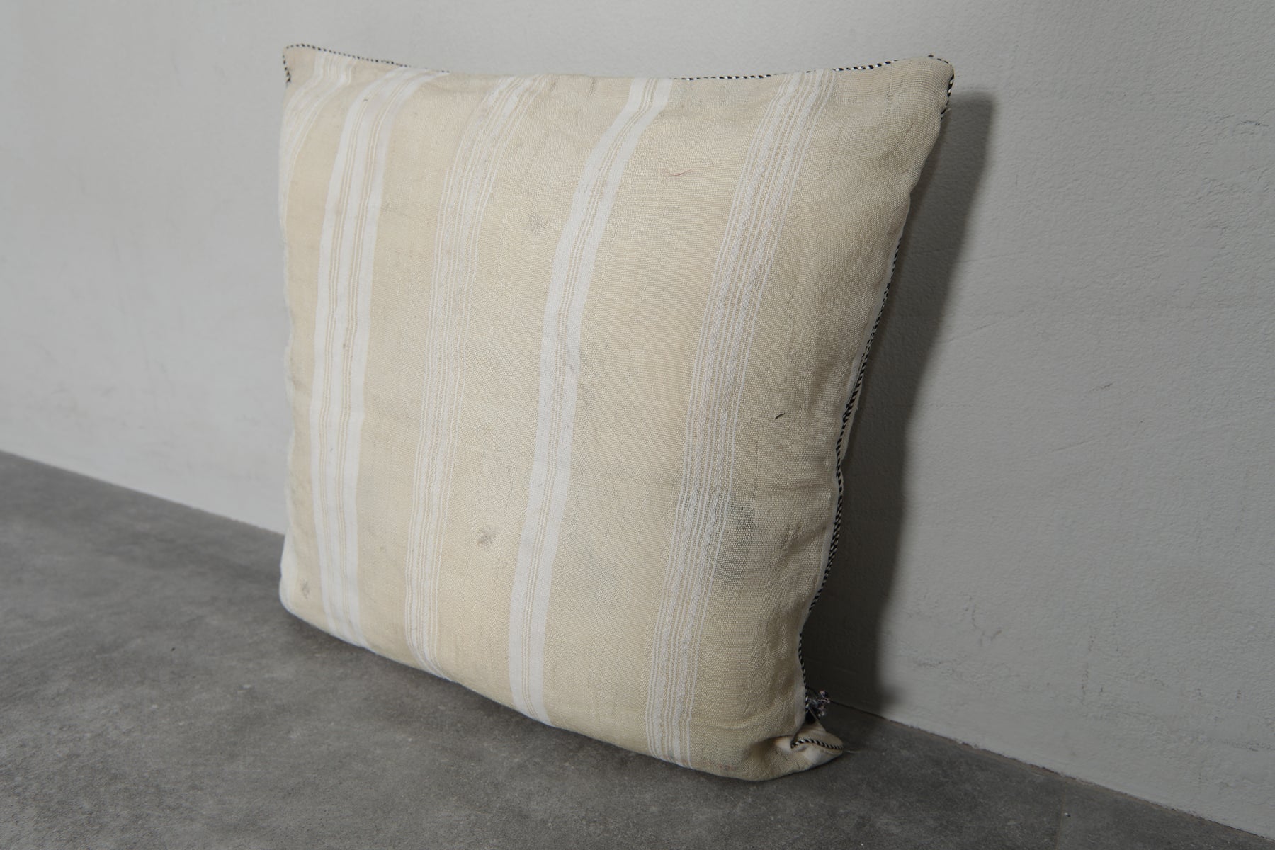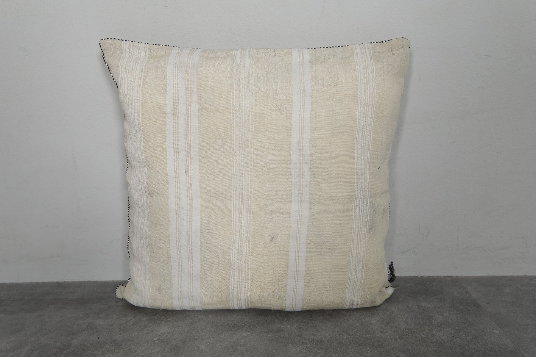 Add bold texture and authentic craftsmanship to your space with this stunning handwoven Moroccan kilim pillow cover. Carefully crafted by Berber artisans, it features intricate embroidery and a richly woven wool surface. The nearly square shape makes it a versatile piece—perfect for mixing and matching on a sofa, bed, or reading nook.