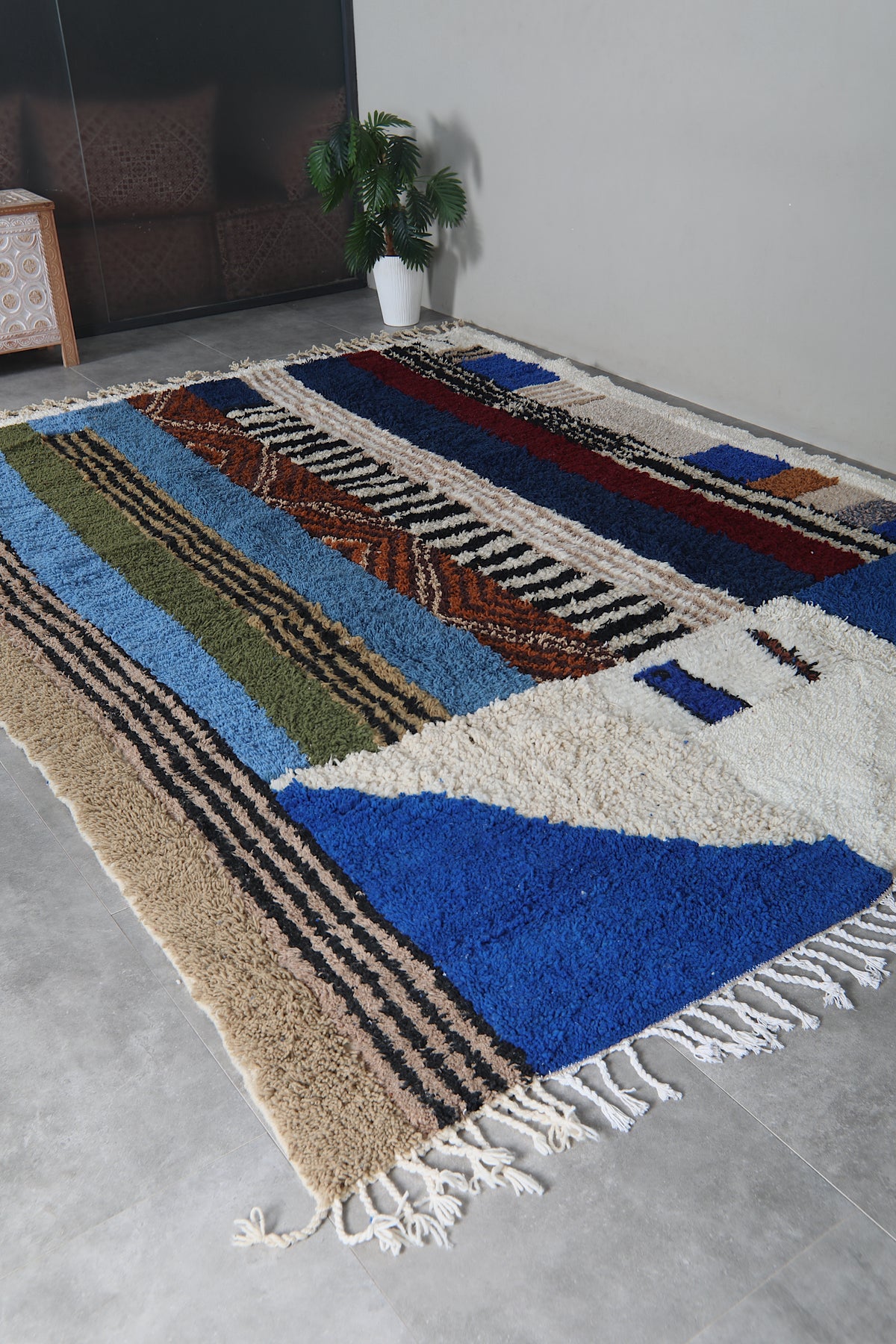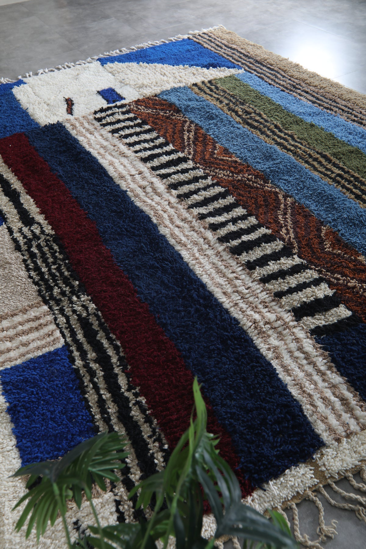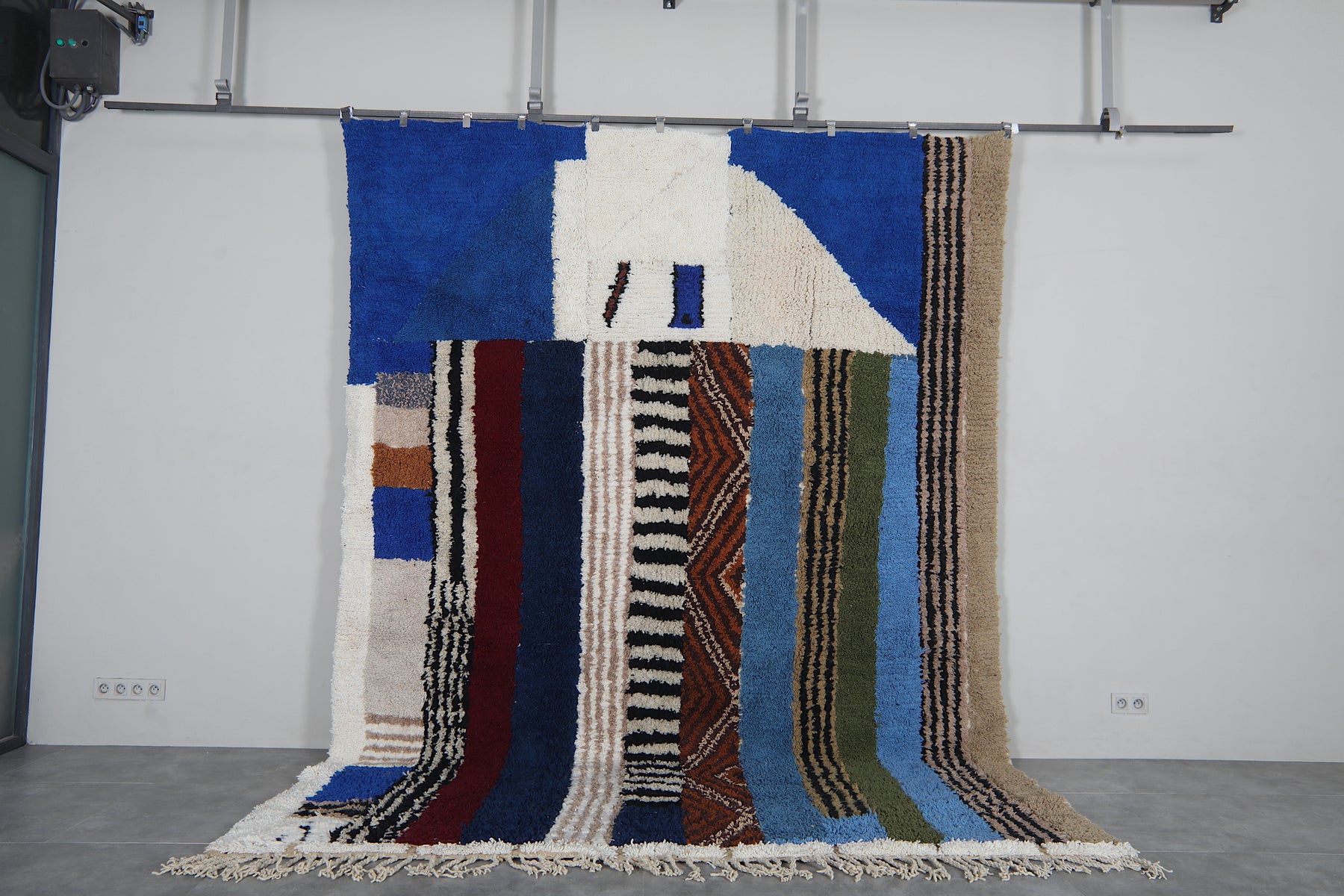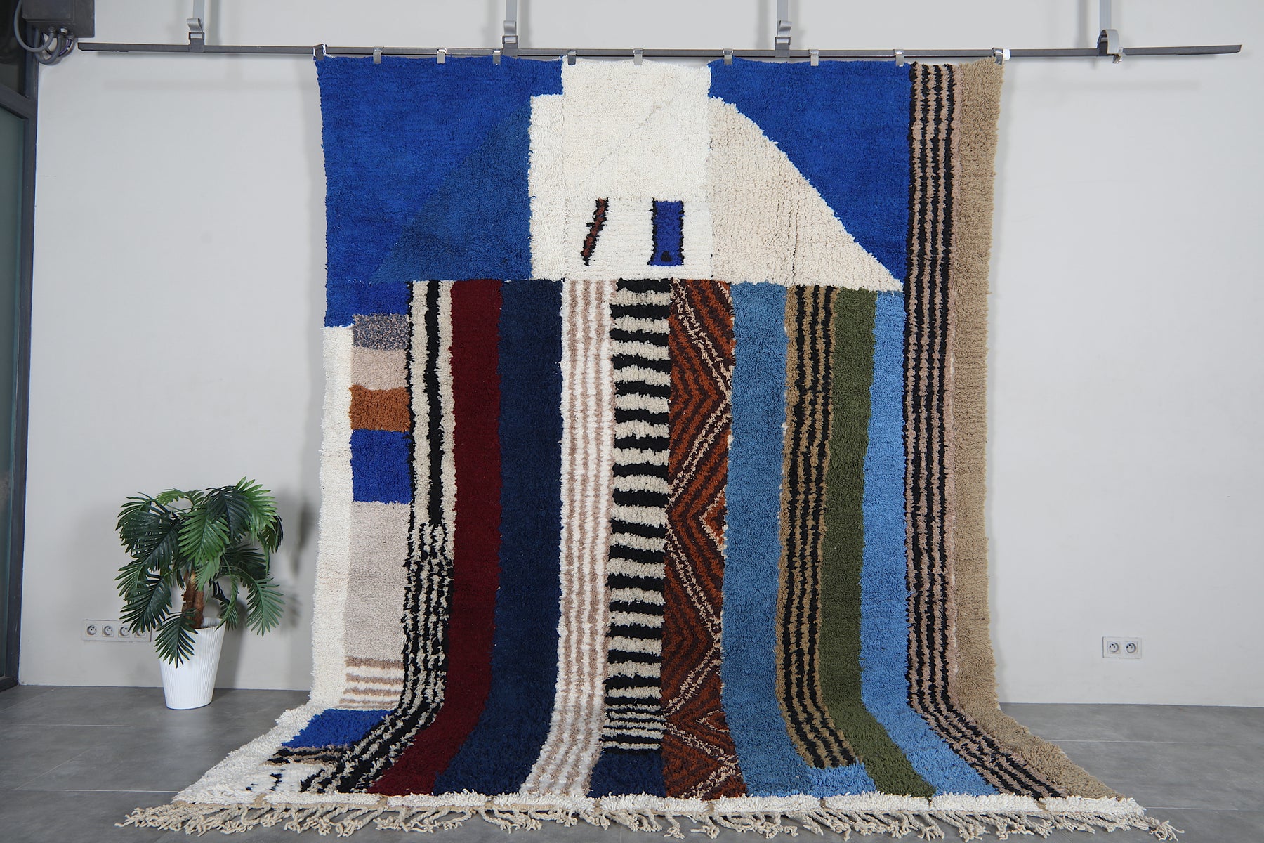 This 8.9 x 12 feet Beni Ourain rug features a striking composition built around deep blue fields and a dynamic sequence of vertical bands in ivory, black, rust, soft beige, olive green, and muted sky tones. The design blends bold geometry with intricate Berber motifs—alternating between clean stripes, textured lines, and subtle zigzag patterns that bring rhythm and movement across the surface. The upper section introduces a structured ivory shape that contrasts beautifully against the rich blue background, giving the rug a modern architectural presence.