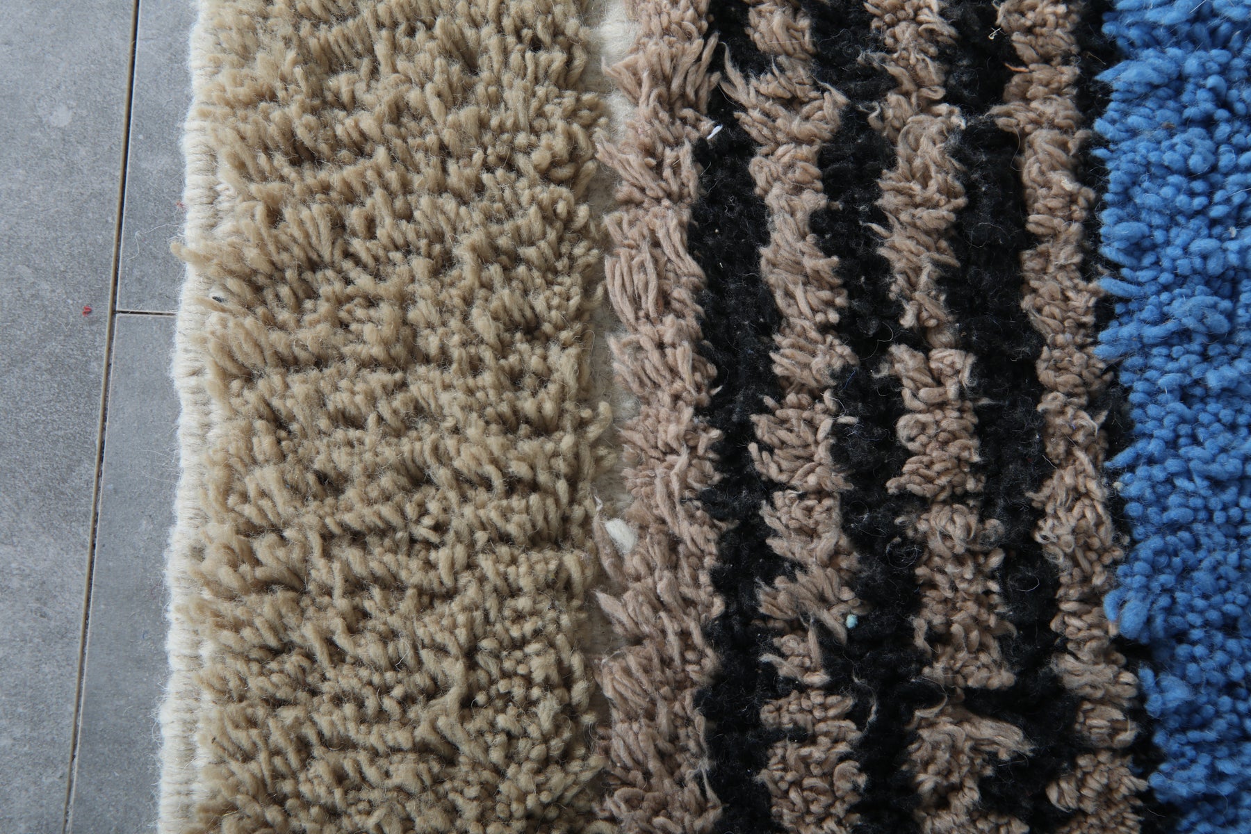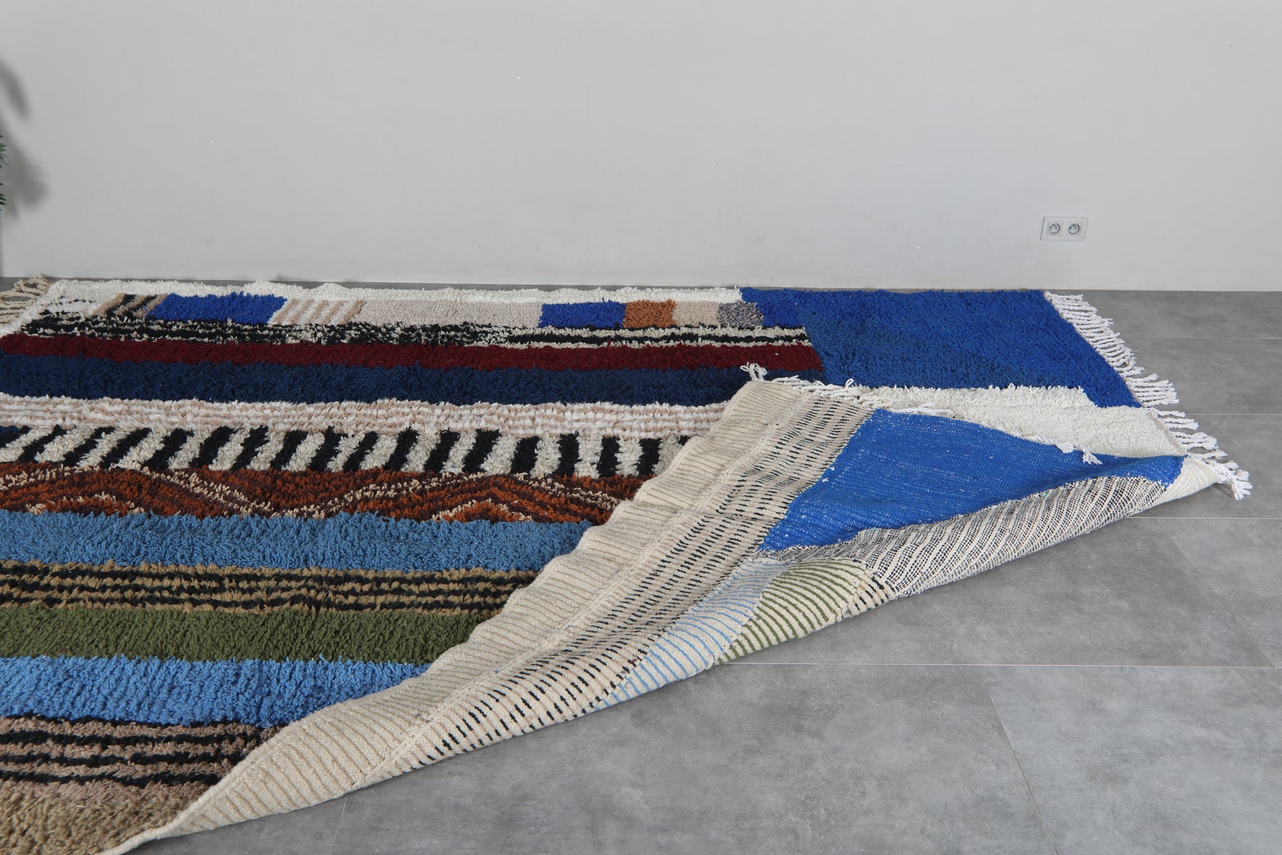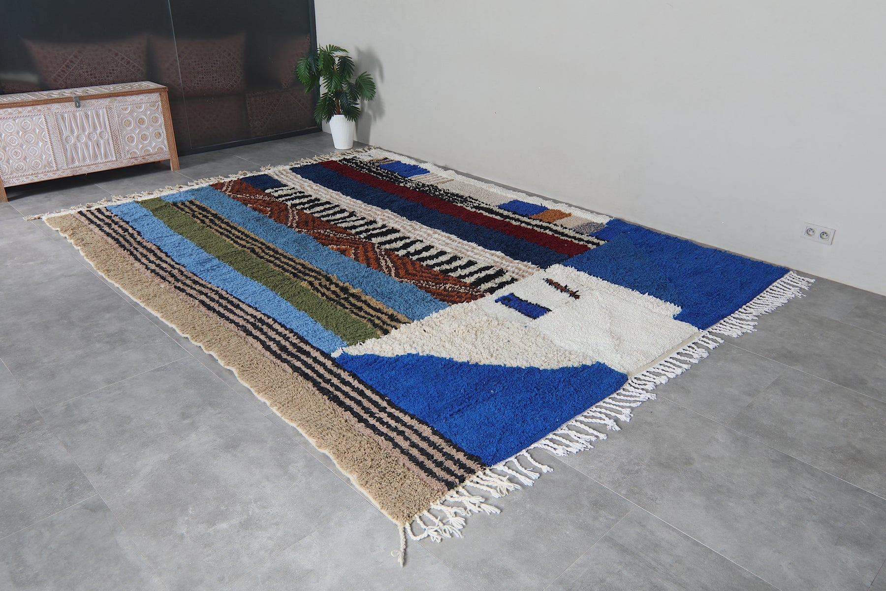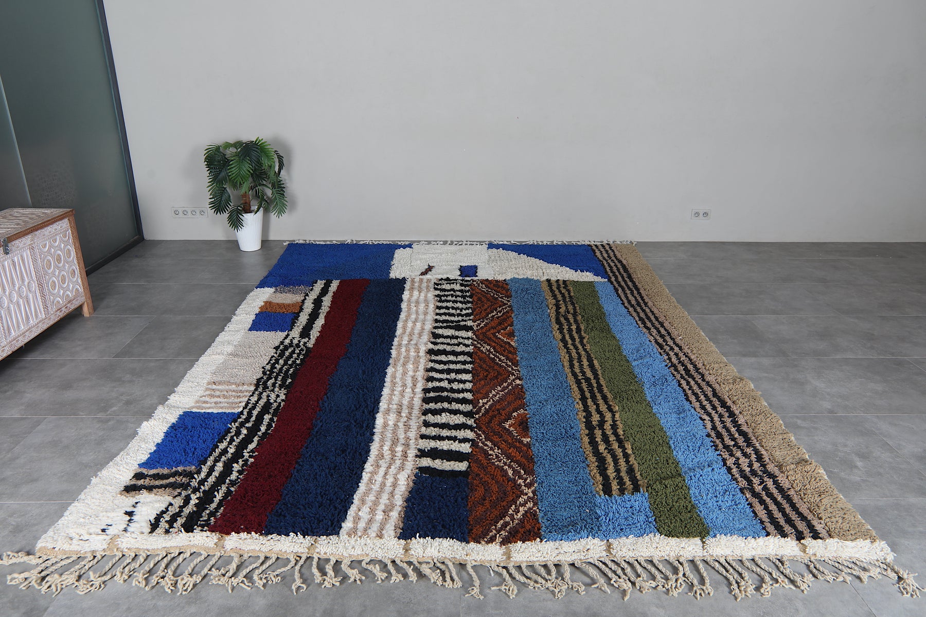 This 8.9 x 12 feet Beni Ourain rug features a striking composition built around deep blue fields and a dynamic sequence of vertical bands in ivory, black, rust, soft beige, olive green, and muted sky tones. The design blends bold geometry with intricate Berber motifs—alternating between clean stripes, textured lines, and subtle zigzag patterns that bring rhythm and movement across the surface. The upper section introduces a structured ivory shape that contrasts beautifully against the rich blue background, giving the rug a modern architectural presence.