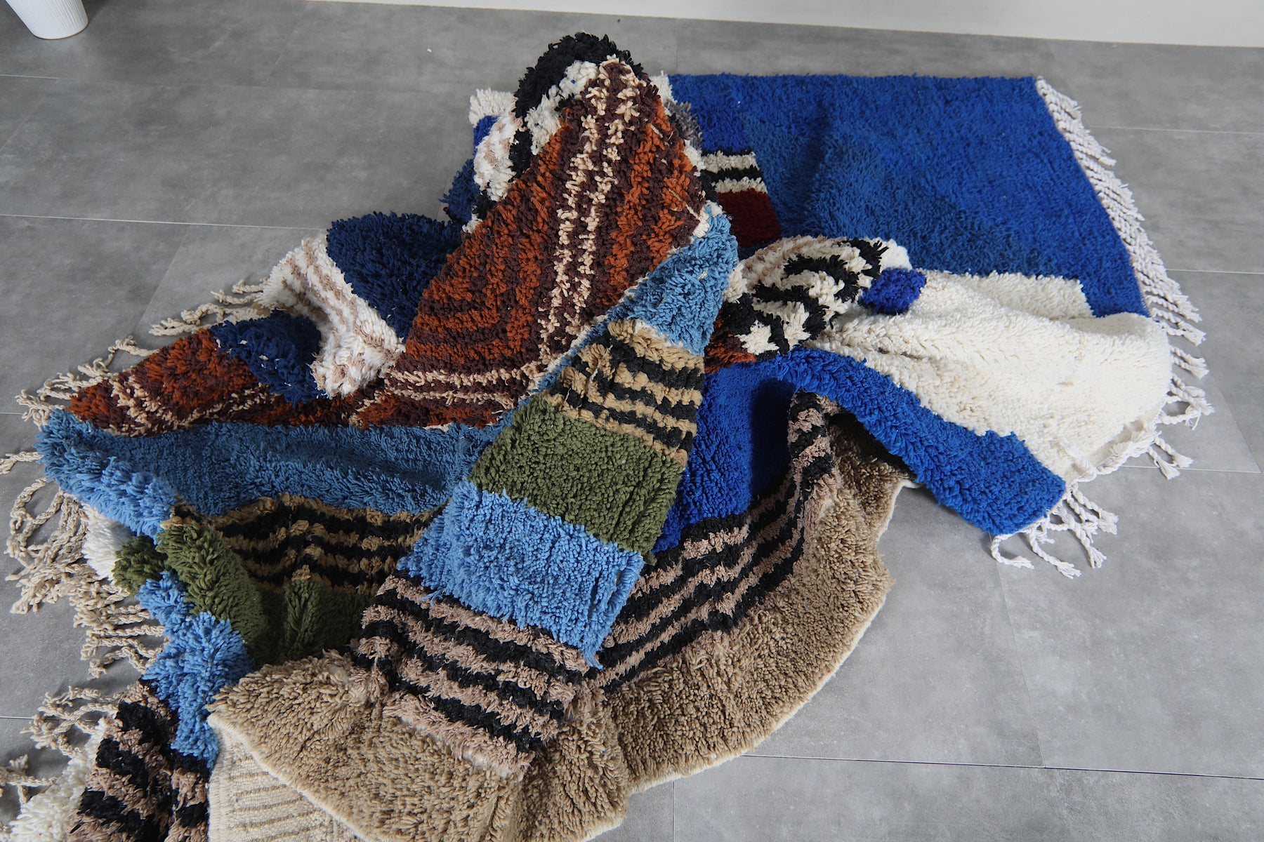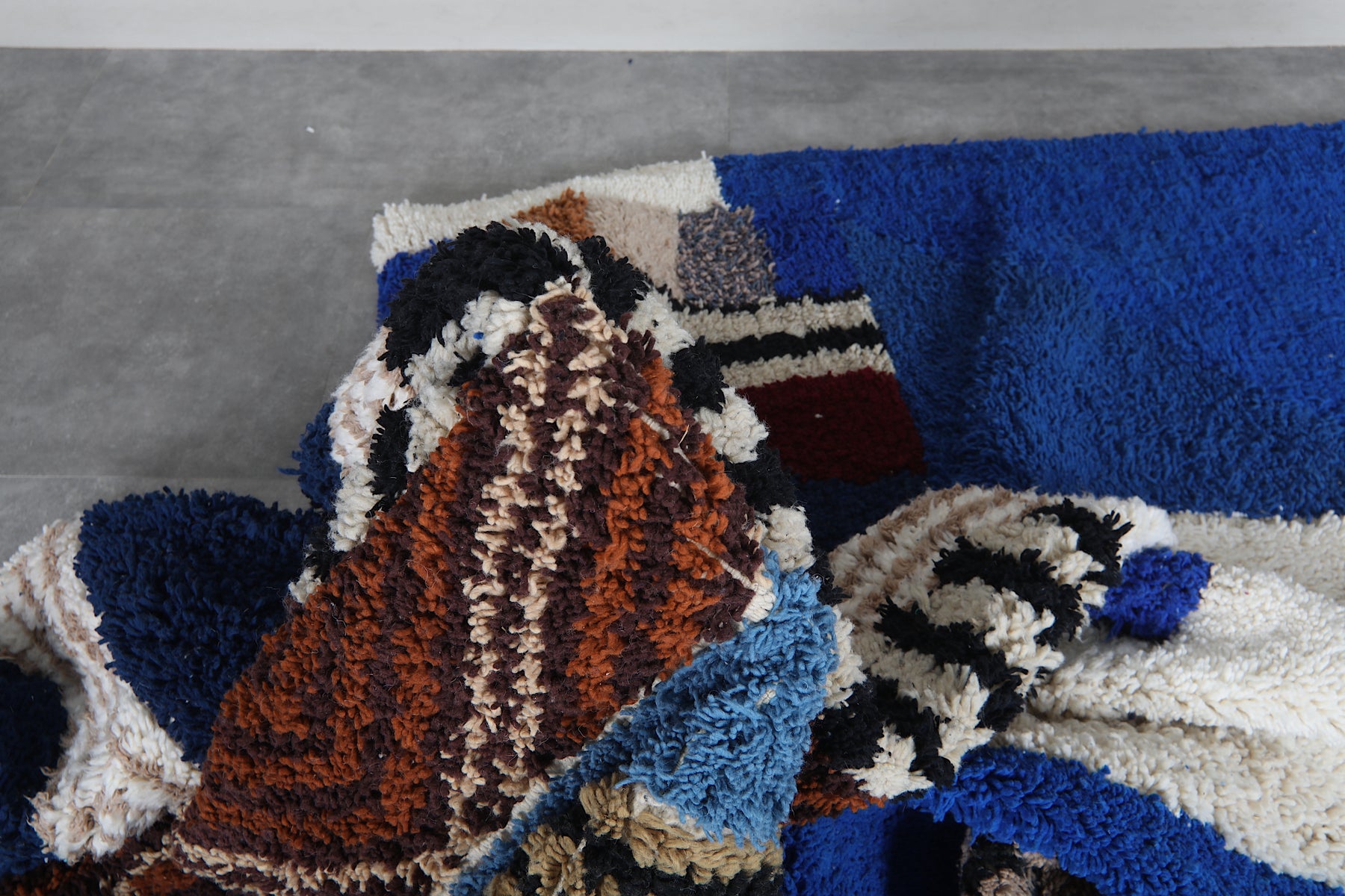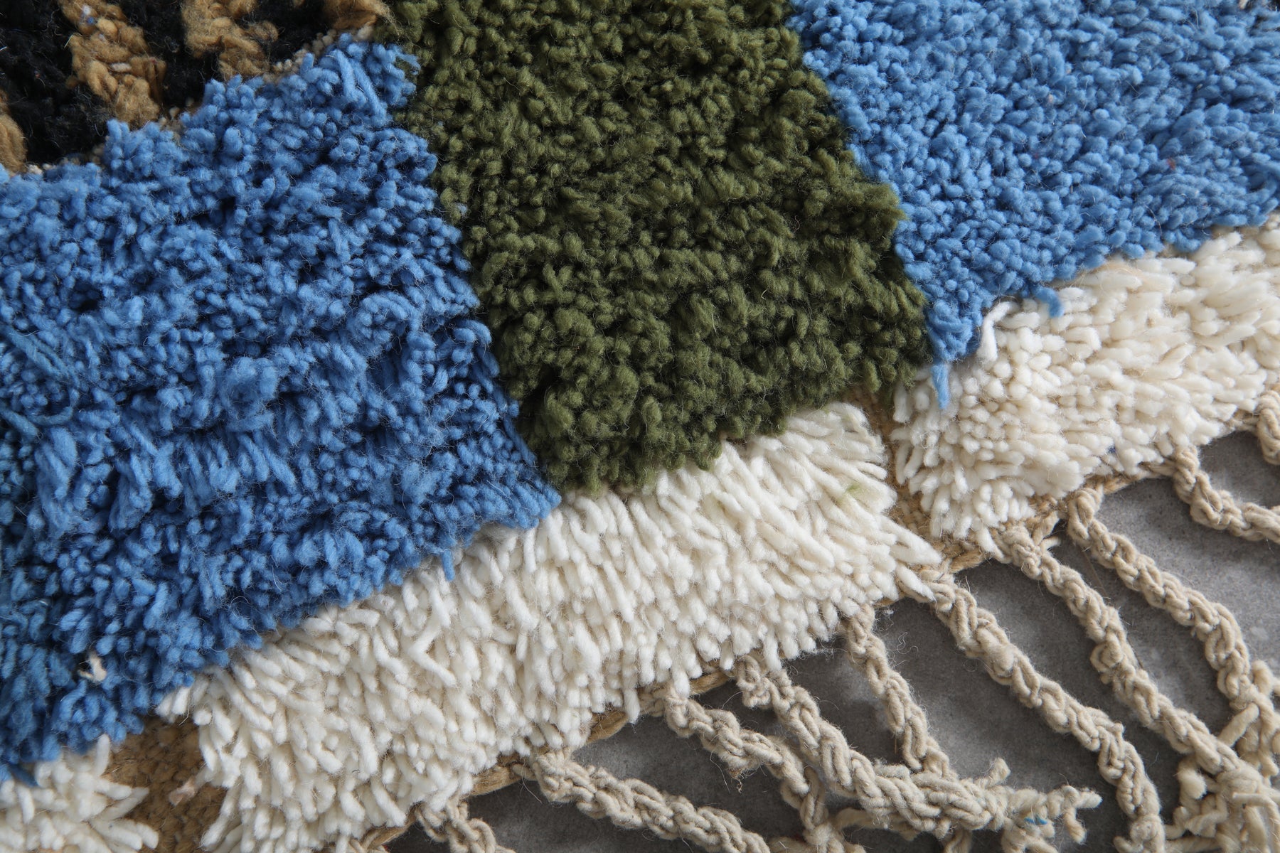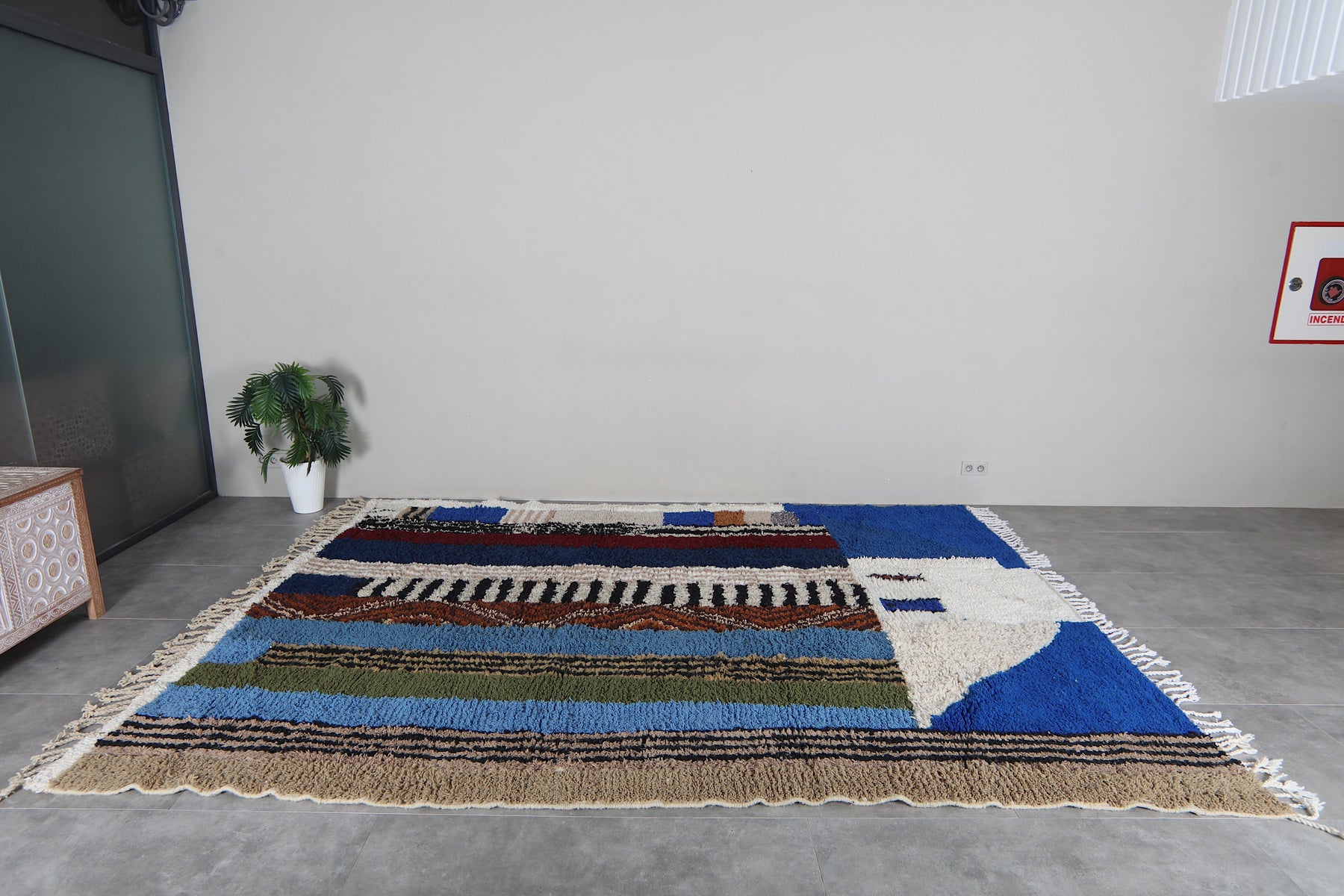 This 8.9 x 12 feet Beni Ourain rug features a striking composition built around deep blue fields and a dynamic sequence of vertical bands in ivory, black, rust, soft beige, olive green, and muted sky tones. The design blends bold geometry with intricate Berber motifs—alternating between clean stripes, textured lines, and subtle zigzag patterns that bring rhythm and movement across the surface. The upper section introduces a structured ivory shape that contrasts beautifully against the rich blue background, giving the rug a modern architectural presence.