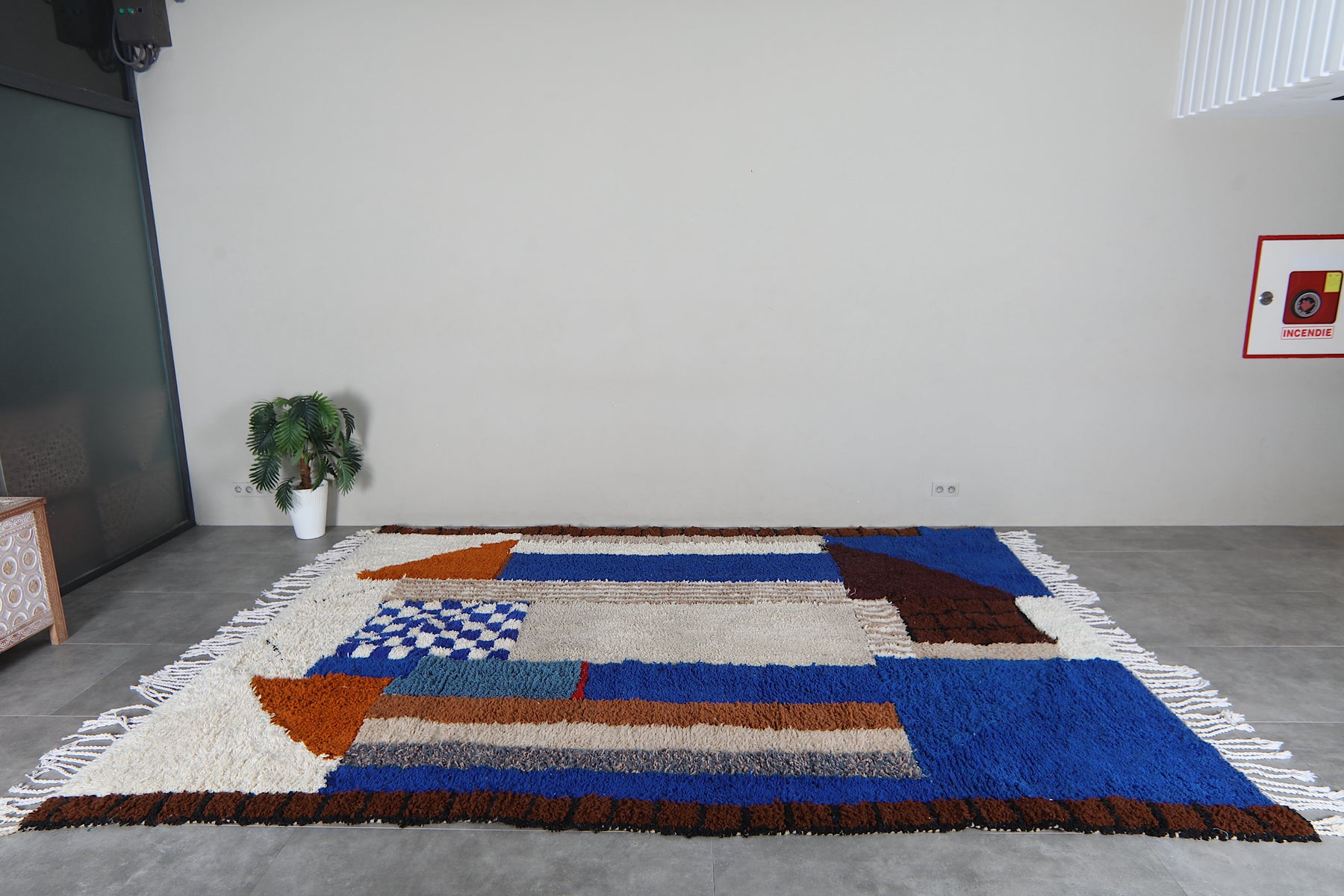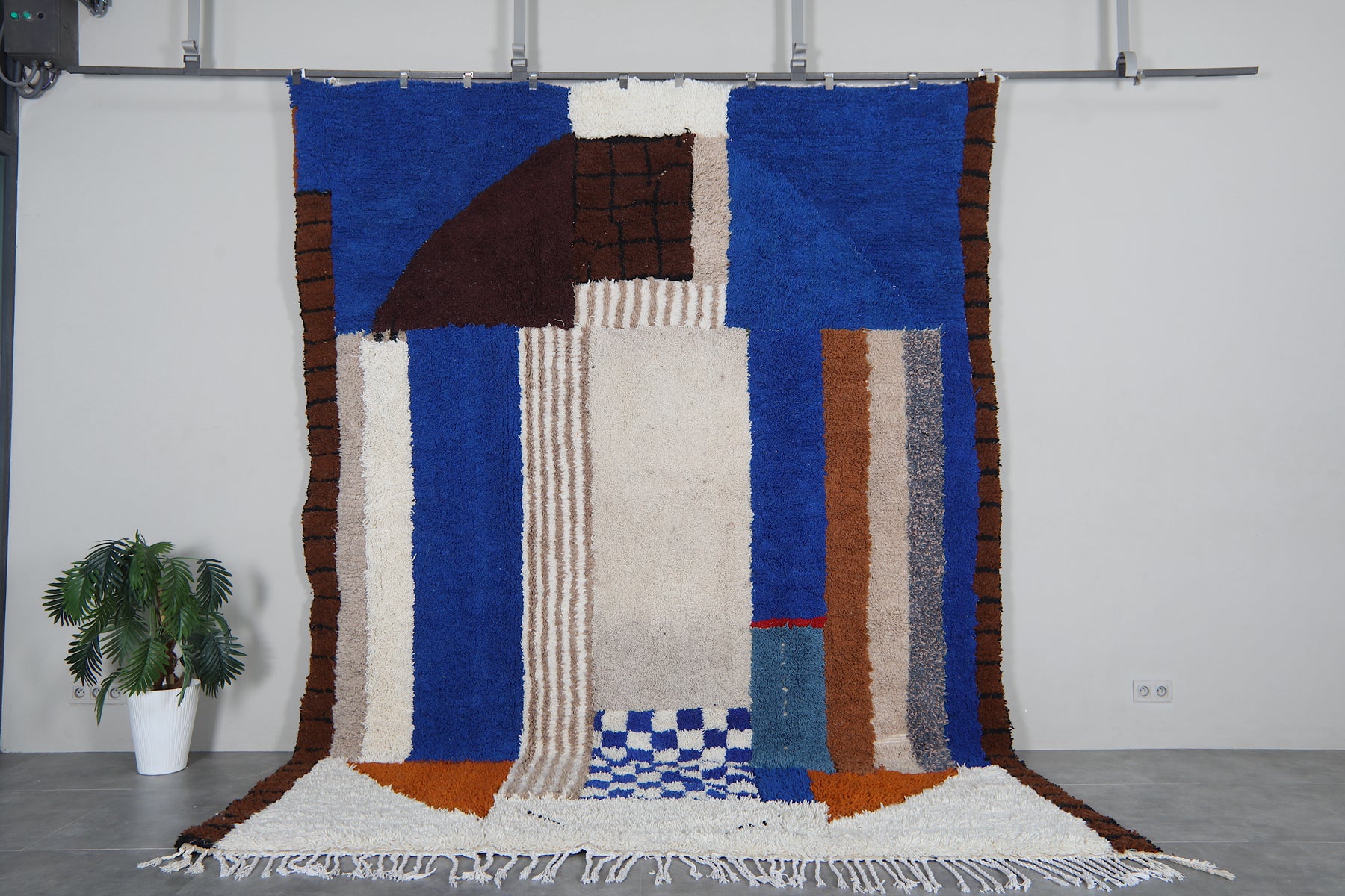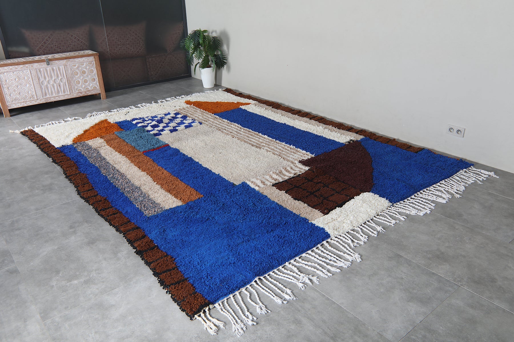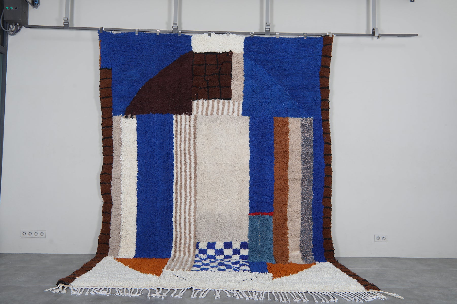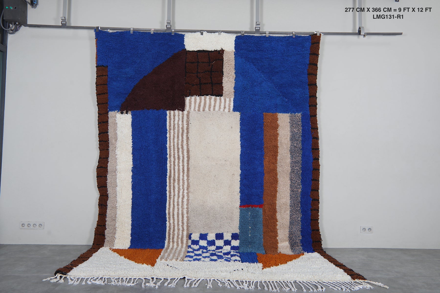 This 9 x 12 feet Beni Ourain rug brings a bold architectural presence through its deep cobalt blue background contrasted with warm earthy tones and soft ivory accents. The composition blends structured geometry with organic Berber expression—featuring layered blocks, subtle linear textures, and a central ivory field that grounds the design. Hints of rust, brown, and muted grey add warmth and depth, while the checker detail at the base introduces a playful yet balanced finish.