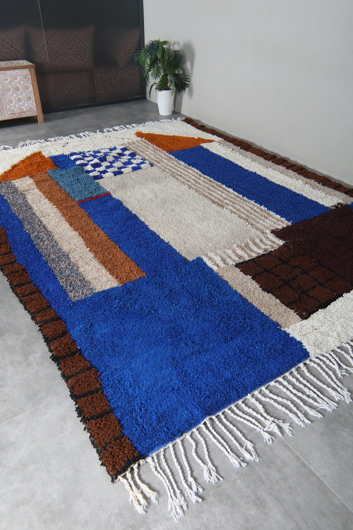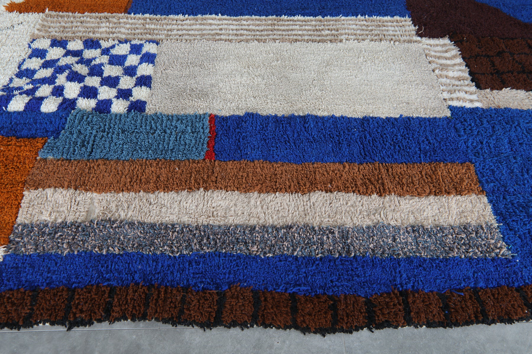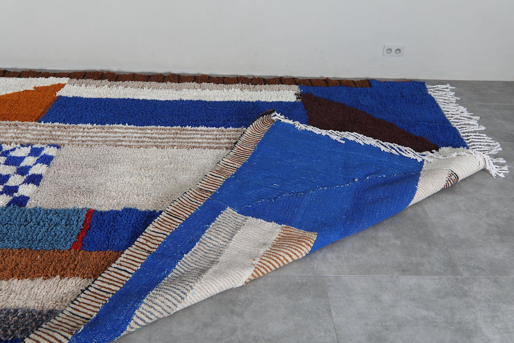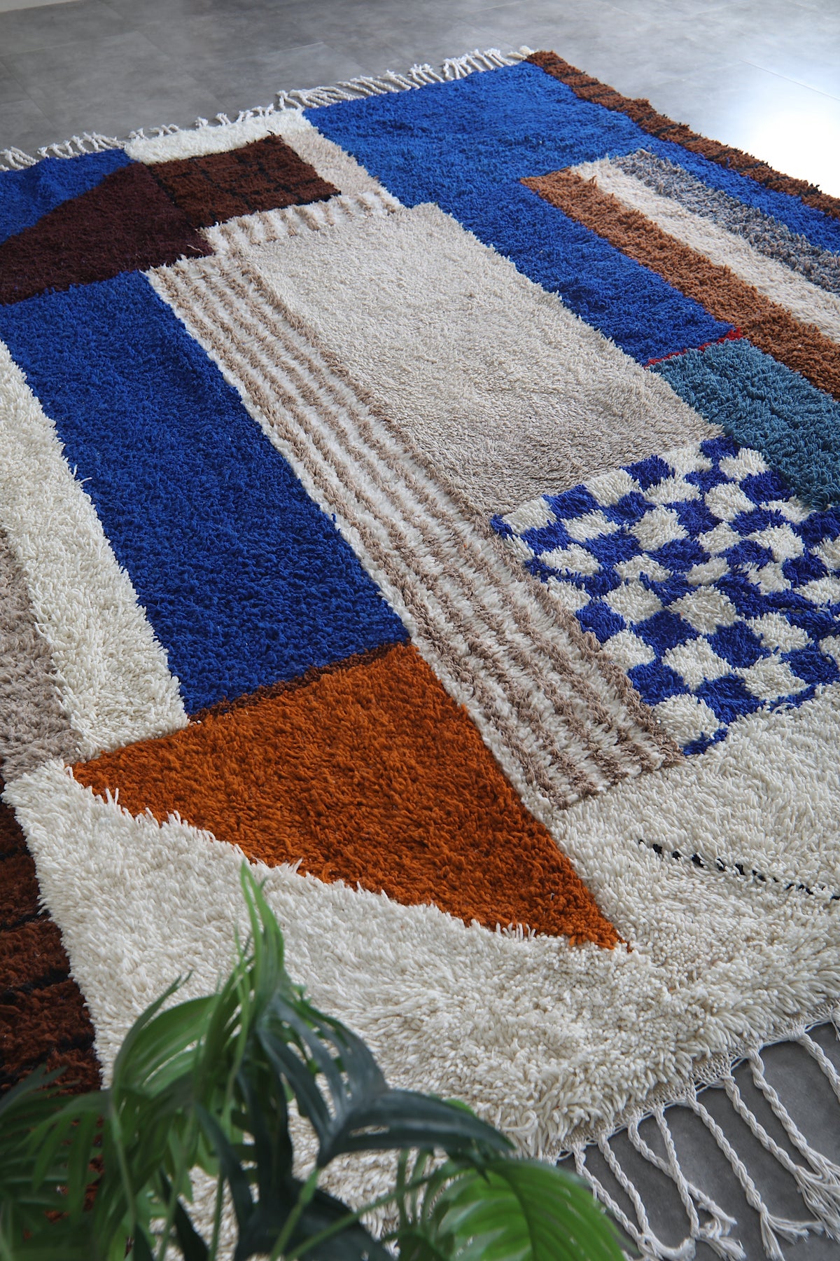 This 9 x 12 feet Beni Ourain rug brings a bold architectural presence through its deep cobalt blue background contrasted with warm earthy tones and soft ivory accents. The composition blends structured geometry with organic Berber expression—featuring layered blocks, subtle linear textures, and a central ivory field that grounds the design. Hints of rust, brown, and muted grey add warmth and depth, while the checker detail at the base introduces a playful yet balanced finish.
