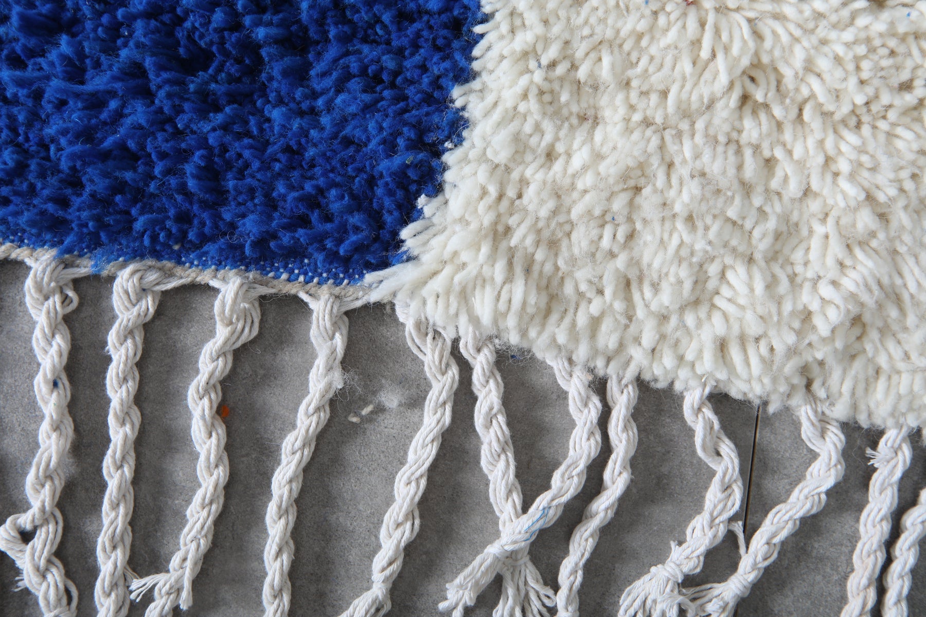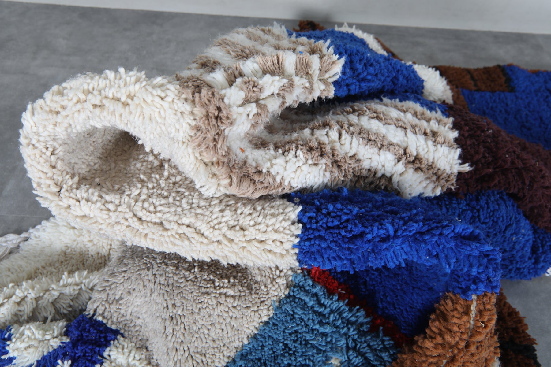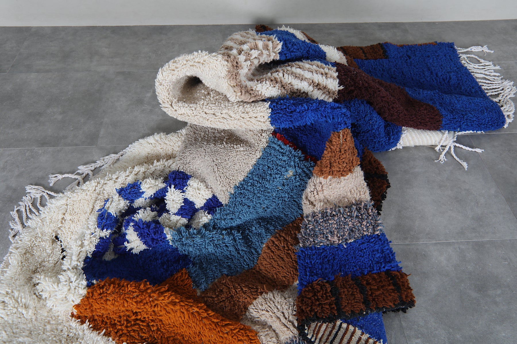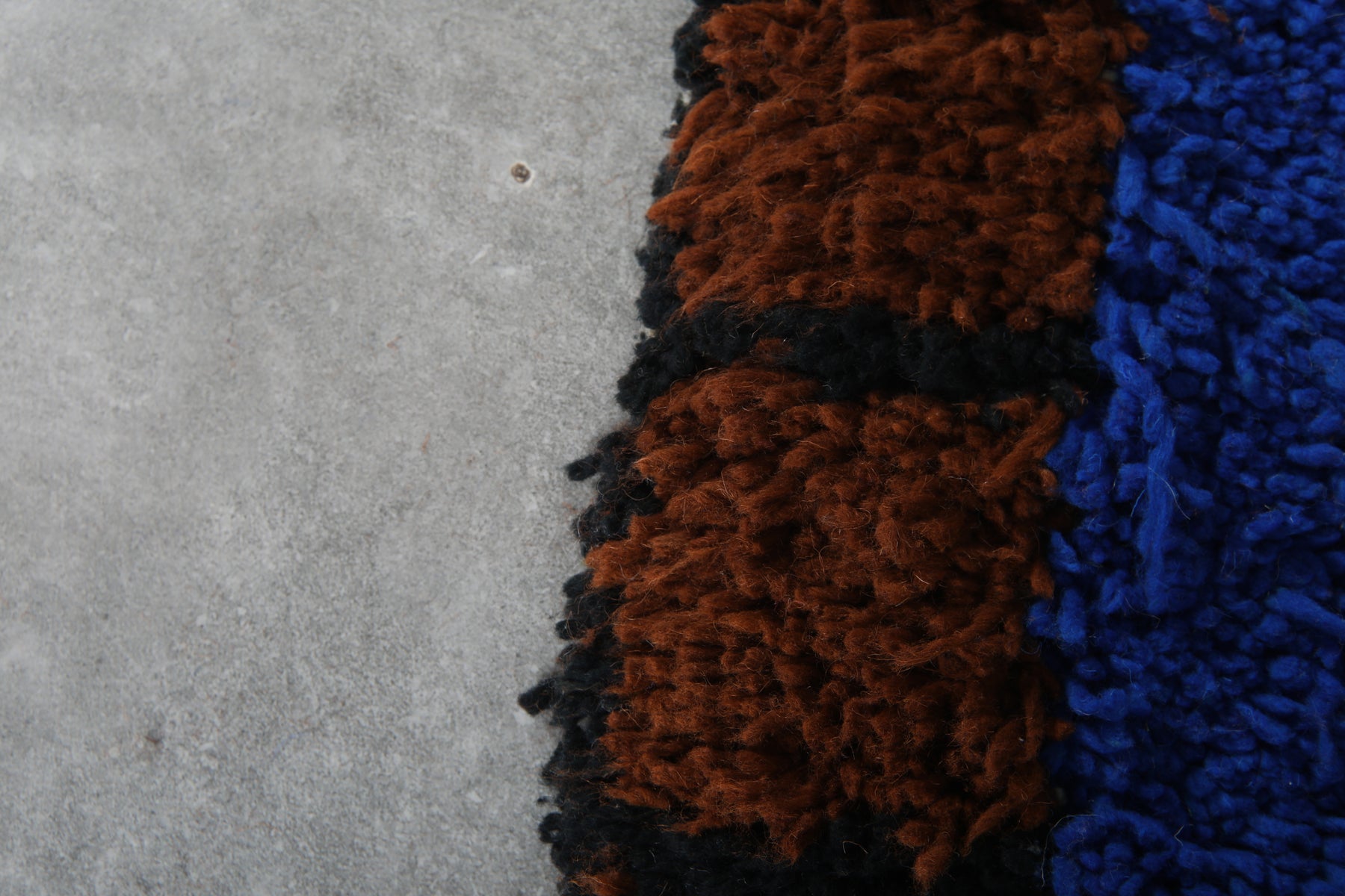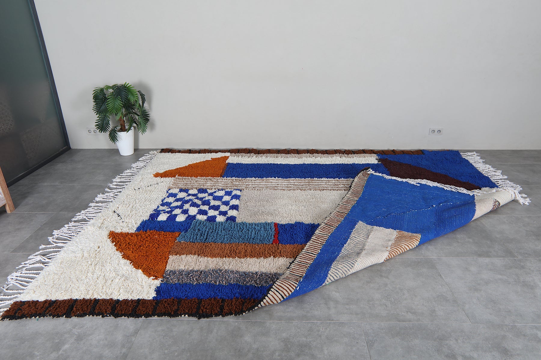 This 9 x 12 feet Beni Ourain rug brings a bold architectural presence through its deep cobalt blue background contrasted with warm earthy tones and soft ivory accents. The composition blends structured geometry with organic Berber expression—featuring layered blocks, subtle linear textures, and a central ivory field that grounds the design. Hints of rust, brown, and muted grey add warmth and depth, while the checker detail at the base introduces a playful yet balanced finish.