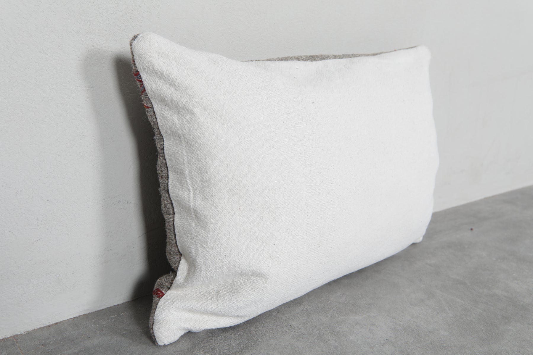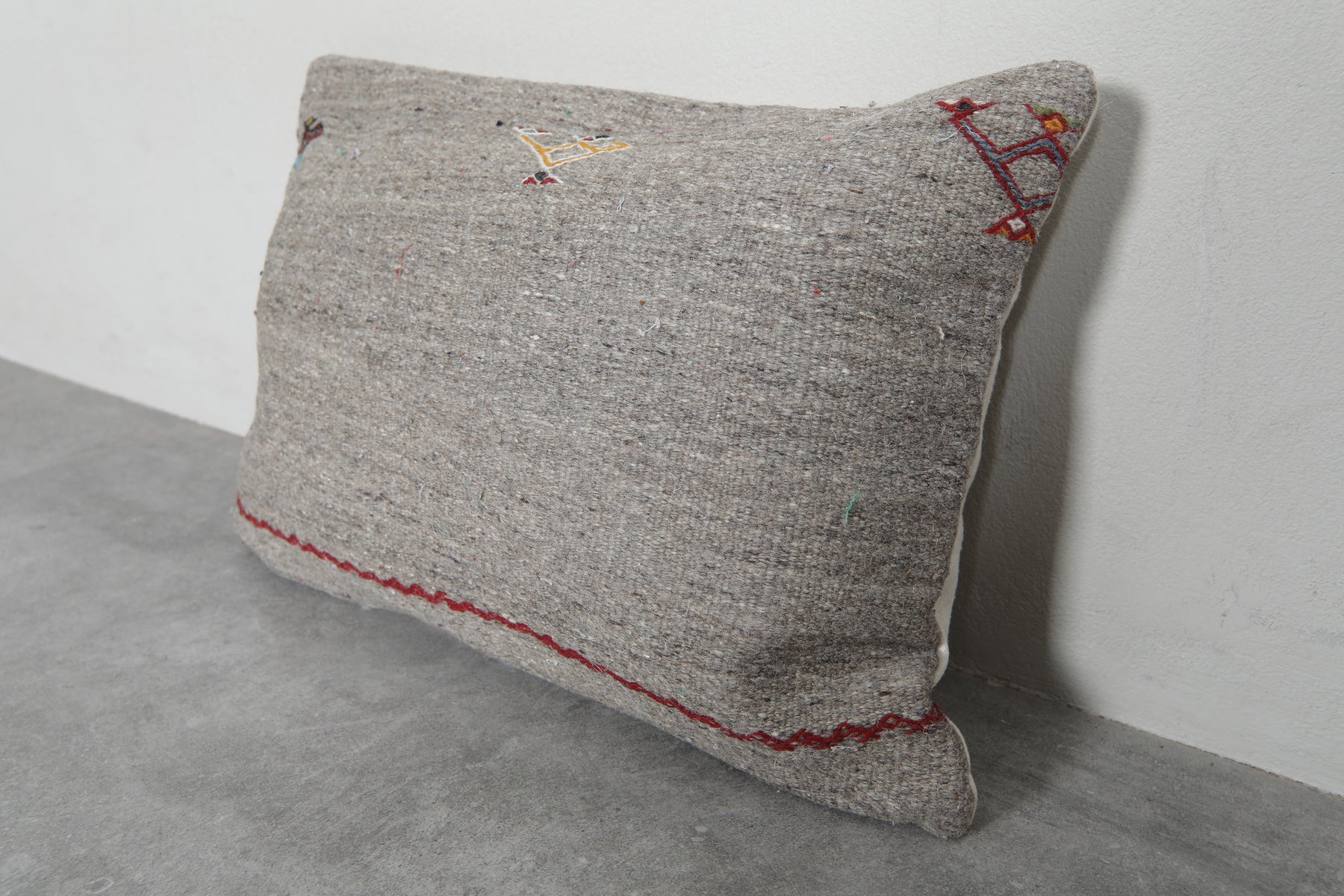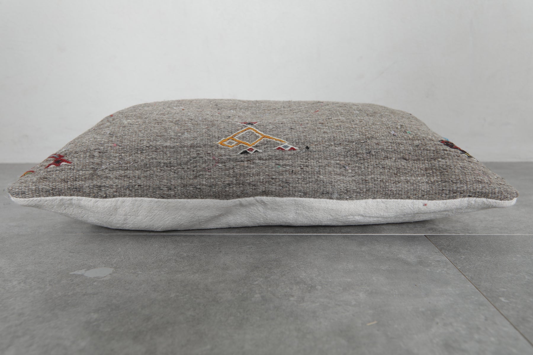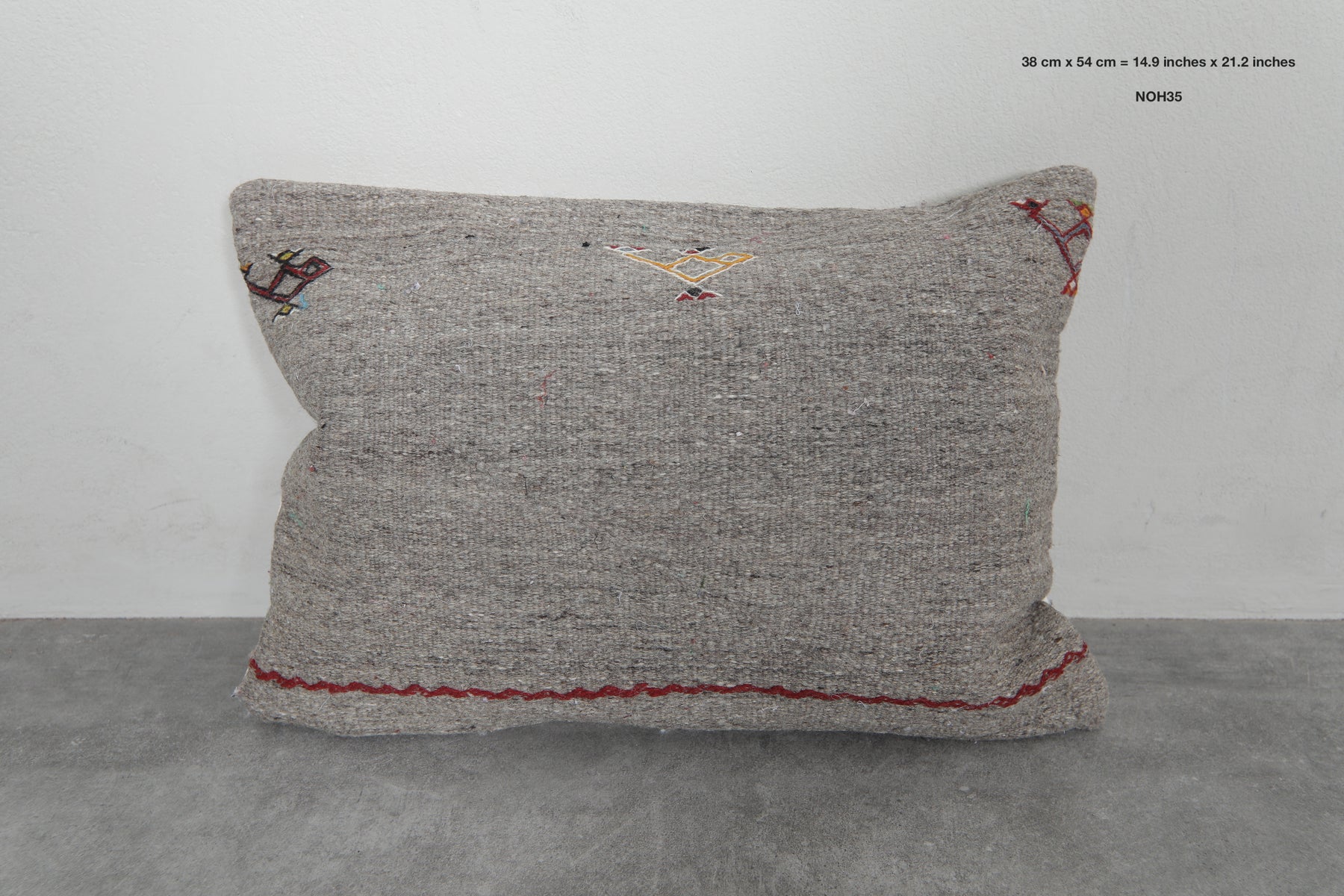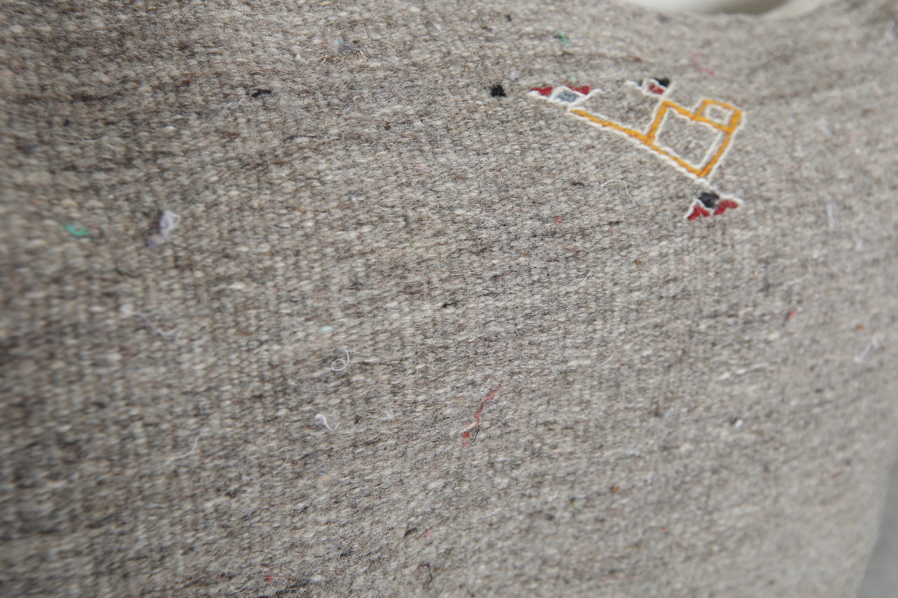 Elevate your decor with this minimalist Moroccan pillow in a neutral gray tone, featuring subtle hand-embroidered accents in red, yellow, and blue. Perfect for adding understated elegance to modern, rustic, or bohemian spaces. A versatile piece for sofas, chairs, or beds. Dimensions: 14.9 x 21.2 inches.